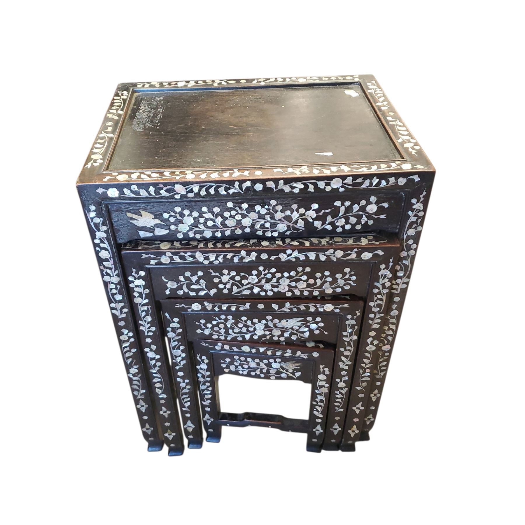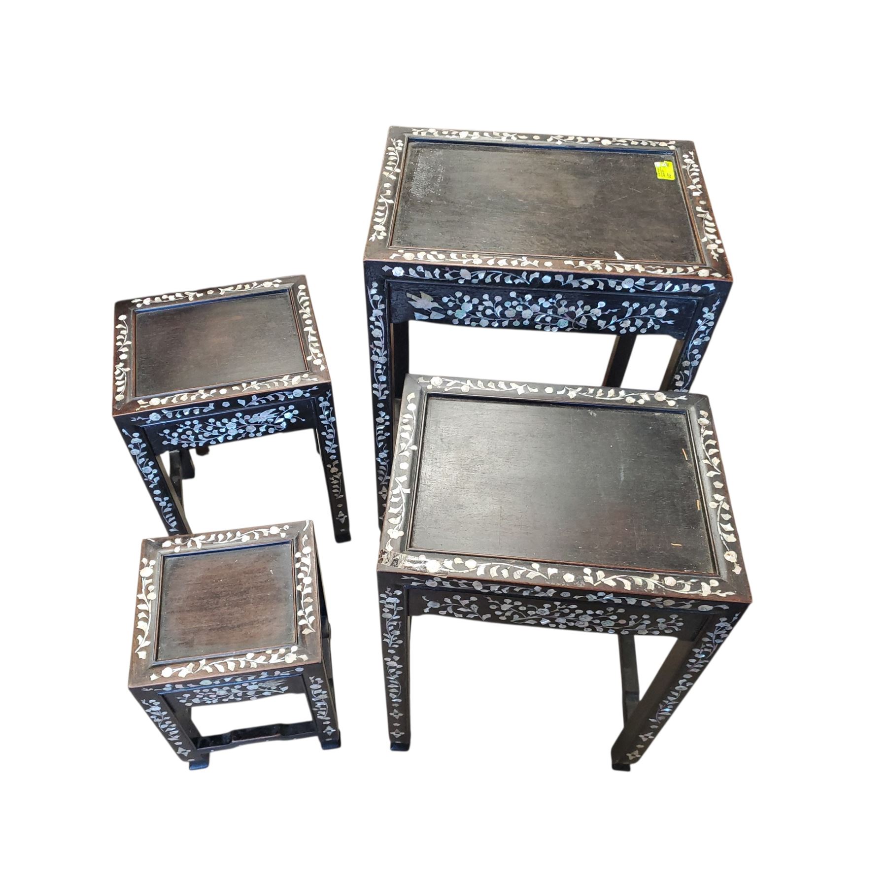 Set of four Chinoisserre Chinese nesting tables featuring intricate mother of pearl inlay designs. Tables measure 19x14x27-Inch. Each table nests perfectly into the next for compact storage. Ornate craftsmanship and traditional styling evident in decorative details. Item is as pictured.