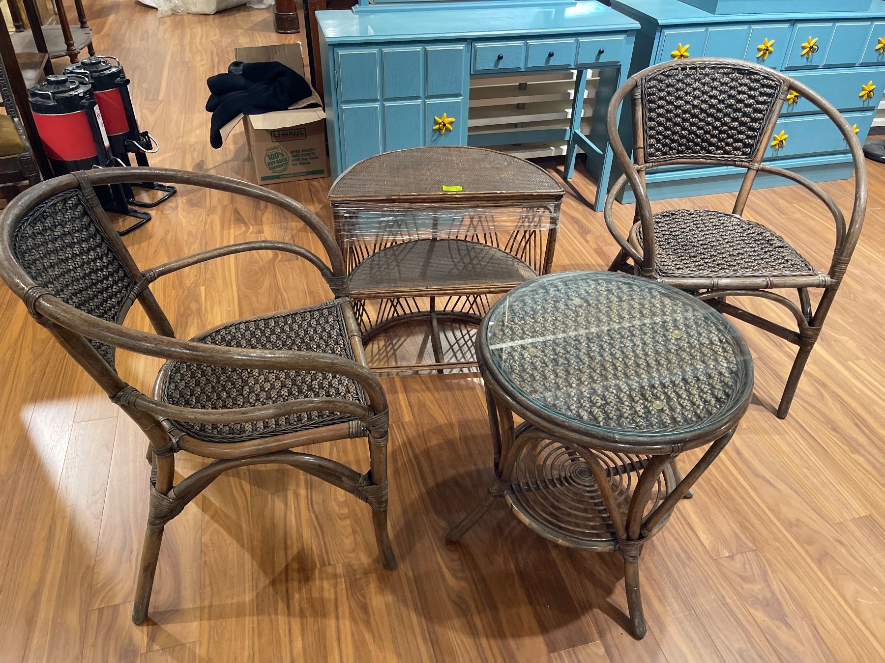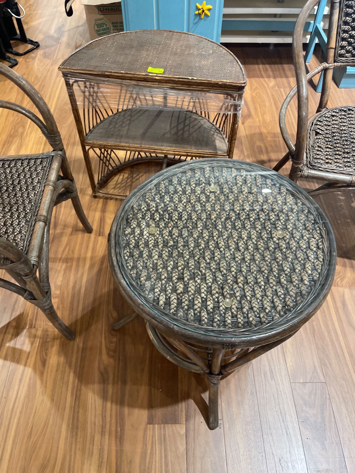 4 Piece Lot of Rattan Greenhouse Furniture (24" Glass Topped Table, 2 chairs and a half-moon shelf)