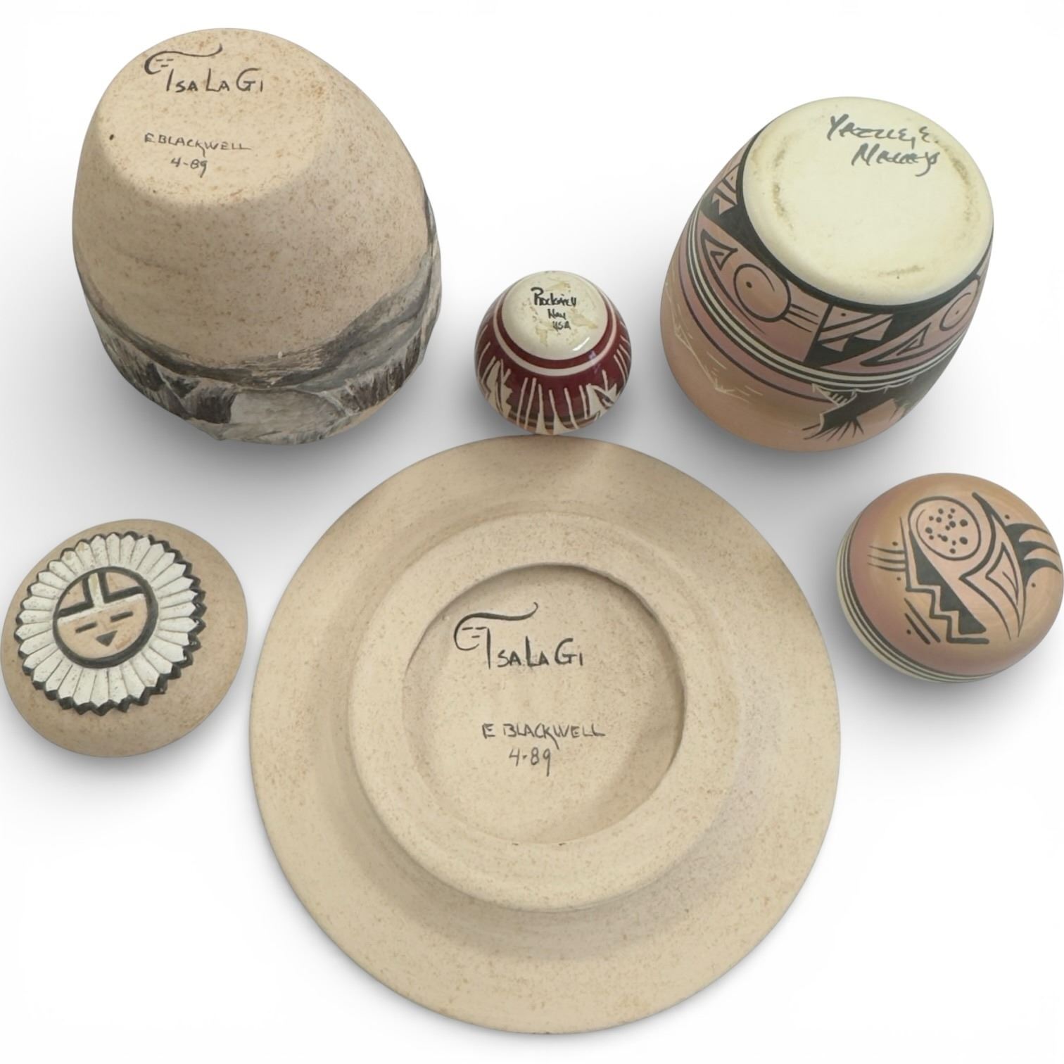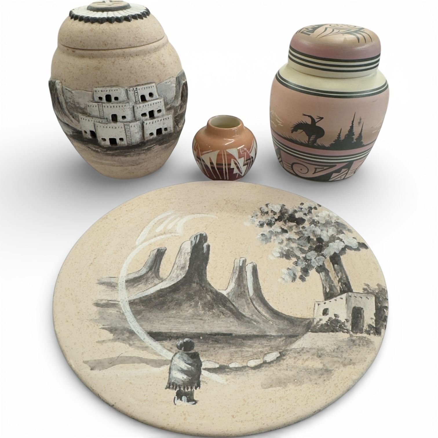 4 Pieces of Native American and Southwest-Style Pottery * The Plate is 9" diameter and the tallest lidded urn is 9"