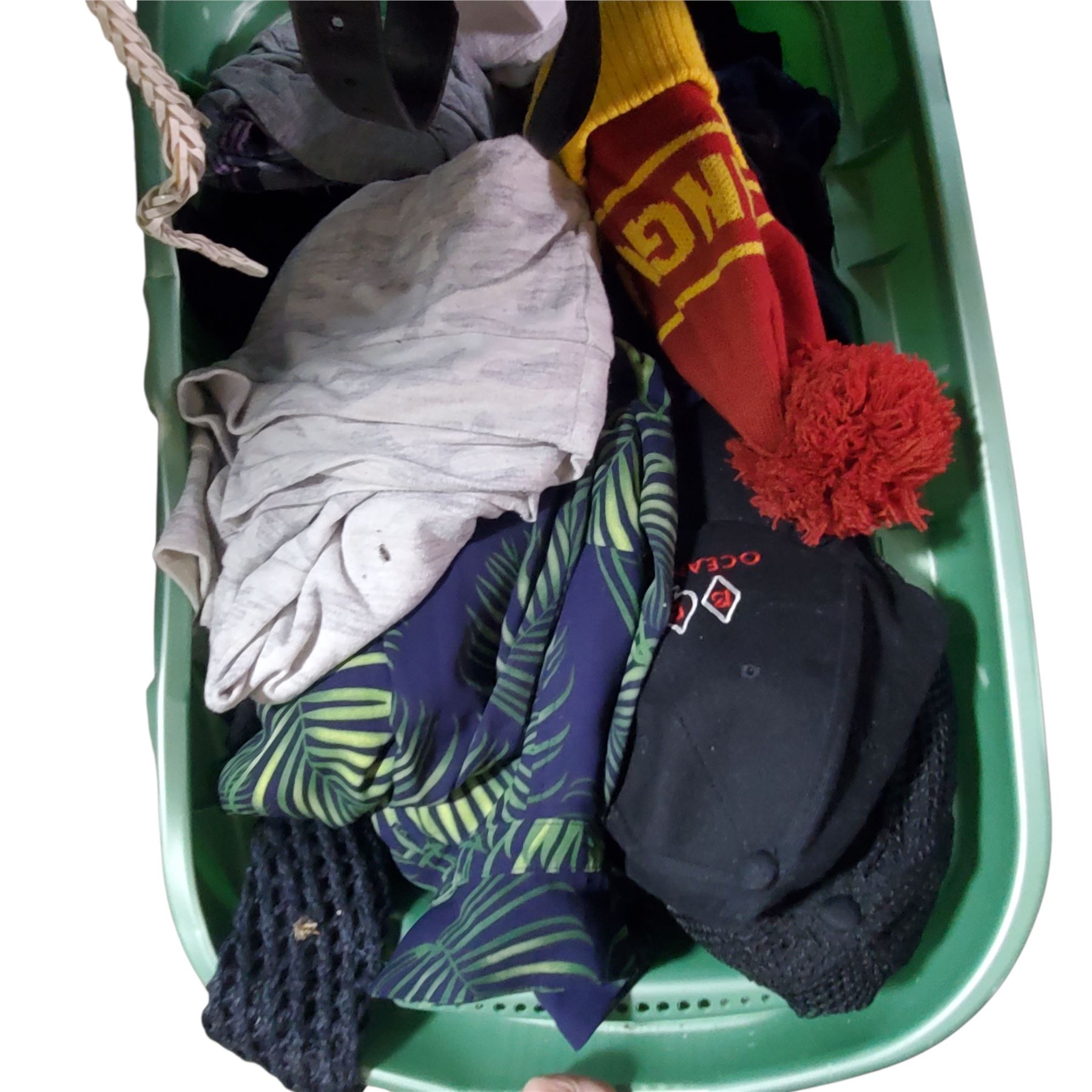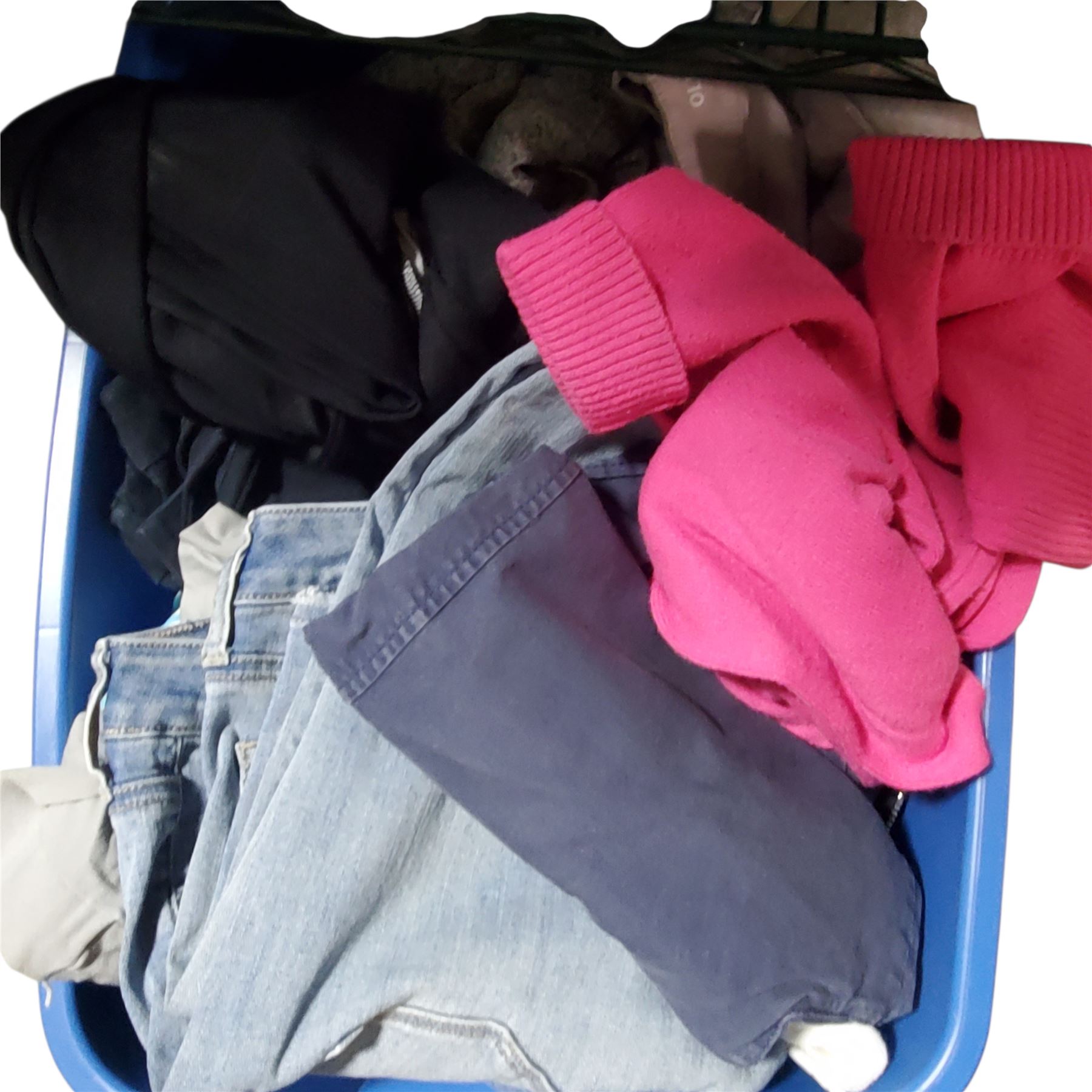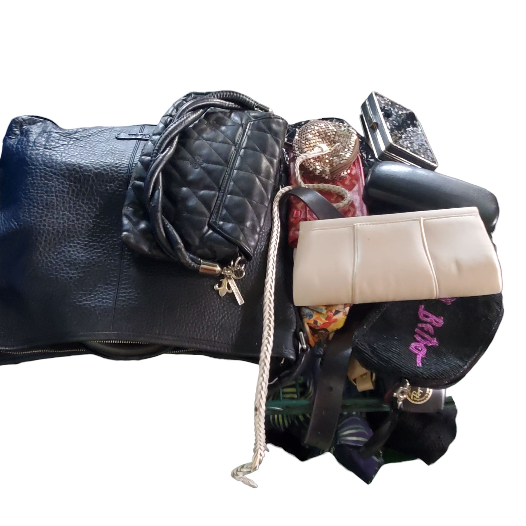 4 Shelves of Misc - Clothing, Purses, Suitcase, Etc.