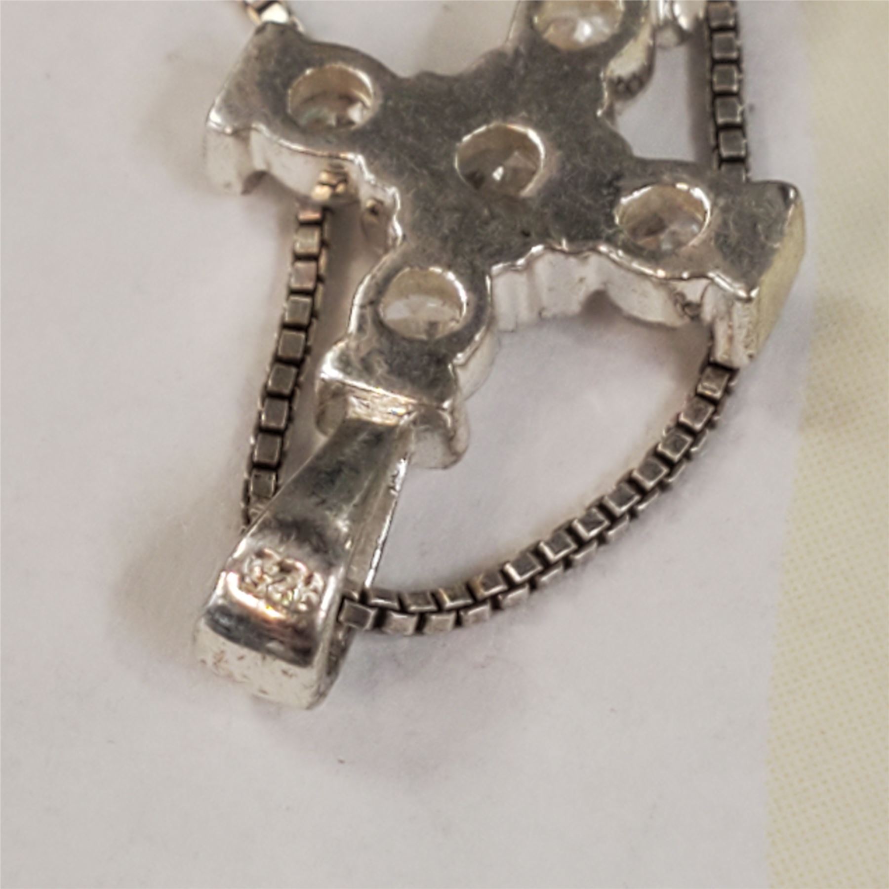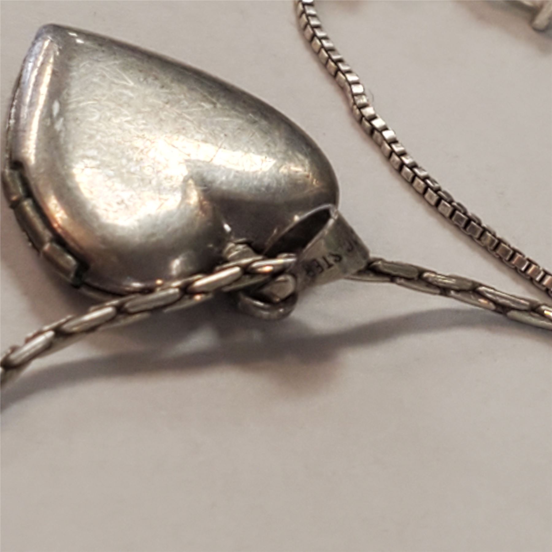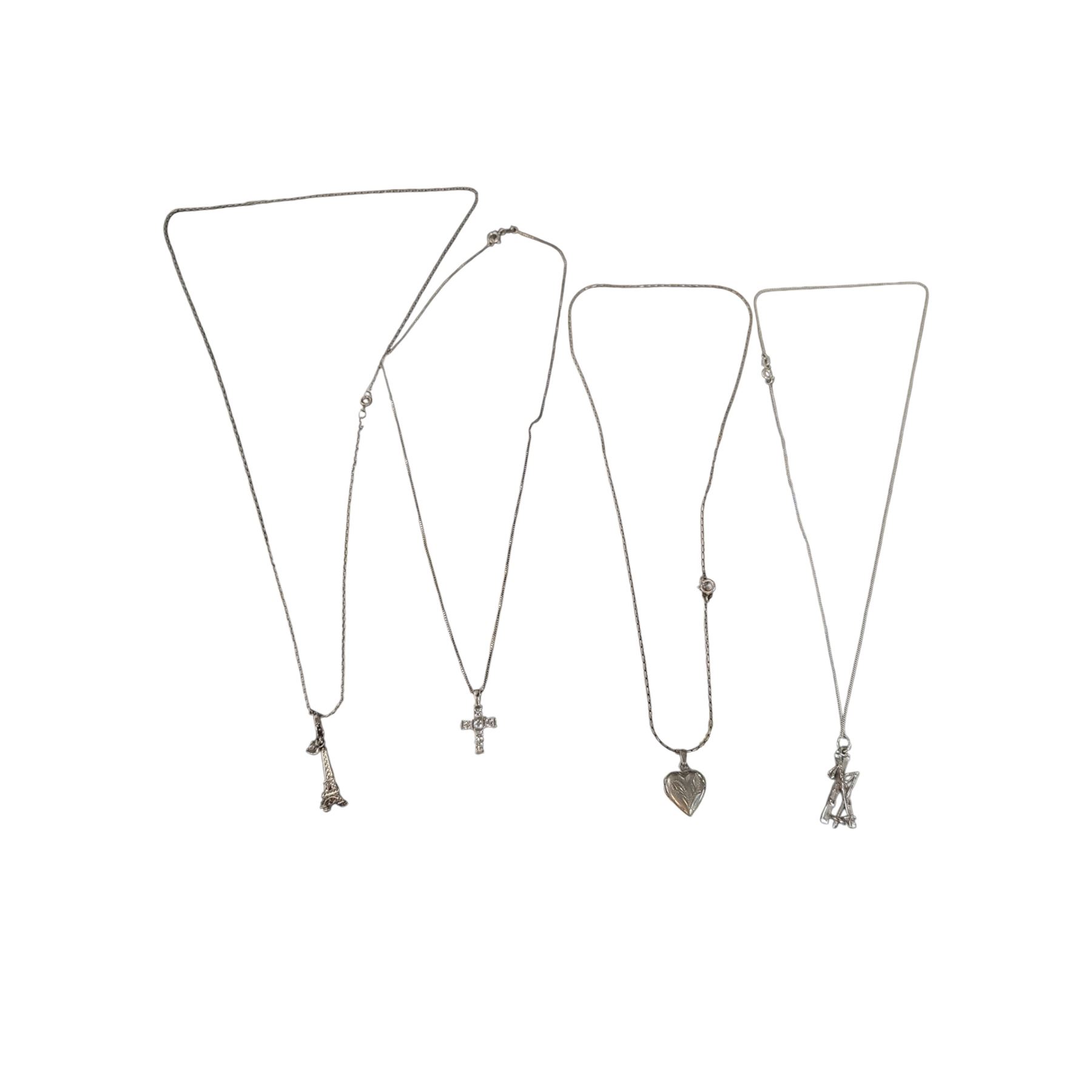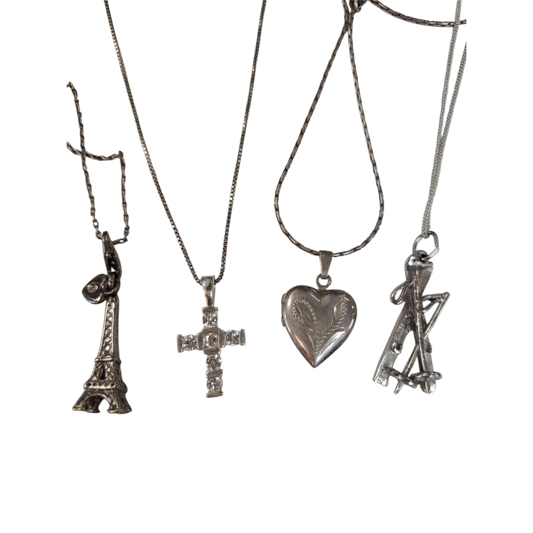 4 Sterling Silver Necklaces (Crystal embedded 1" cross, Skis with Poles, Eiffel Tower & Mini Heart Locket) * Total weight: 19 grams