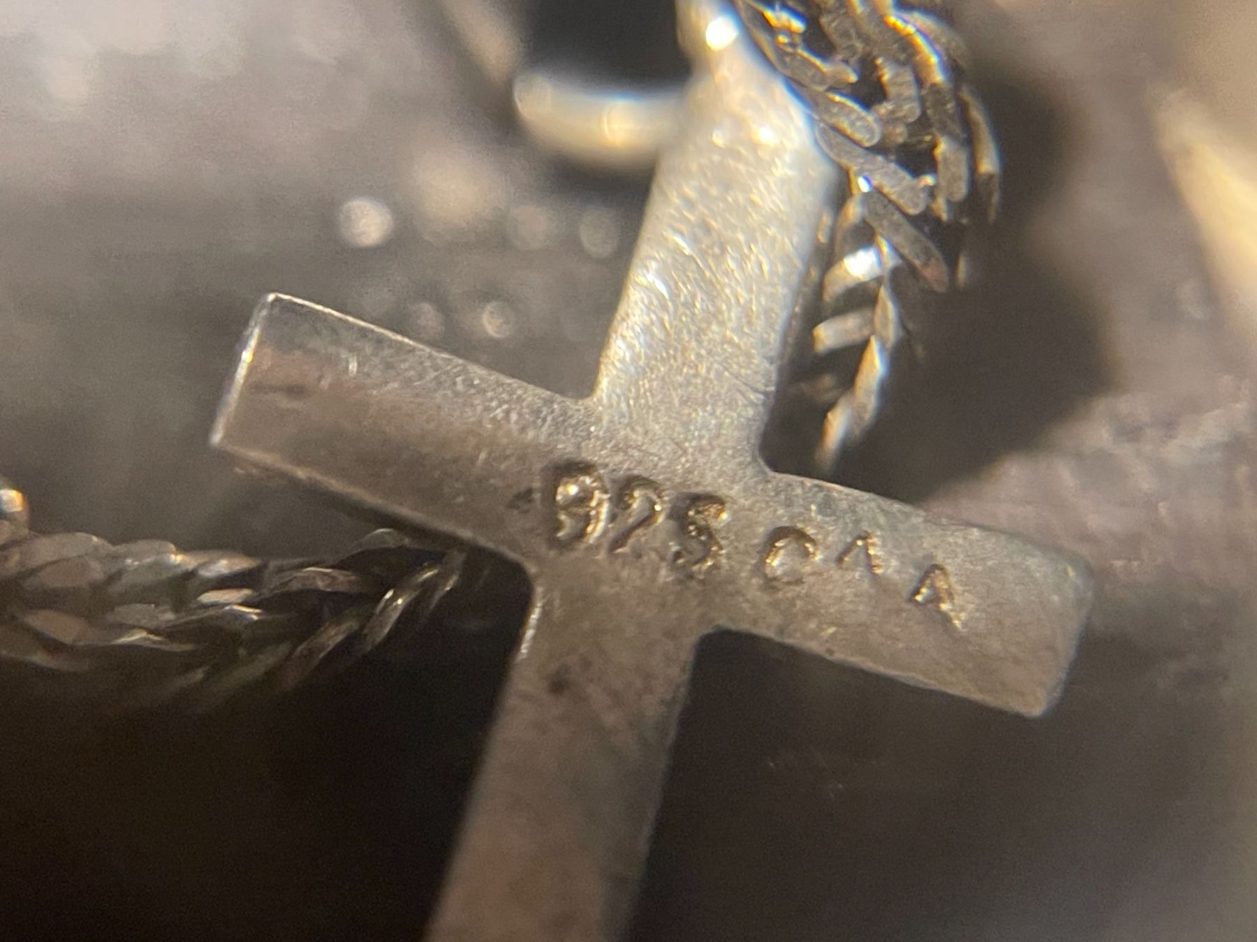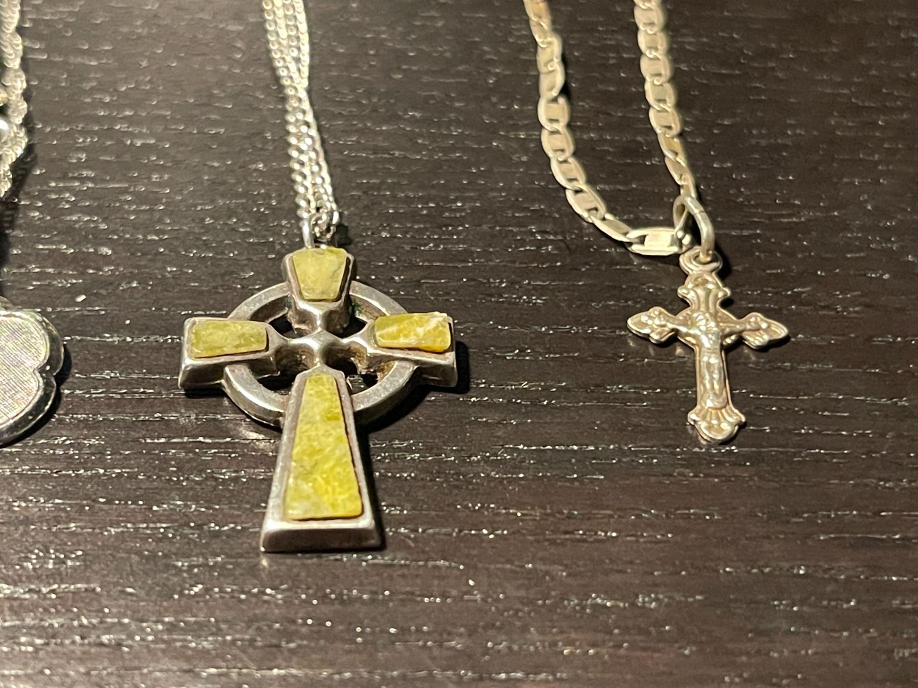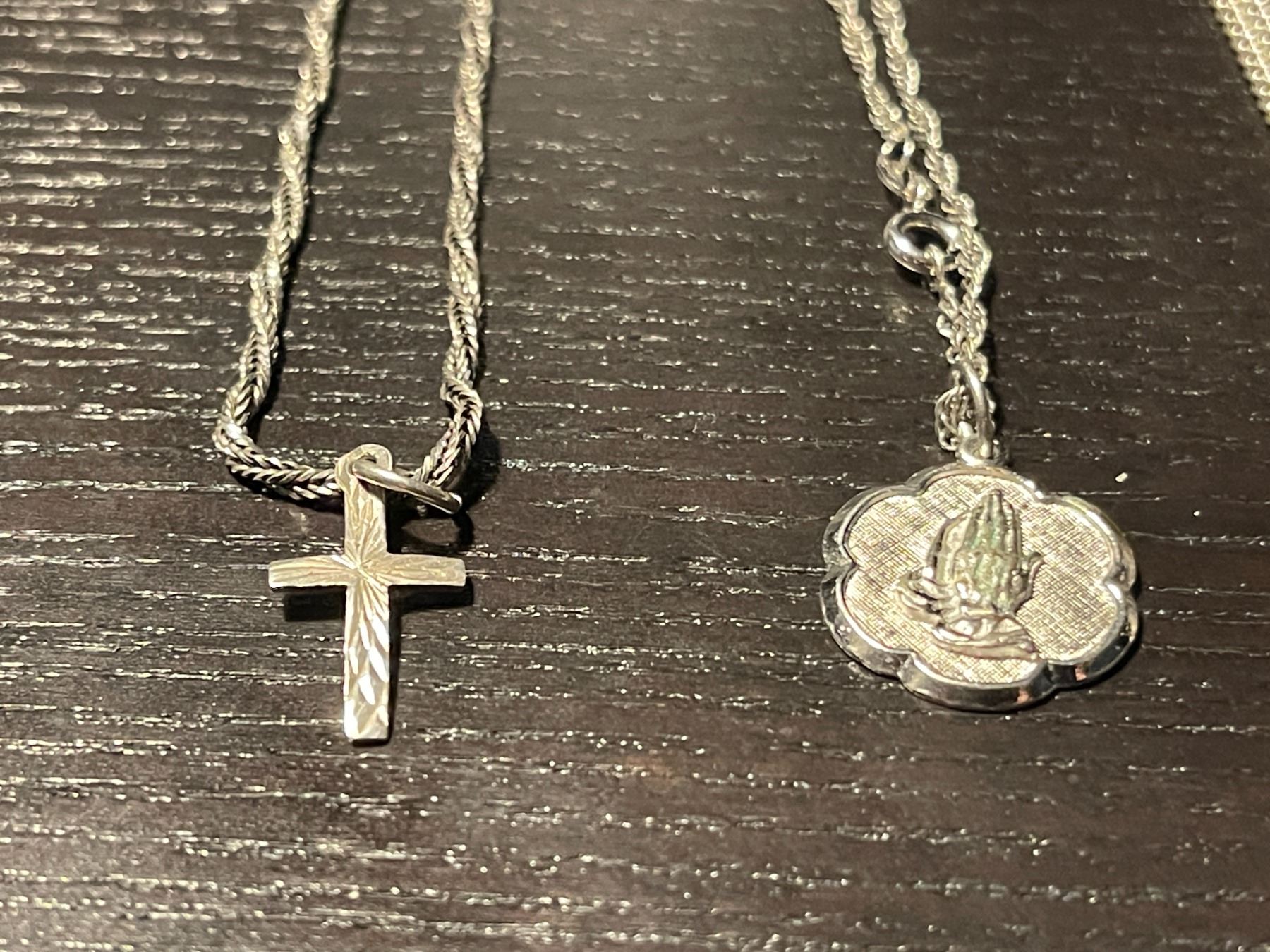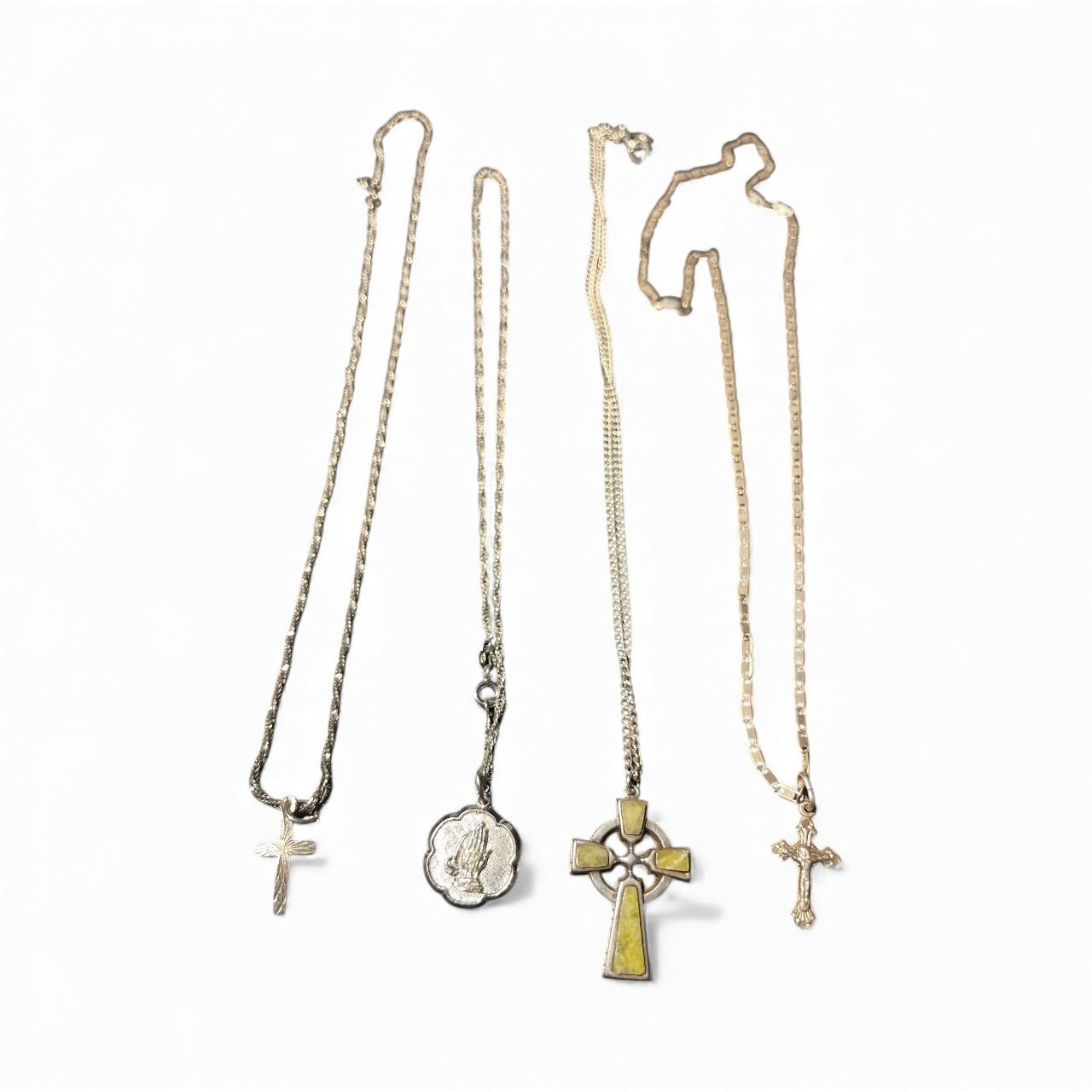 4 Sterling Silver Religious Themed Necklaces: Praying Hands, Celtic Cross and 2 Crosses - Total Weight: 25 grams
