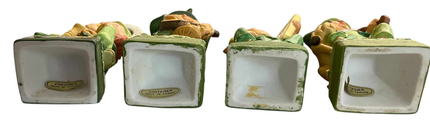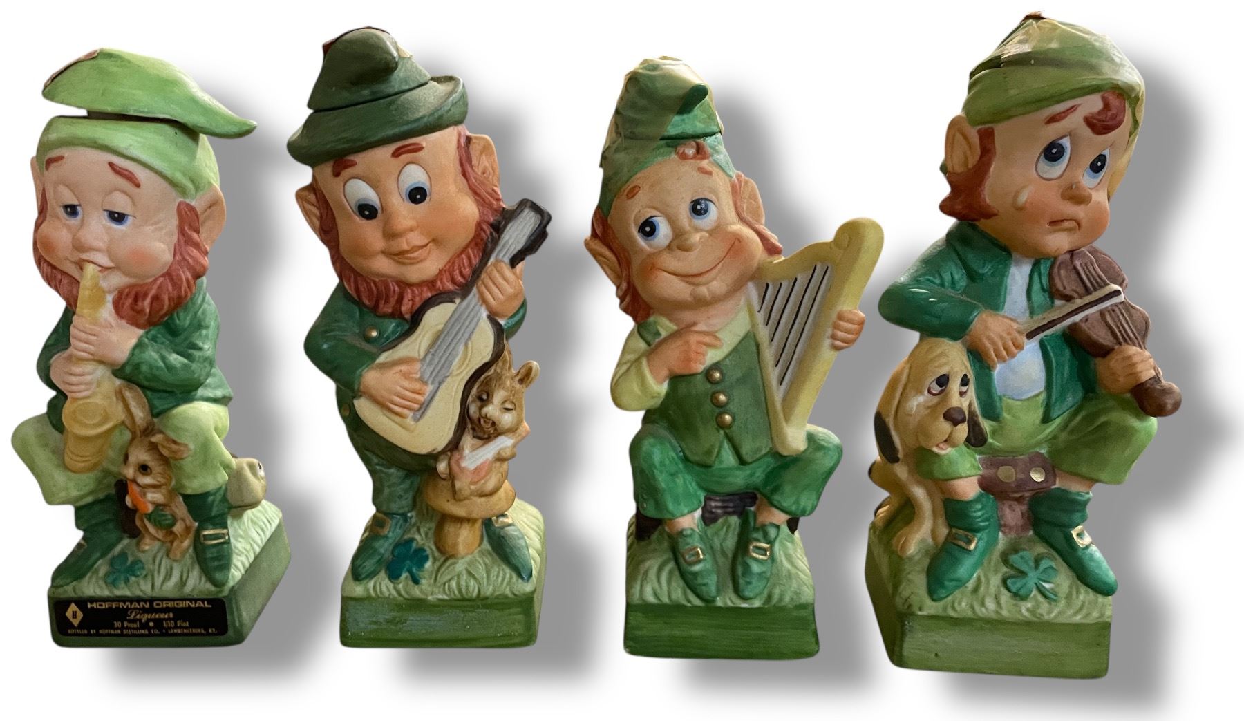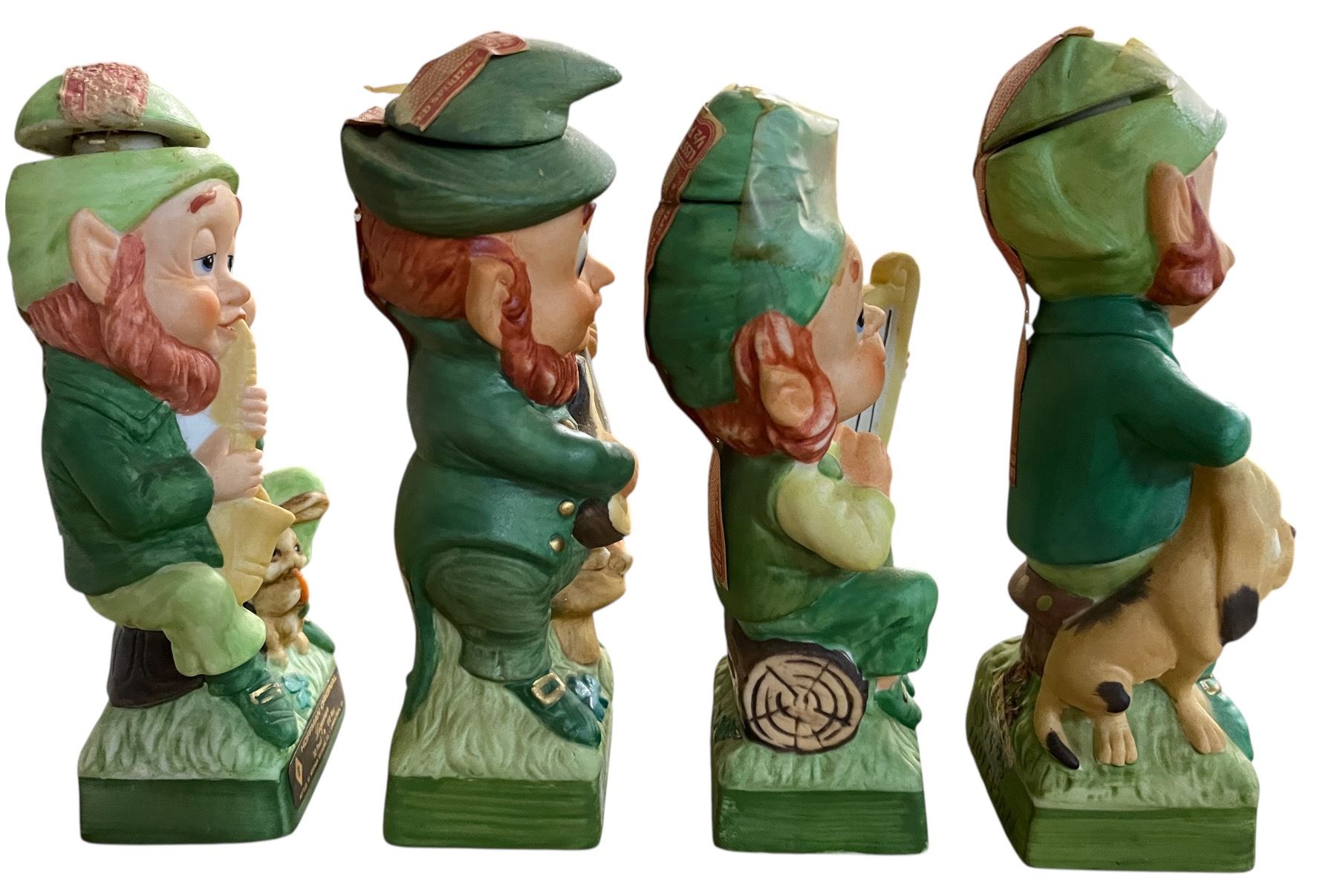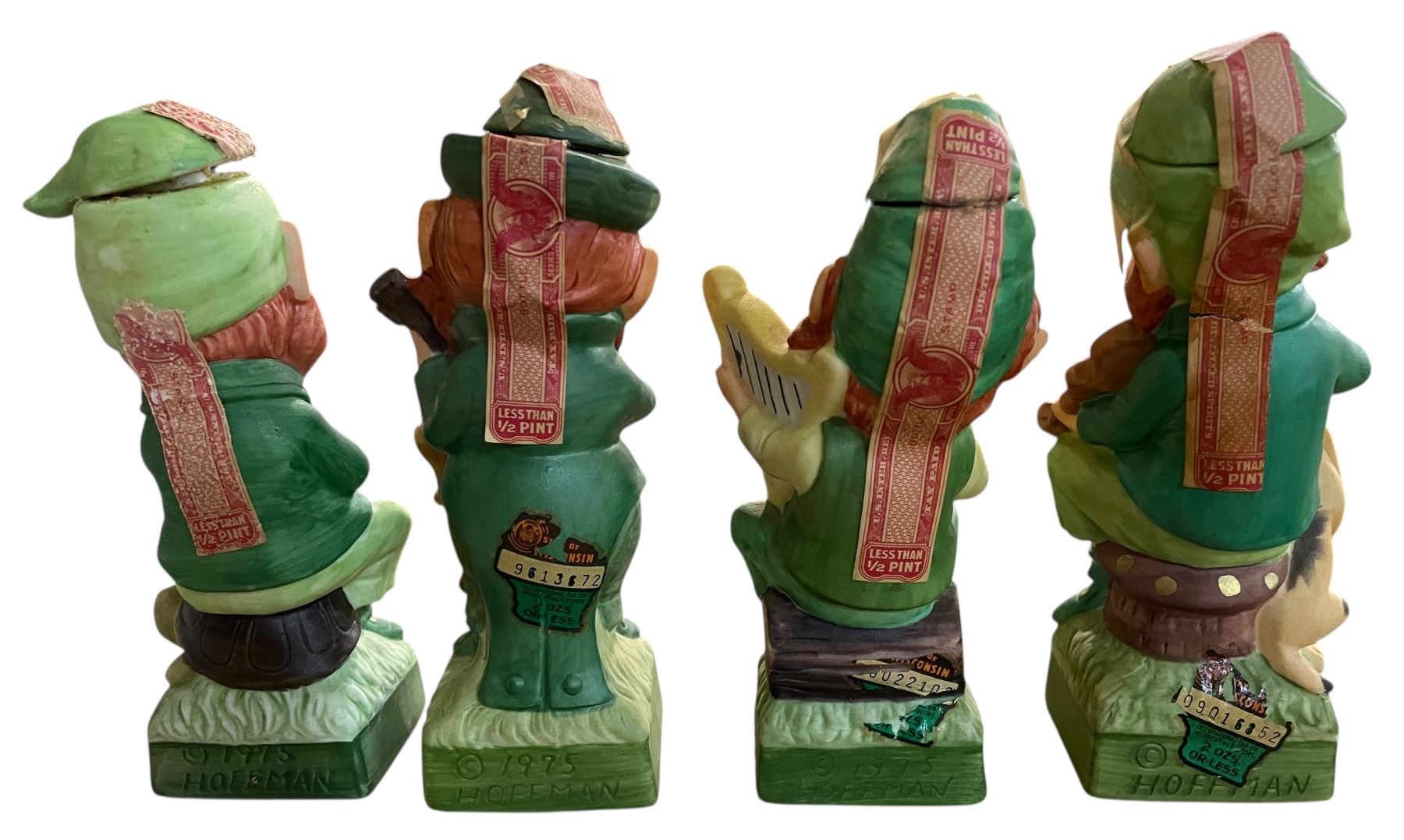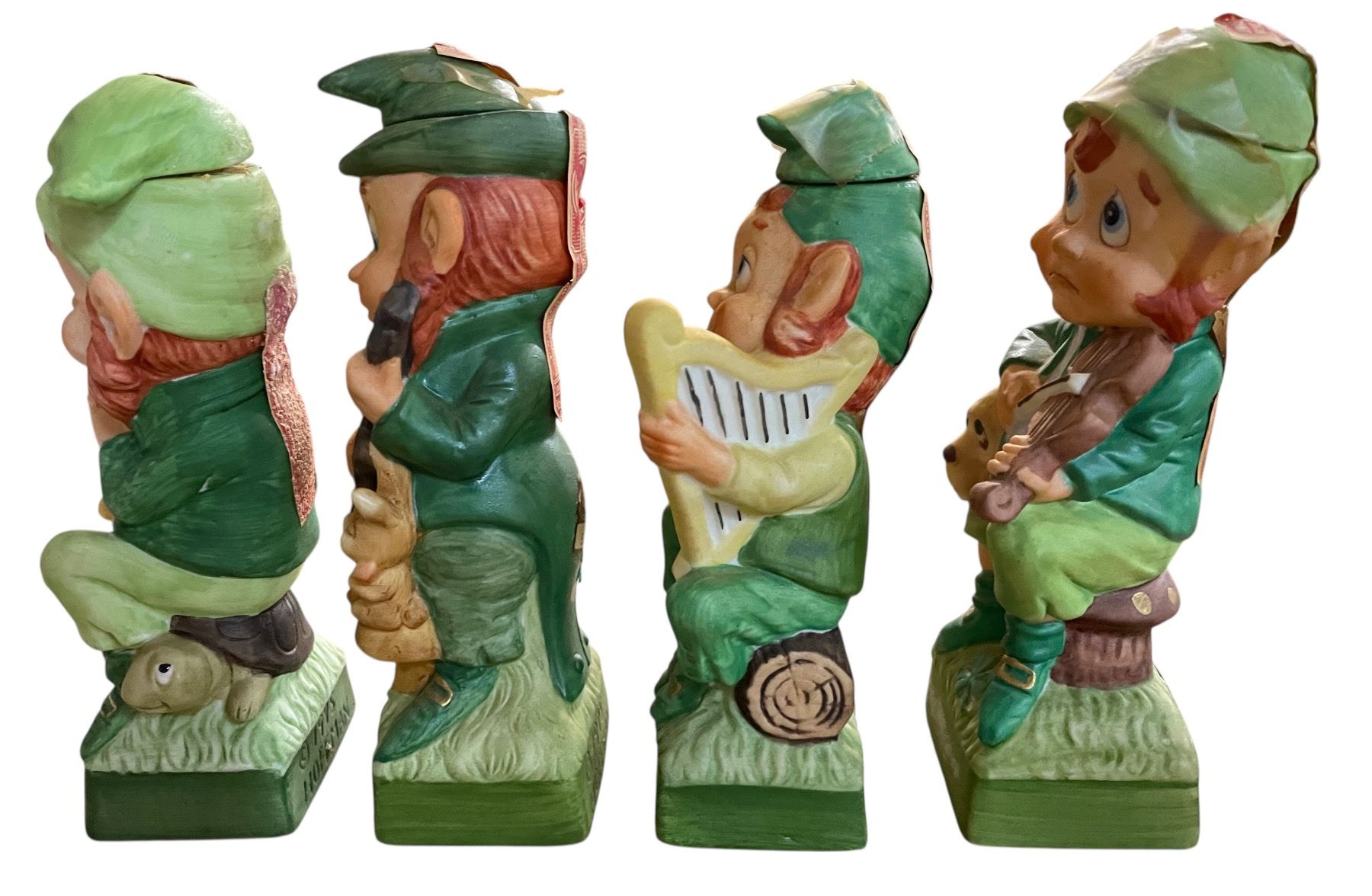 4 Vintage 1975 Hoffman Ceramic Whiskey Decanters Empty, Includes "Mr. Saxophonist", "Mr. Guitarist", "Mr. Harpist", and "Mr. Fiddler"