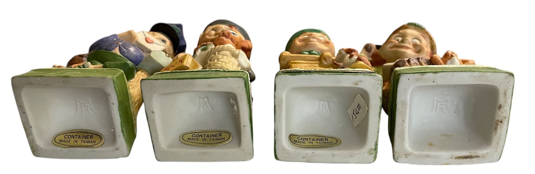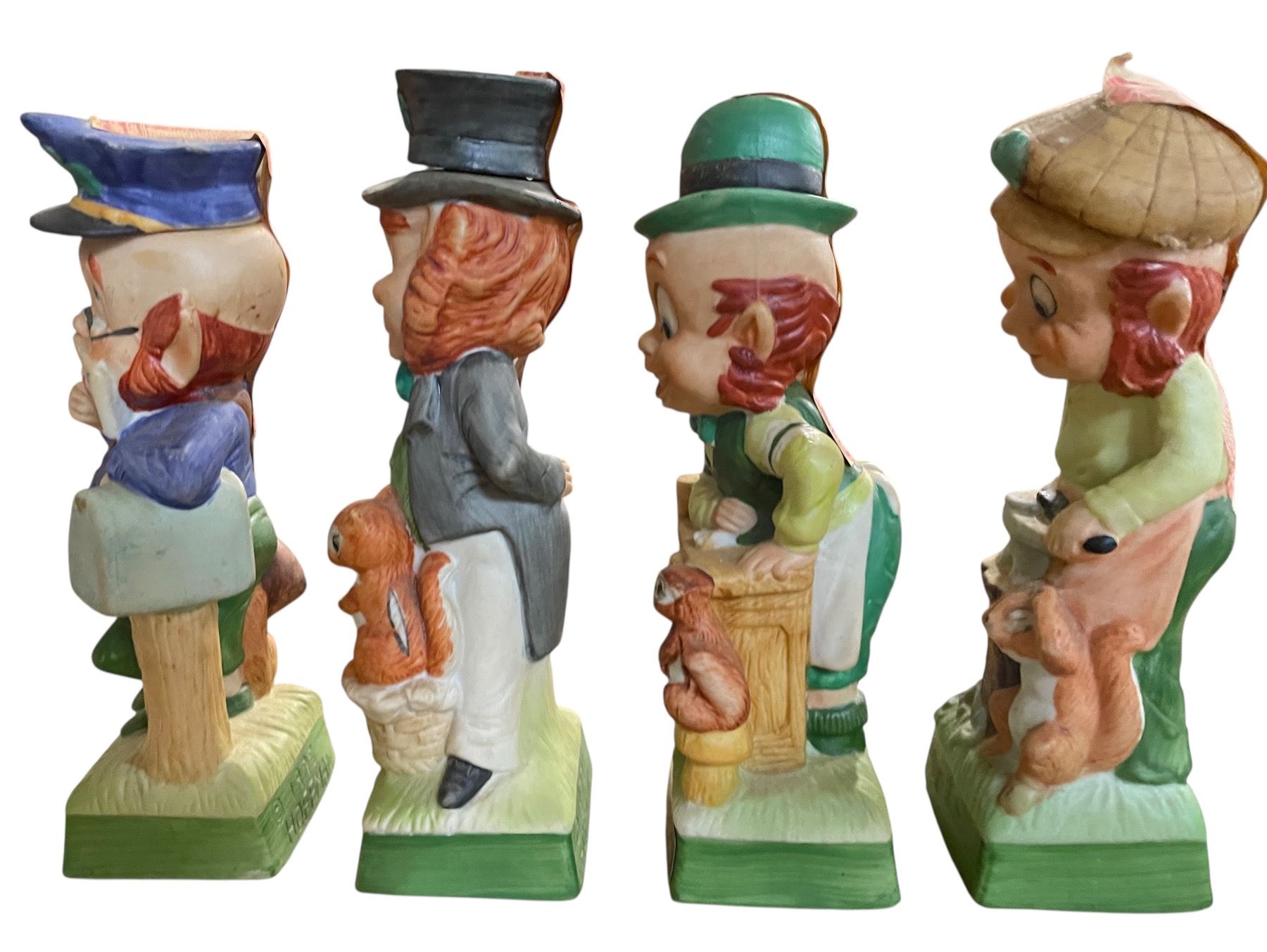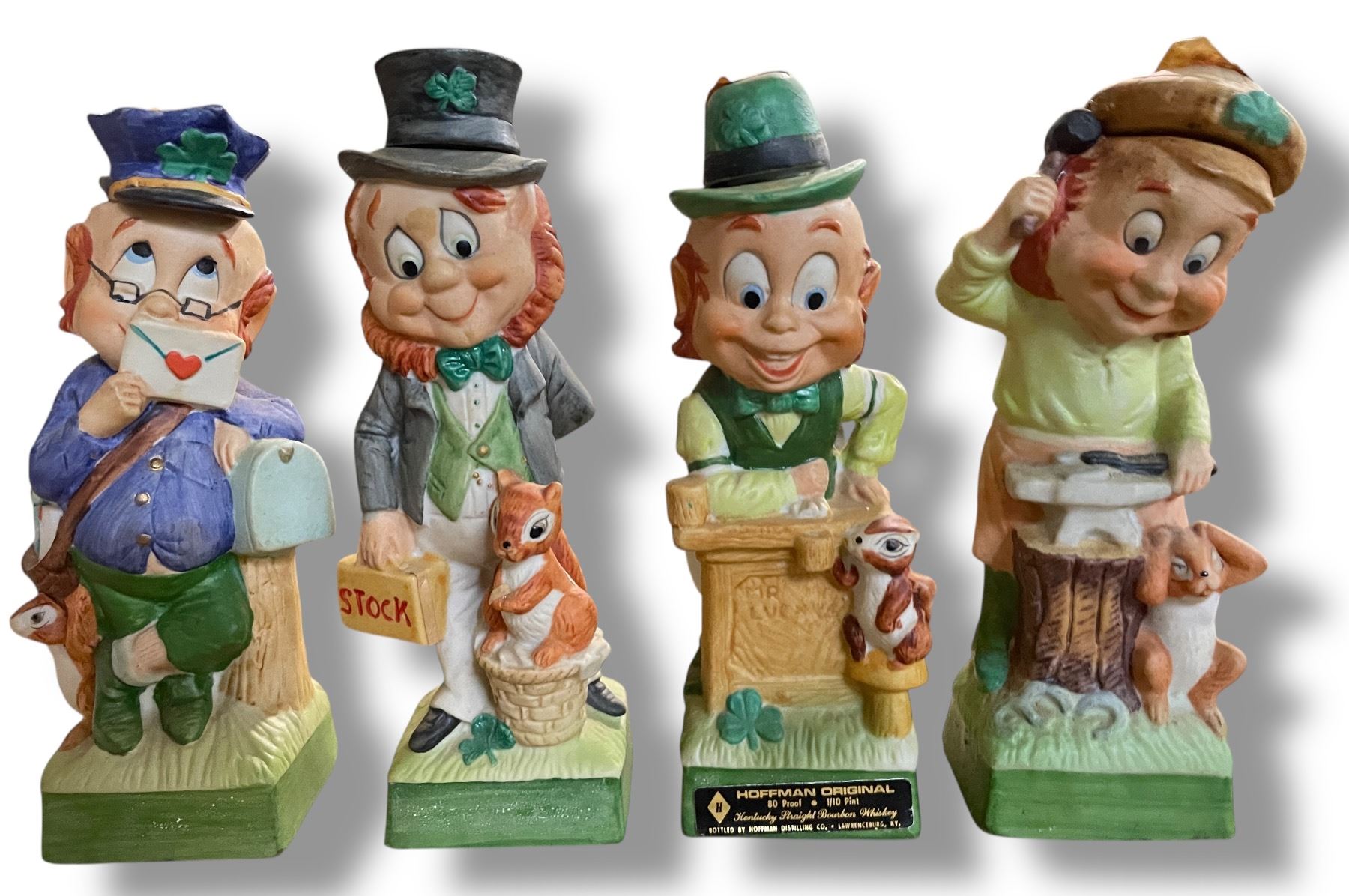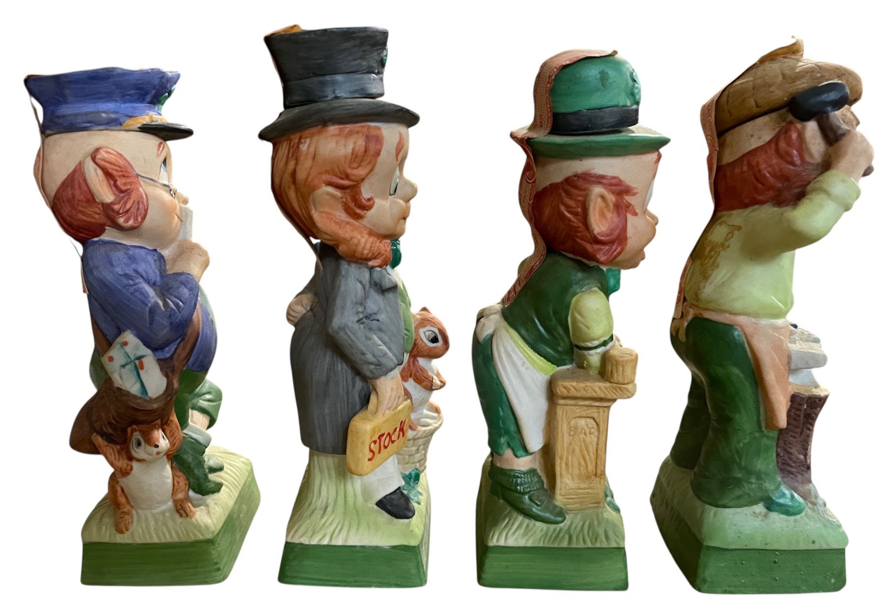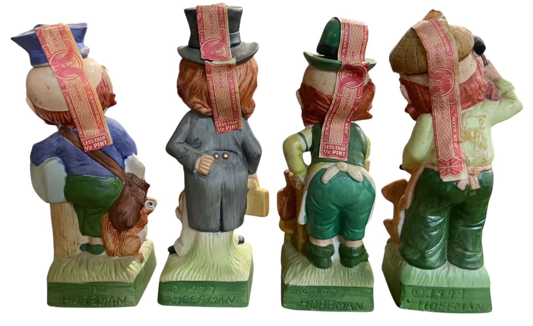 4 Vintage 1977 Hoffman Ceramic Whiskey Decanters, Includes "Mr. Mailman", "Mr. Stockbroker", "Mr. Bartender", and "Mr. Blacksmith"