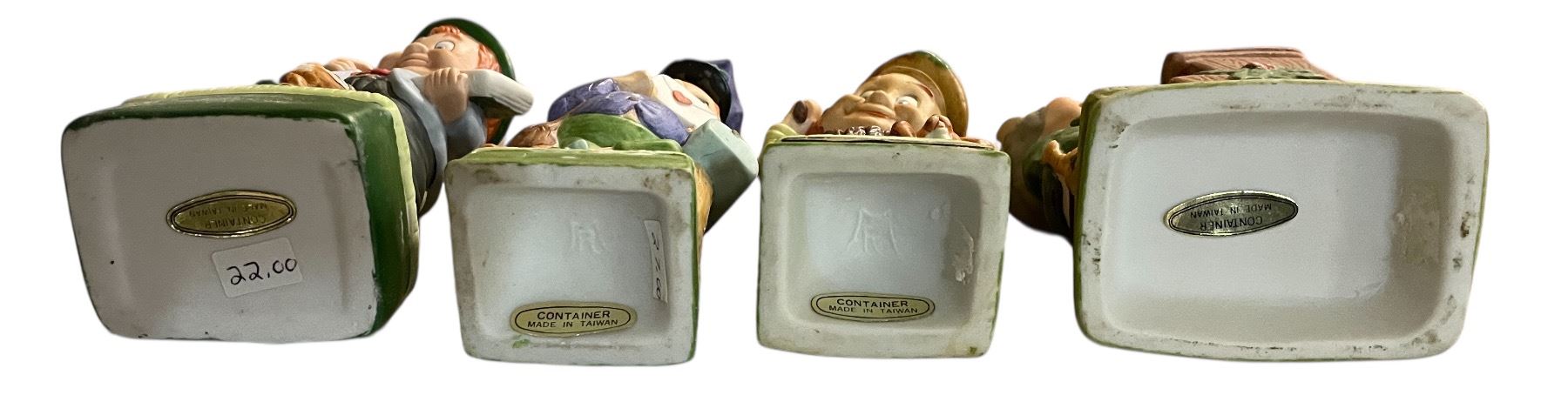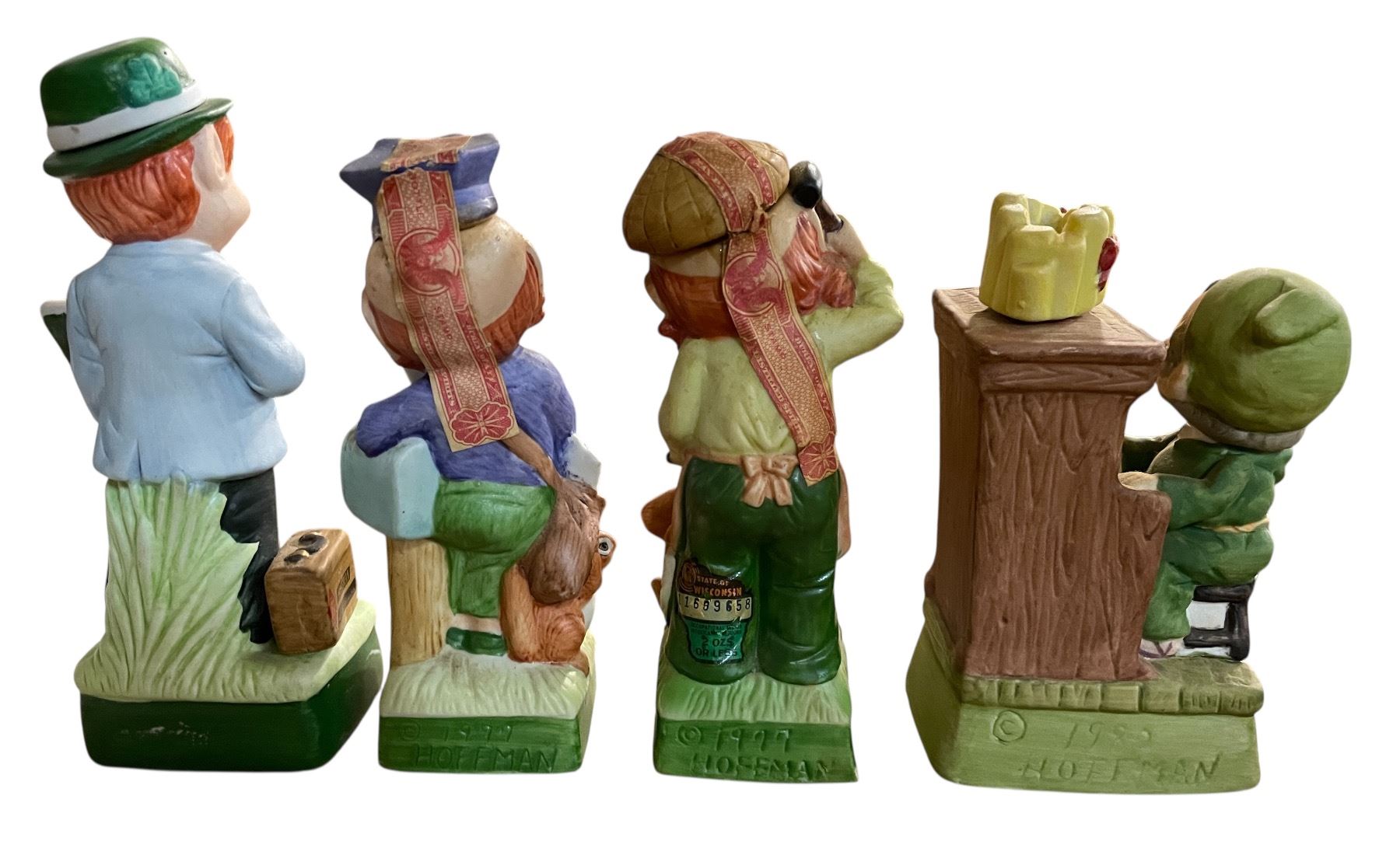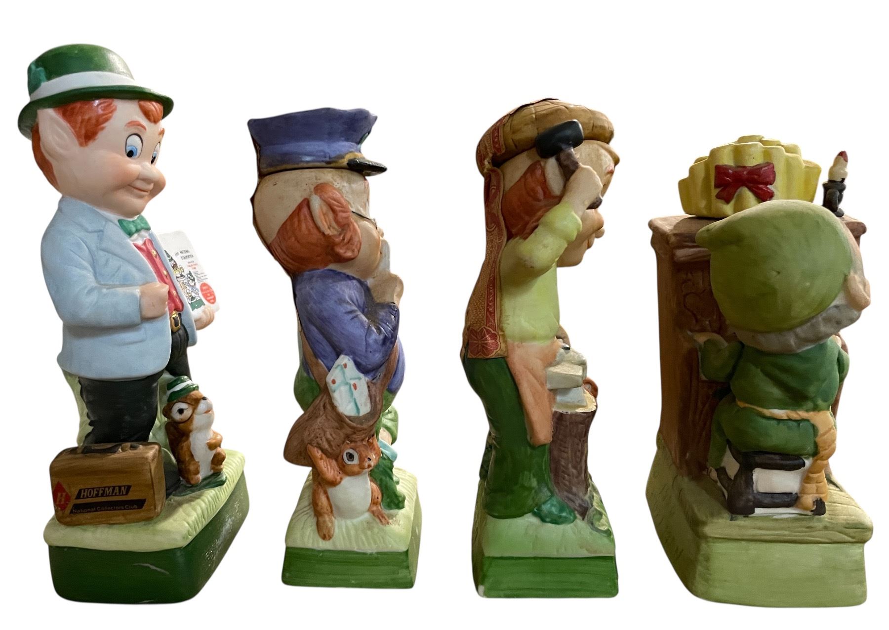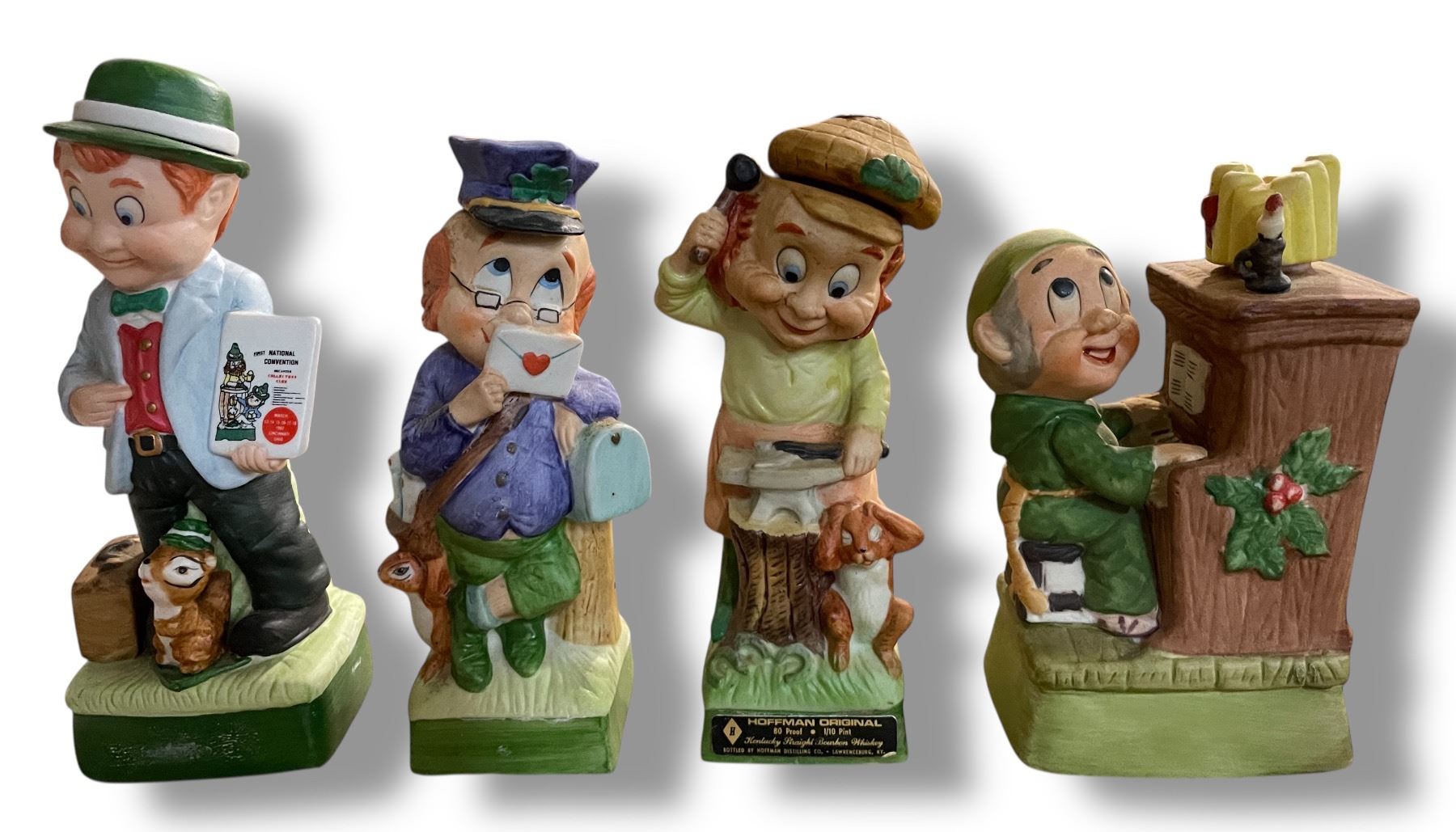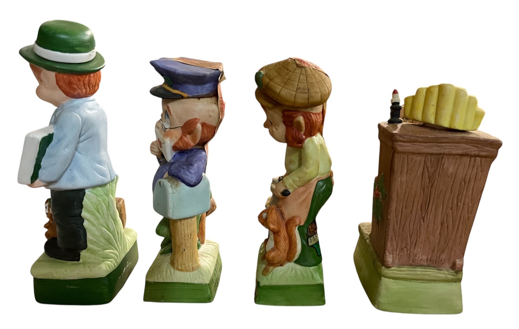 4 Vintage 1980 Hoffman Ceramic Whiskey Decanters Empty, Includes "Mr. Salesman", "Mr. Mailman", "Mr. Blacksmith", and "The Organ Player"