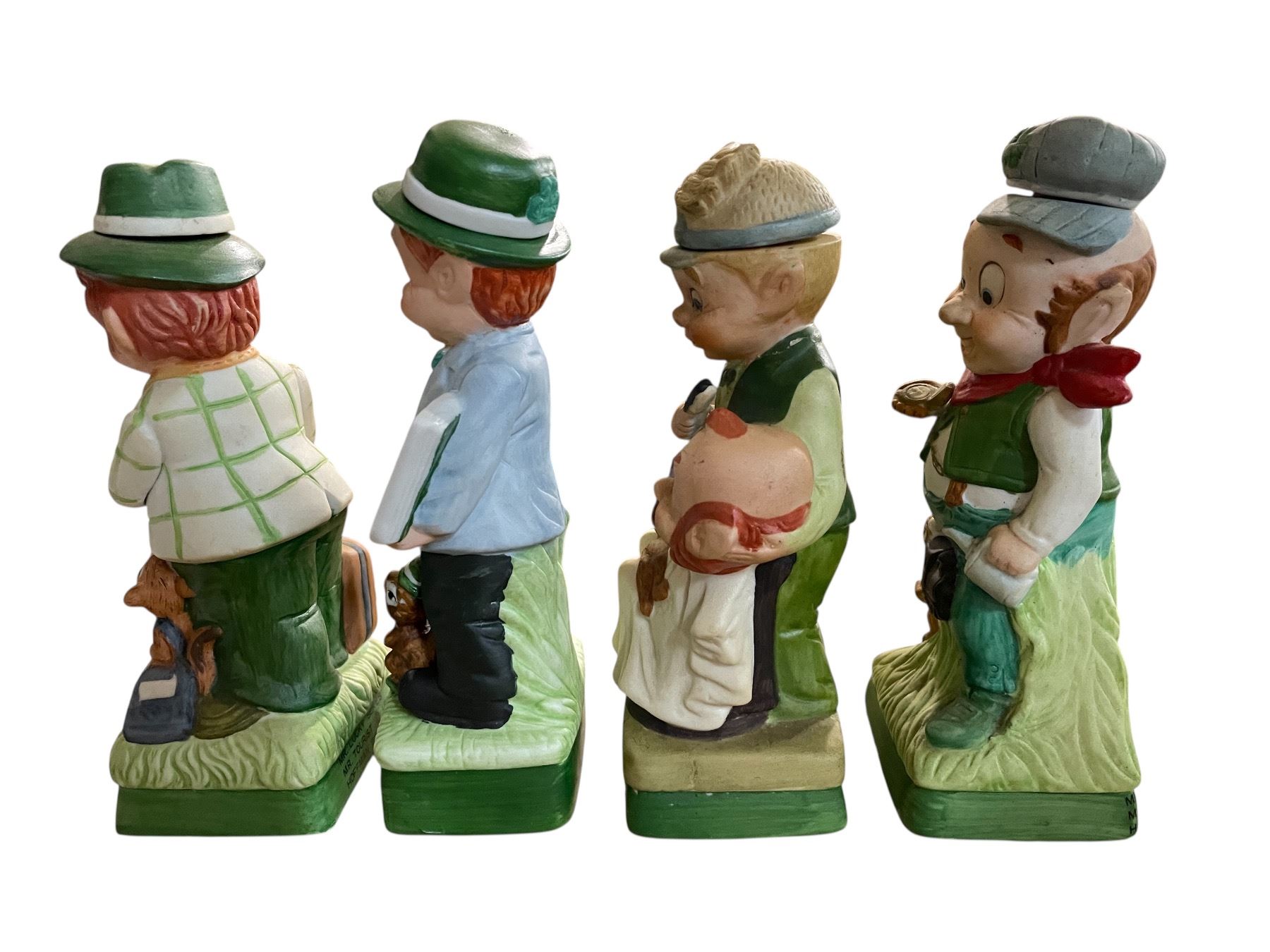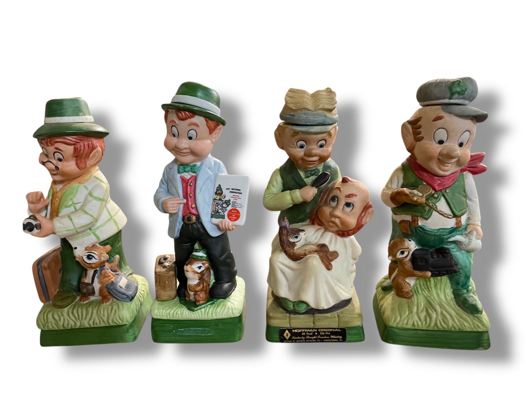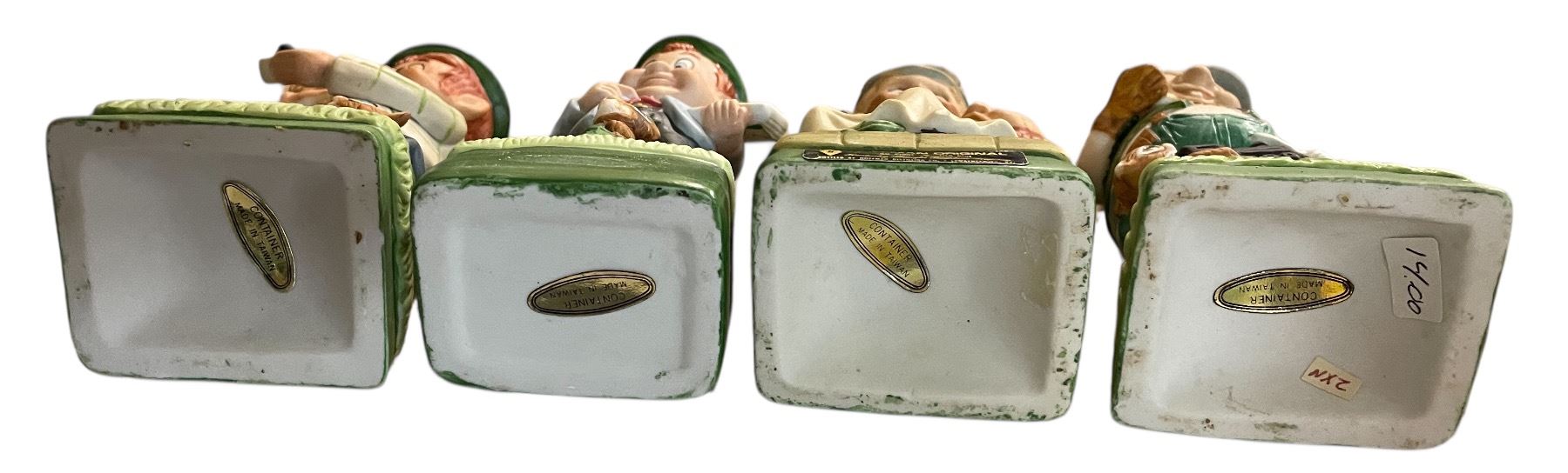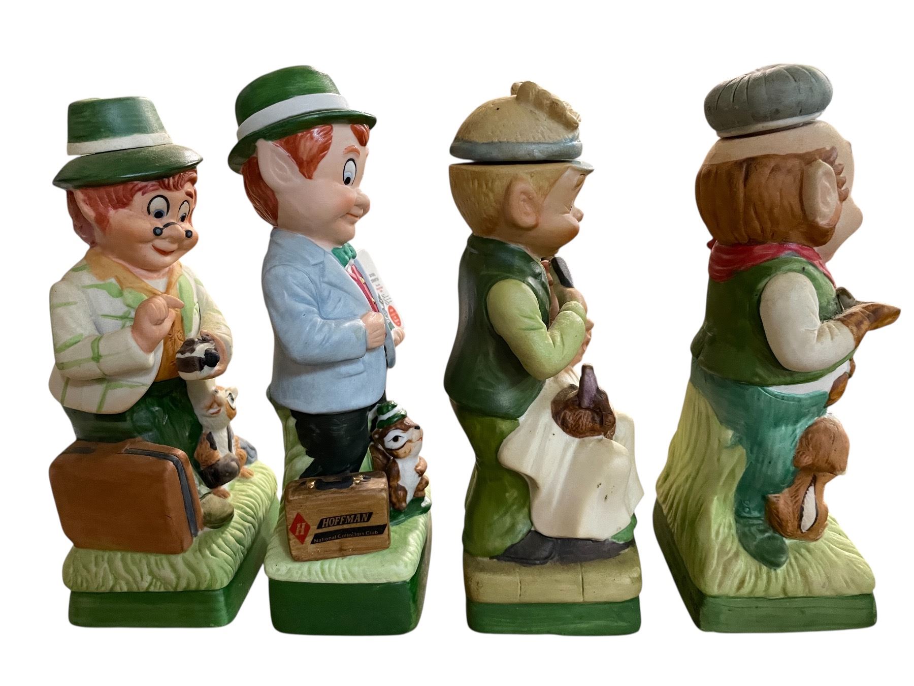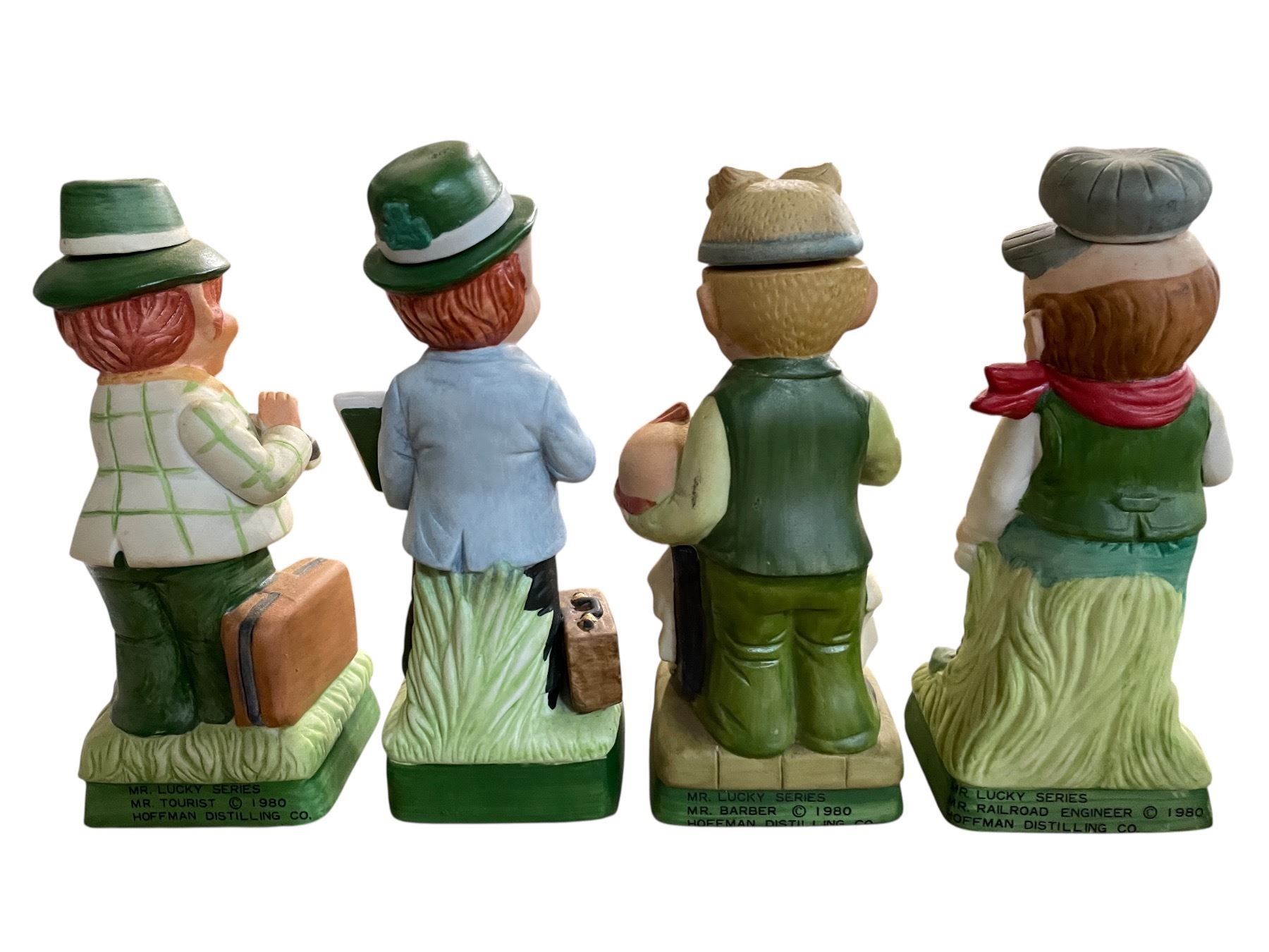 4 Vintage 1980 Hoffman Ceramic Whiskey Decanters Empty, Includes "Mr. Tourist", "Mr. Salesman", "Mr. Barber", and "Mr. Railroad Engineer "