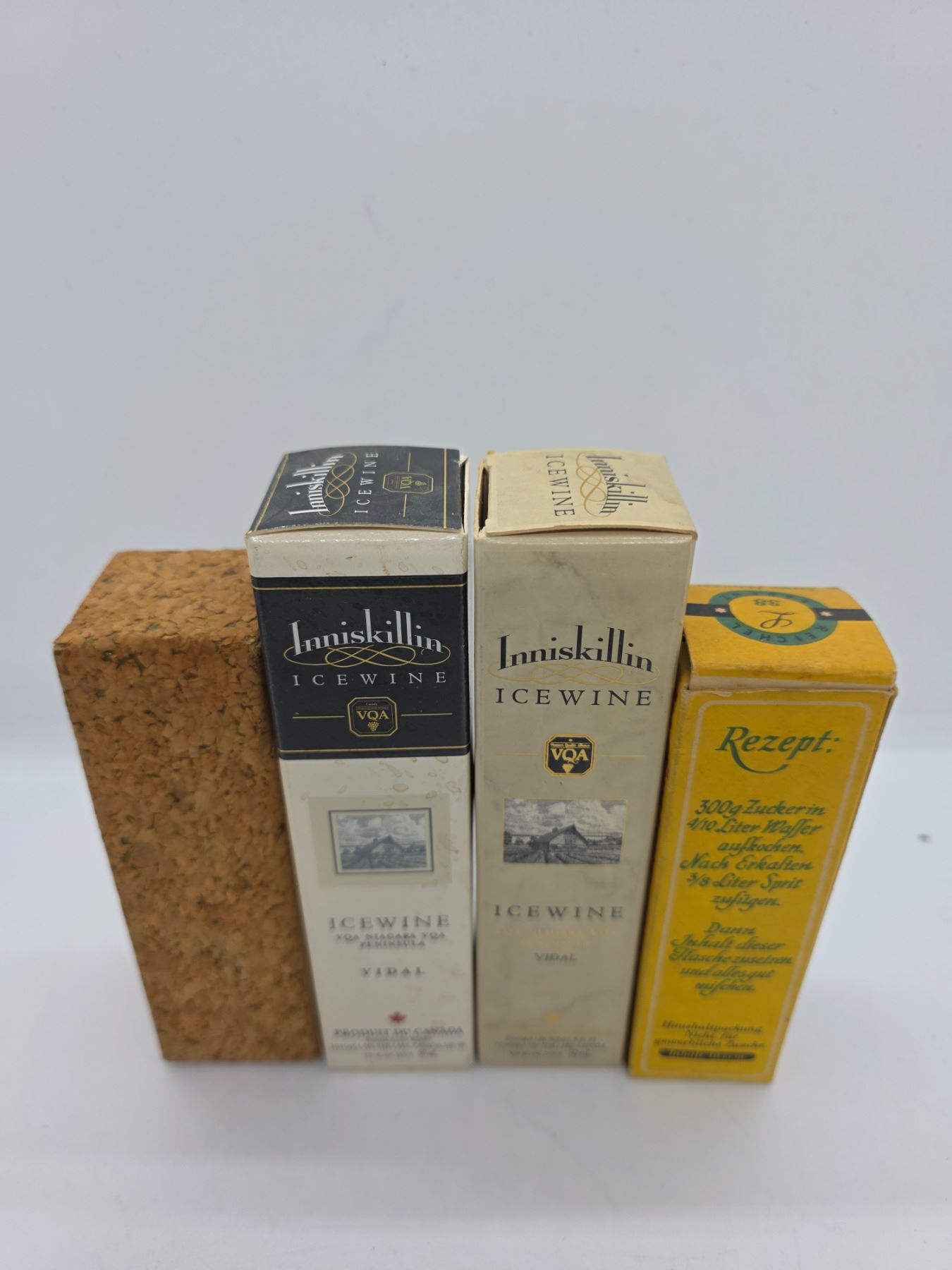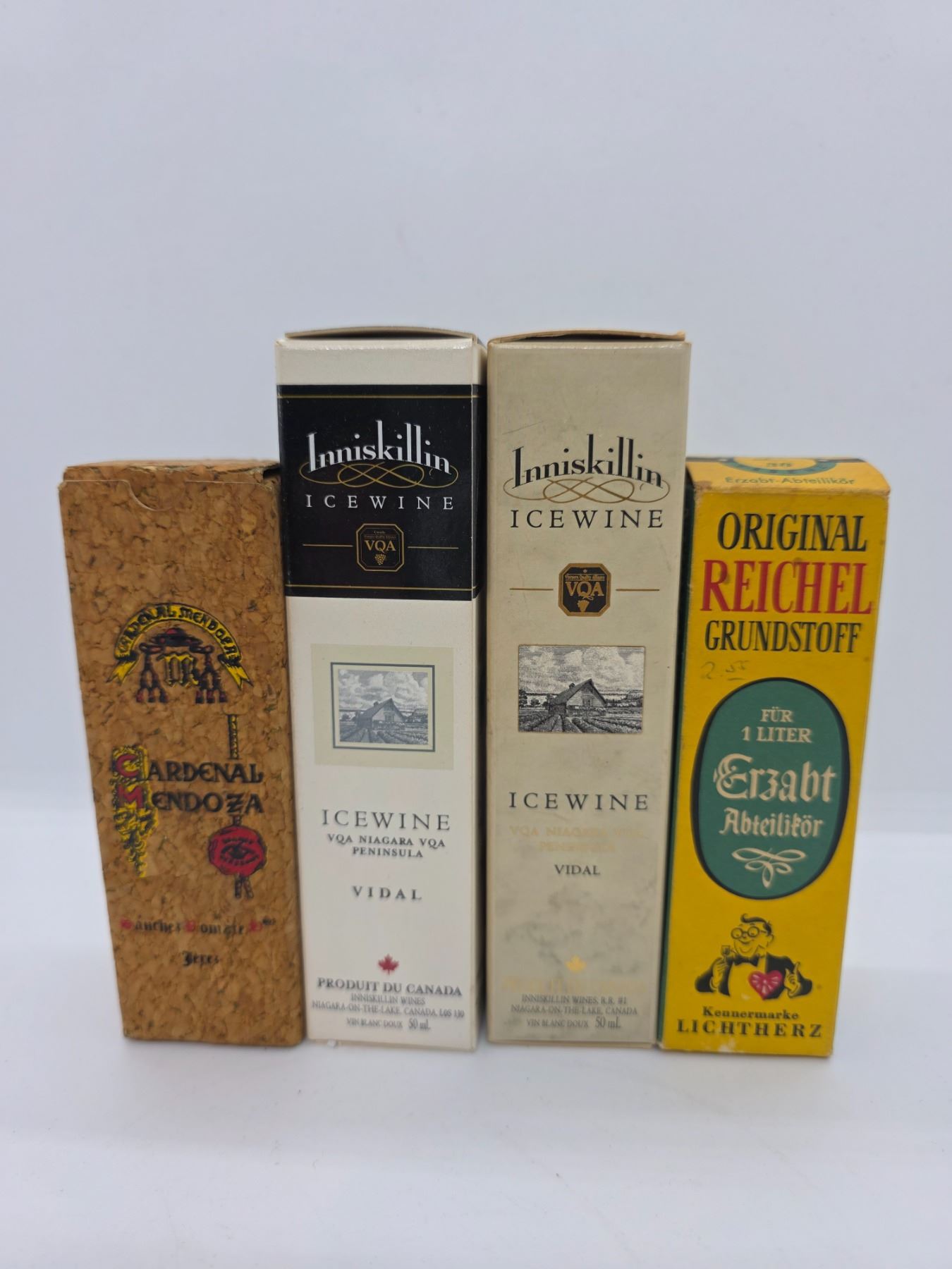 4 Vintage 50ml Liquor Minis in Original Boxes - 2 Inniskillin Ice Wine, Original Reichel Grundstoff, & Cardenal Mendoza