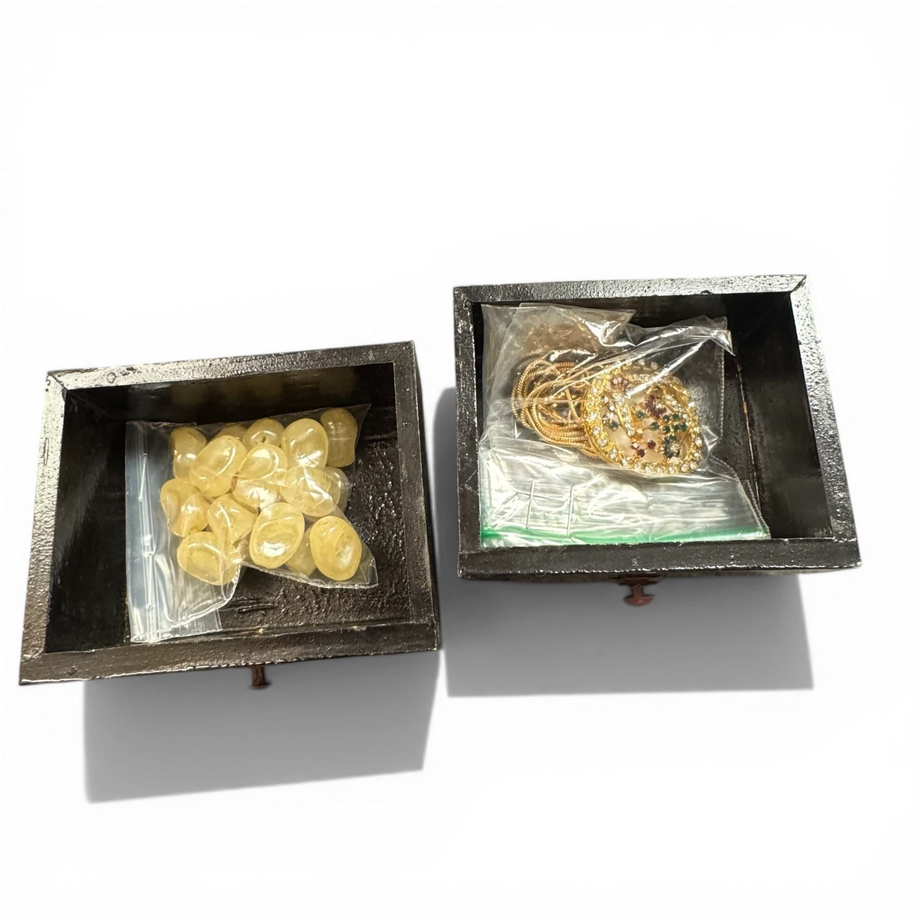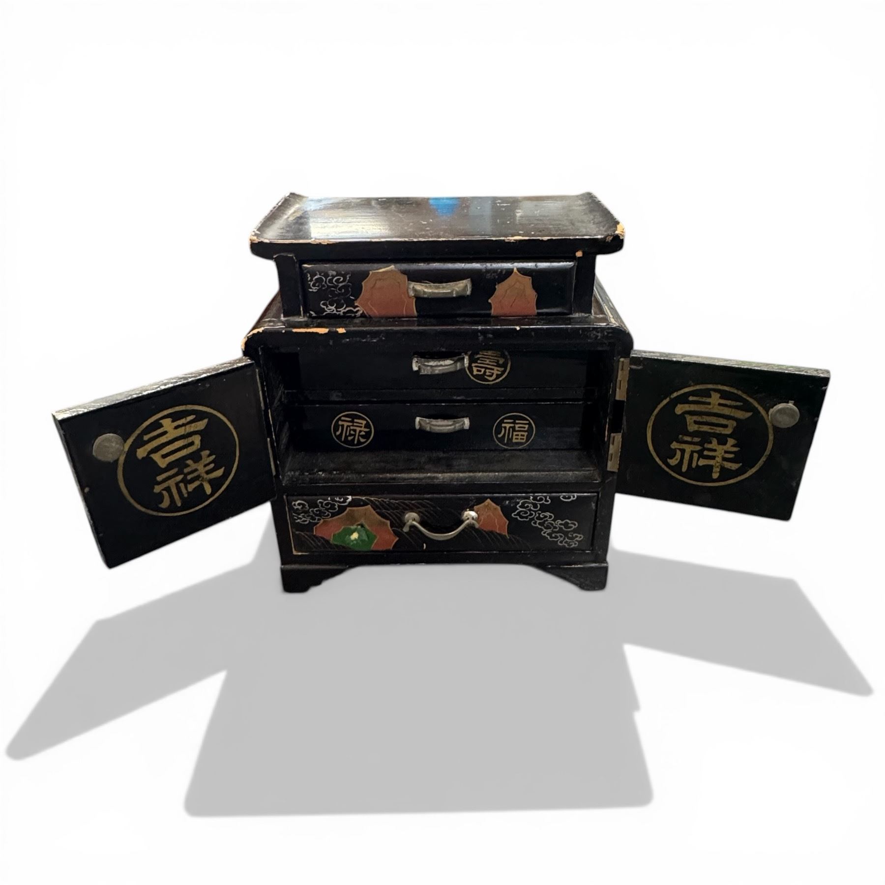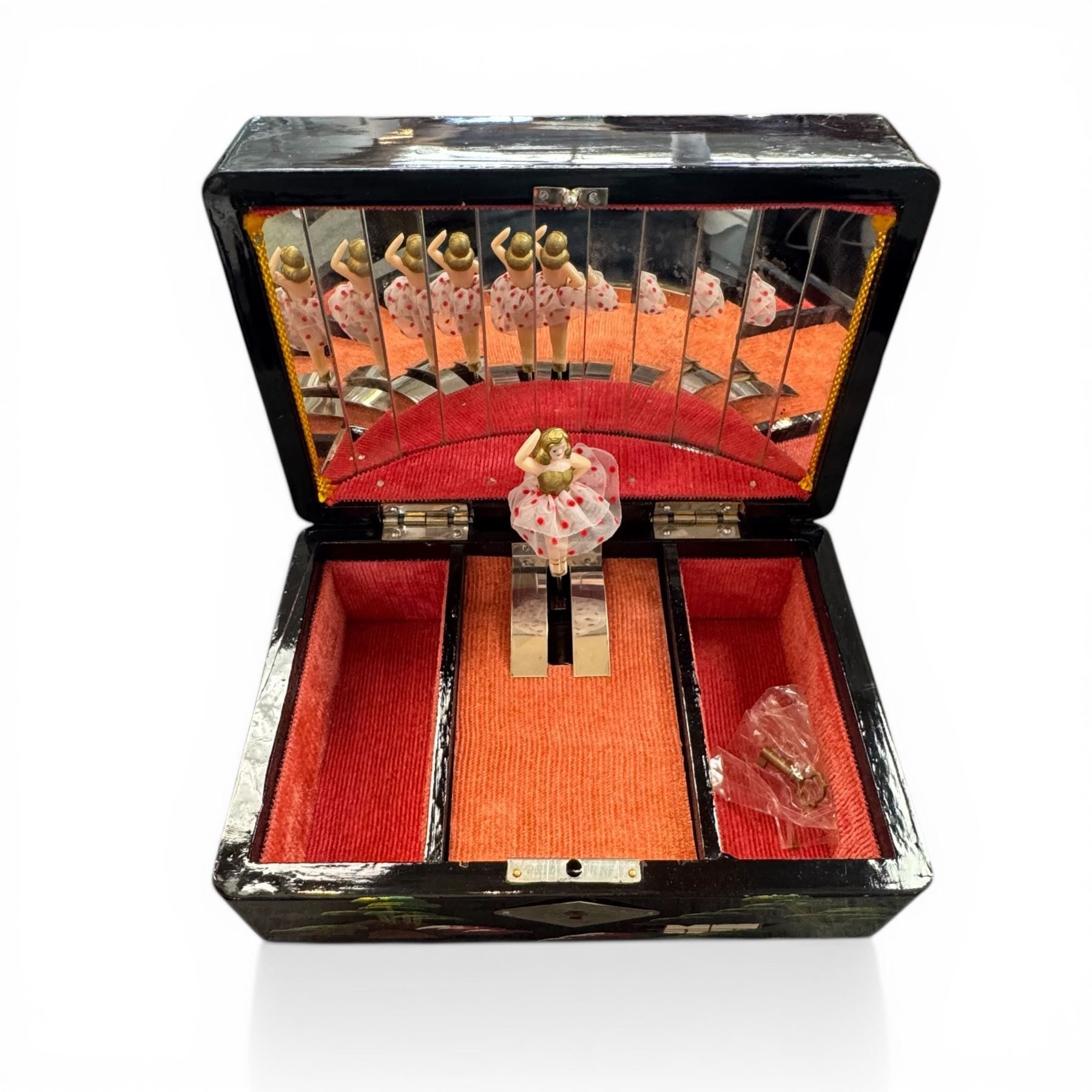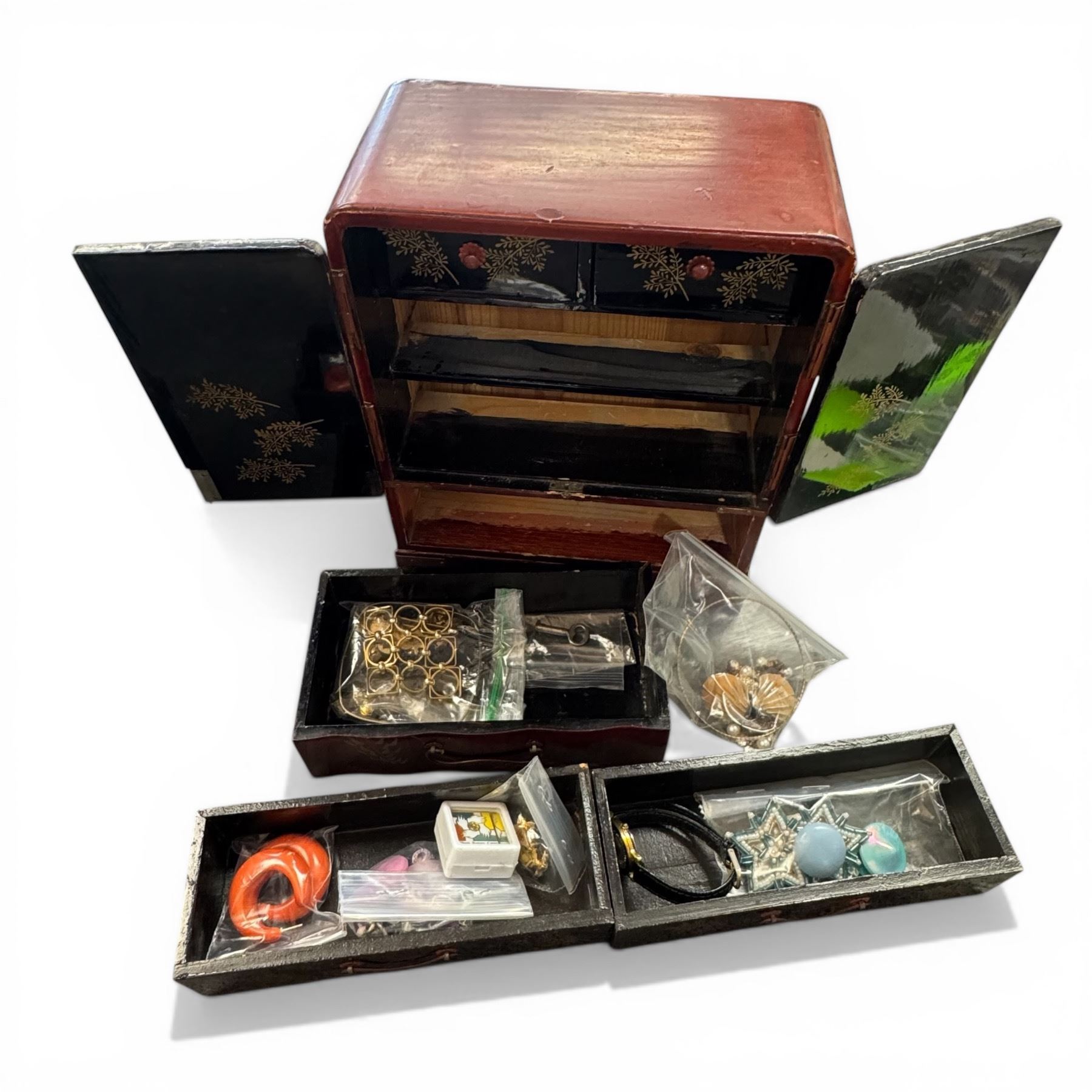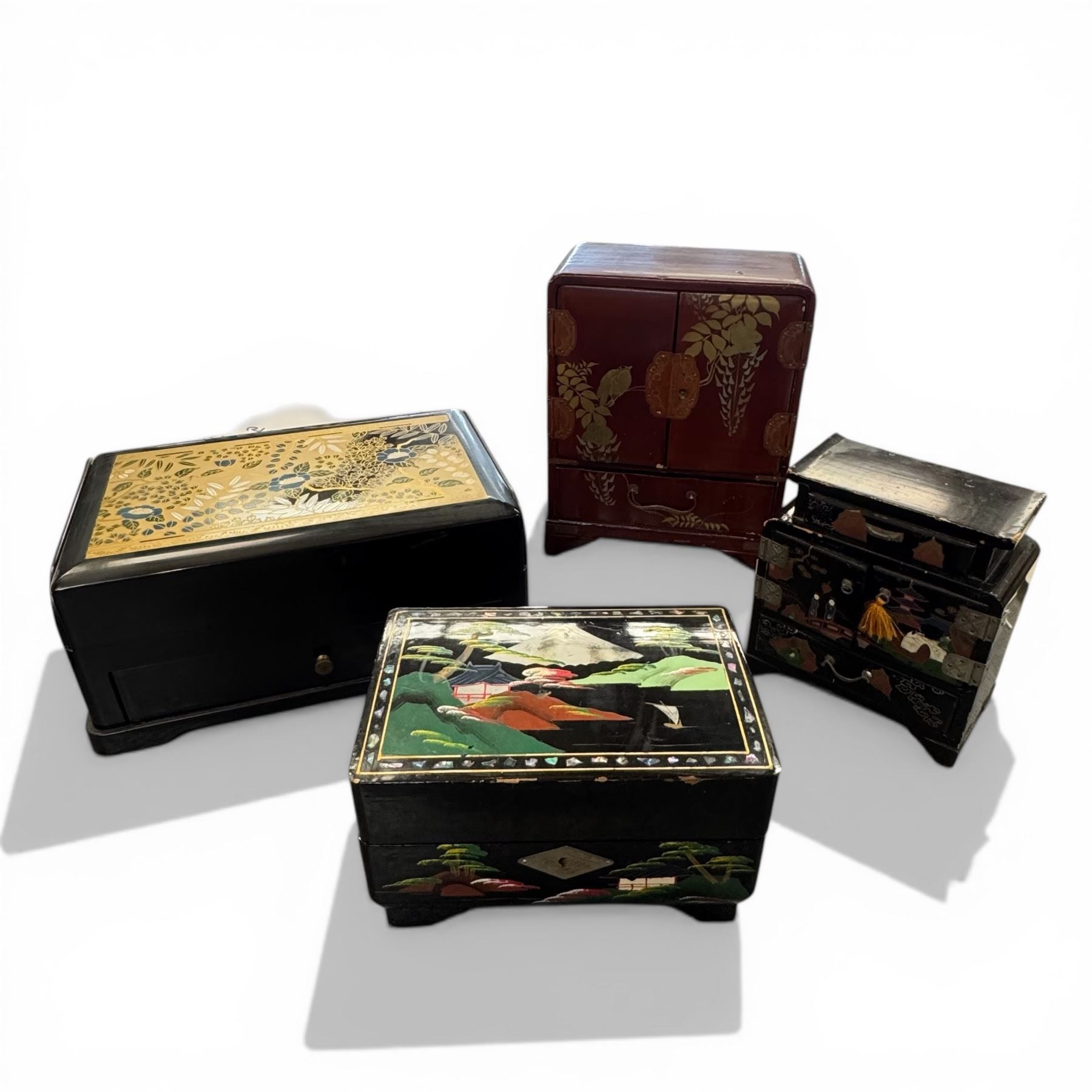 4 Vintage Asian Design Jewelry Boxes and Contents * The musical jewelry box has its original key (Largest is 7" x 10" x 5" tall)