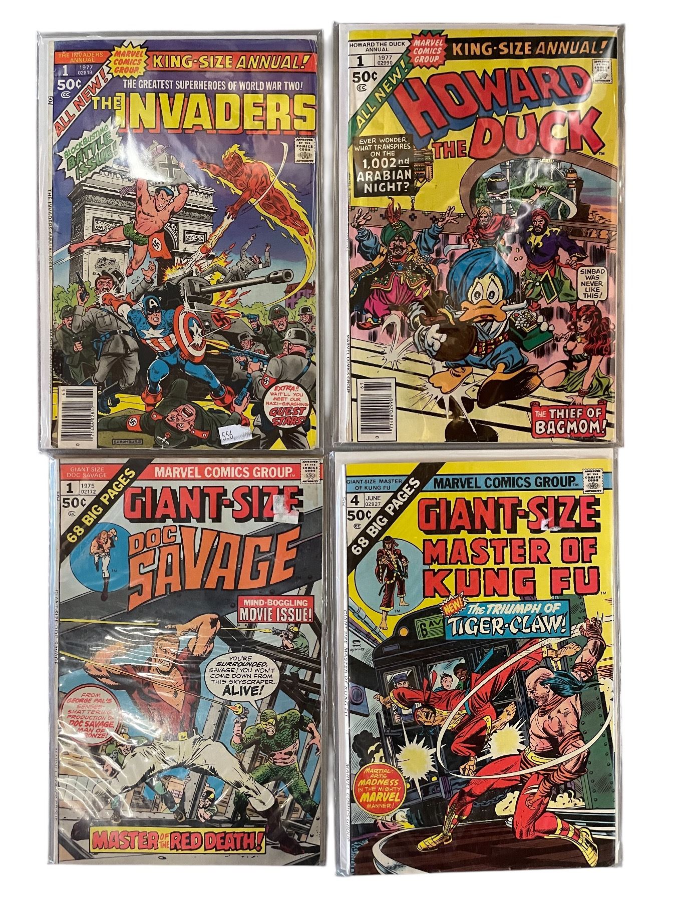 4 Vintage Comic Books: The Invaders, Howard The Duck, Giant Size Doc Savage, & Giant Size Master Of Kung Fu