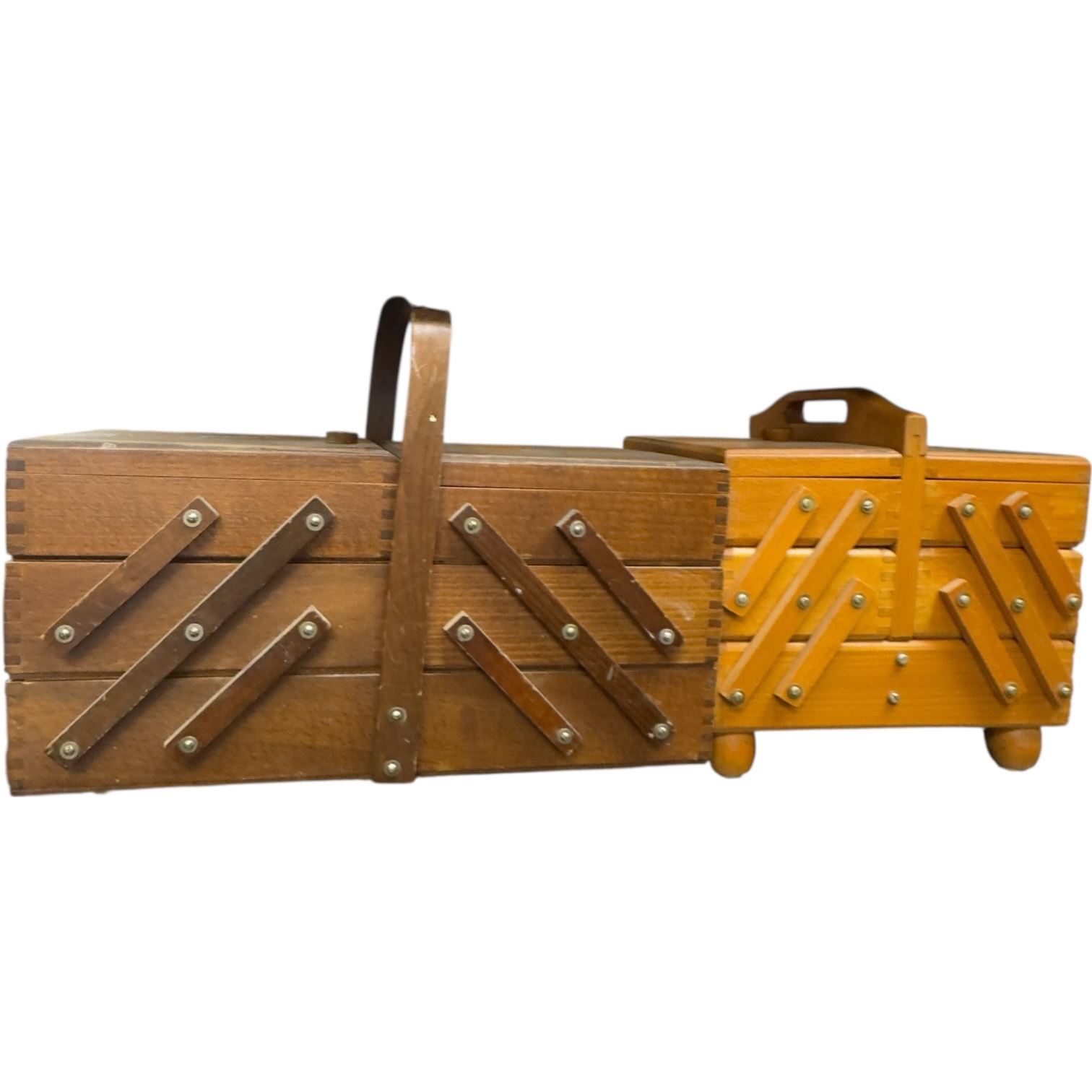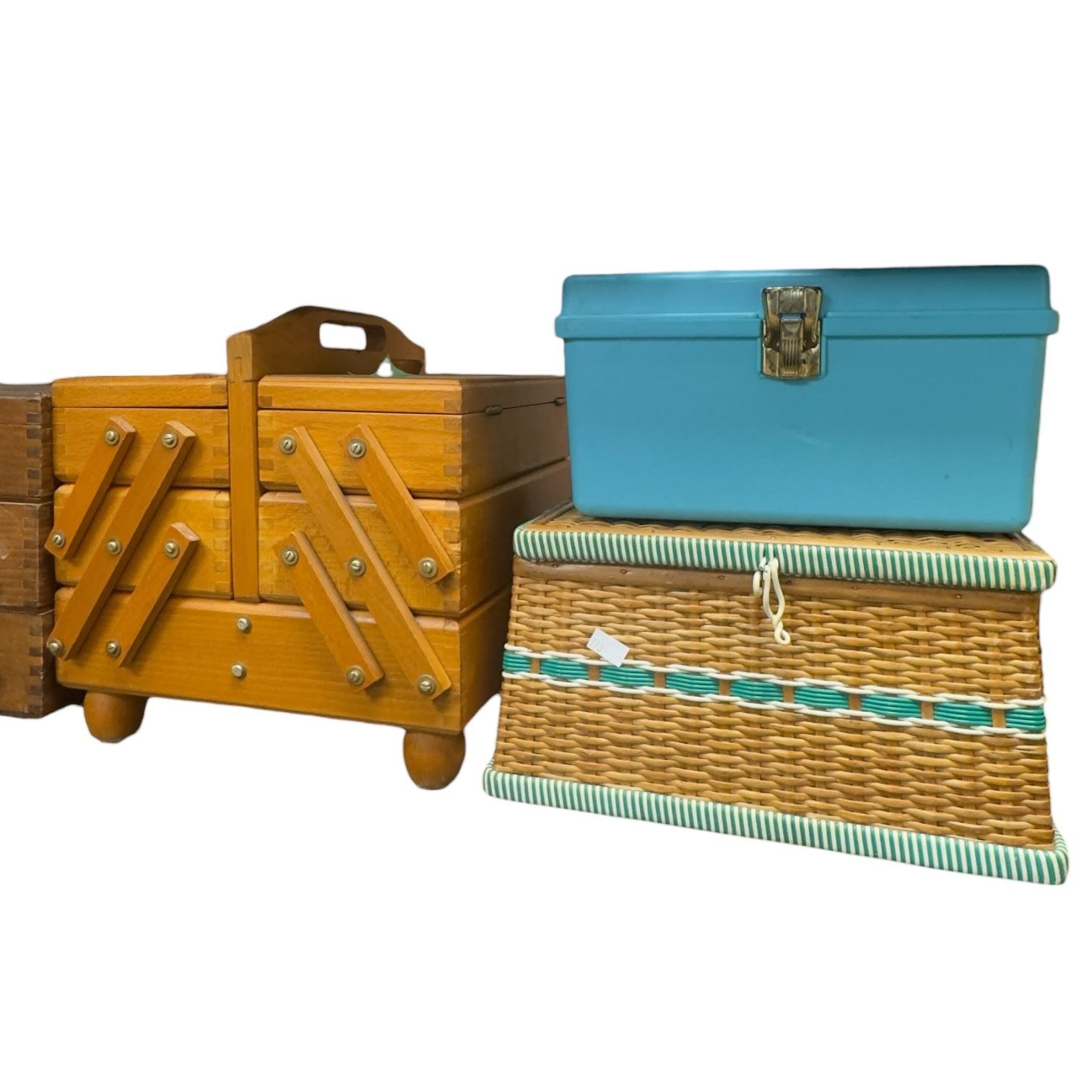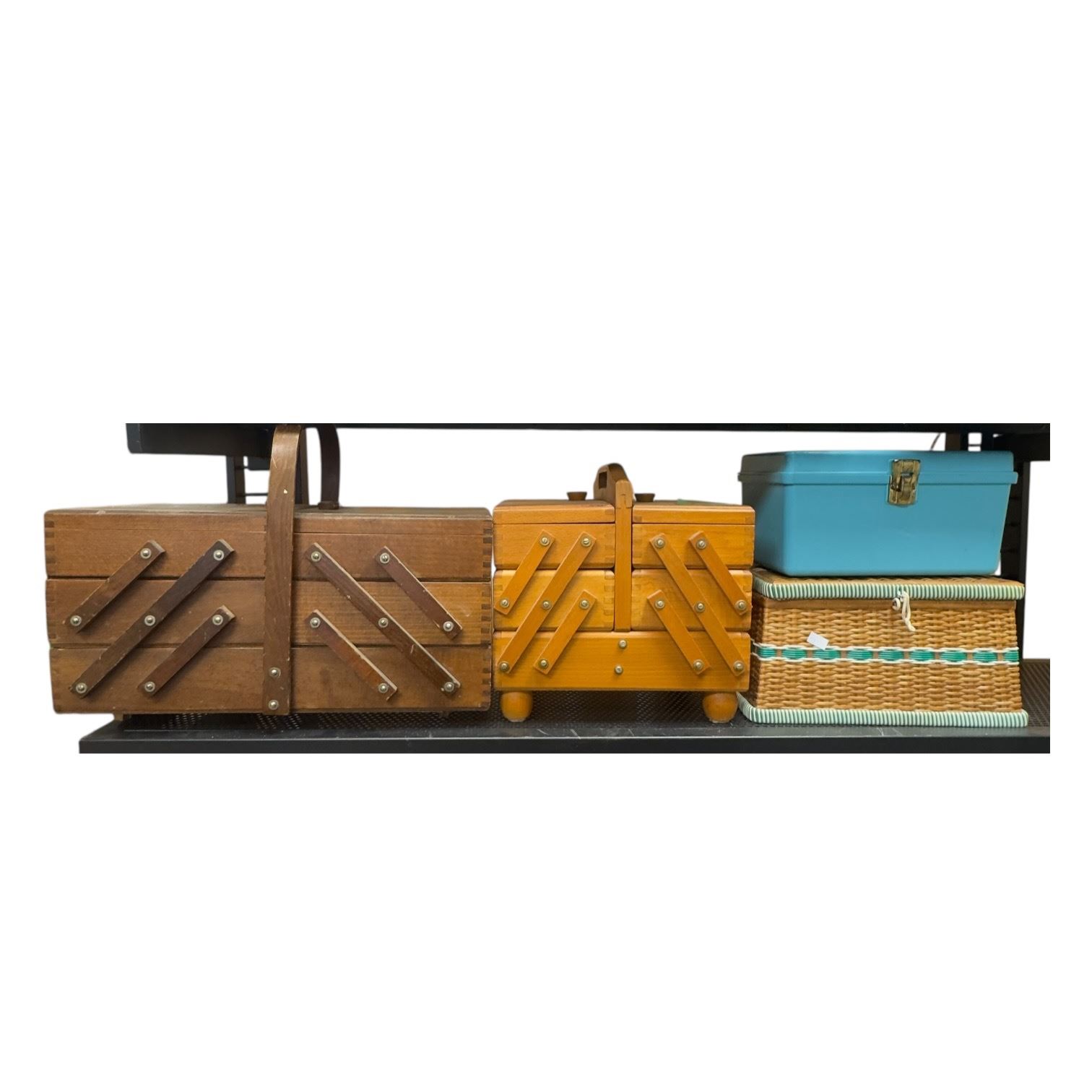 Set of 4 vintage sewing baskets featuring woven designs in assorted sizes and patterns. Ideal for storing sewing supplies or decorative display. Baskets are pre-owned and show signs of age-related wear. Item is as pictured.
