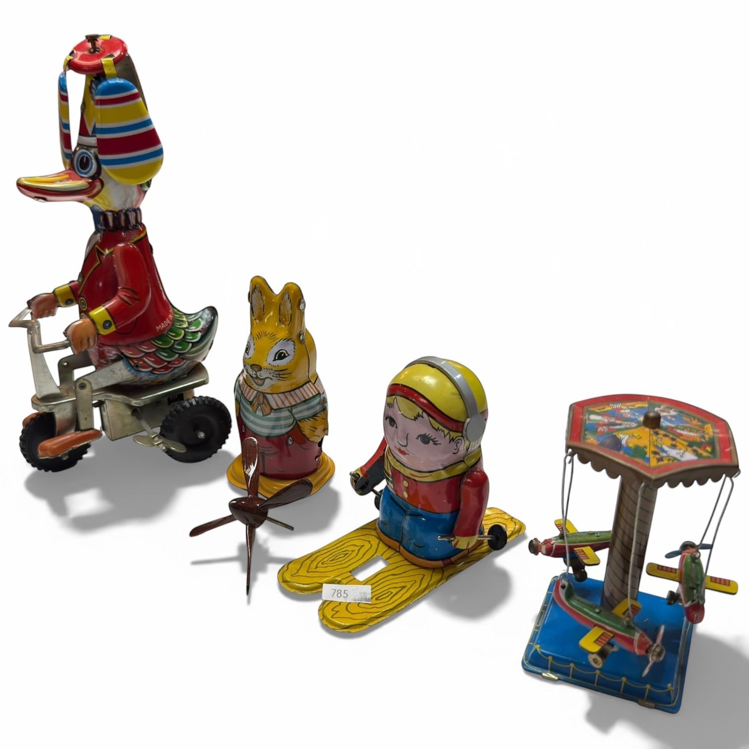 4 Vintage Tin Toys * Featuring the 9" tall Duck on a Bike