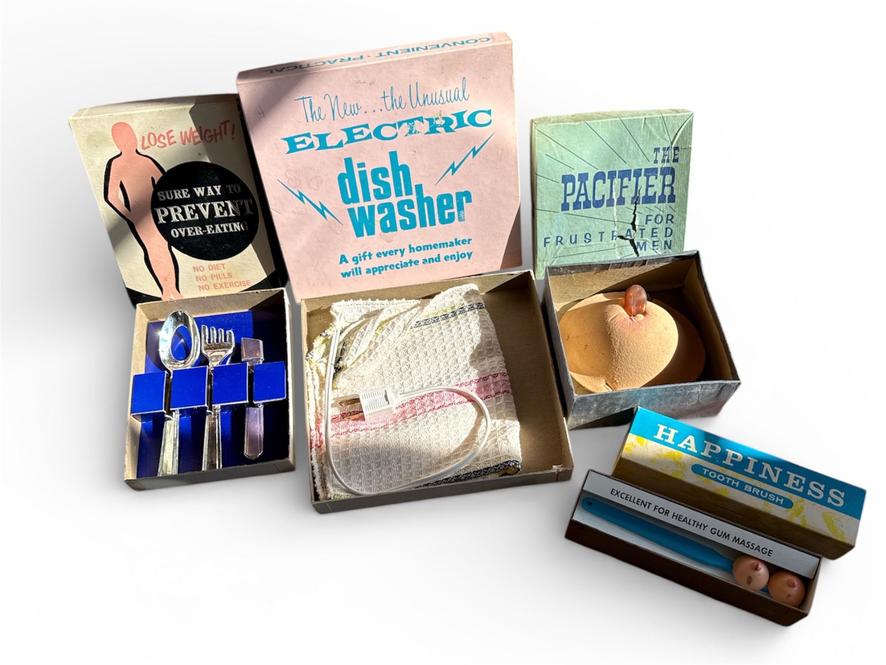 4 pc - Mid Century Gag Gifts - Pacifier for Frustrated Men, Happiness Tooth Brush, Electric Dish Washer & Weight Loss Gift