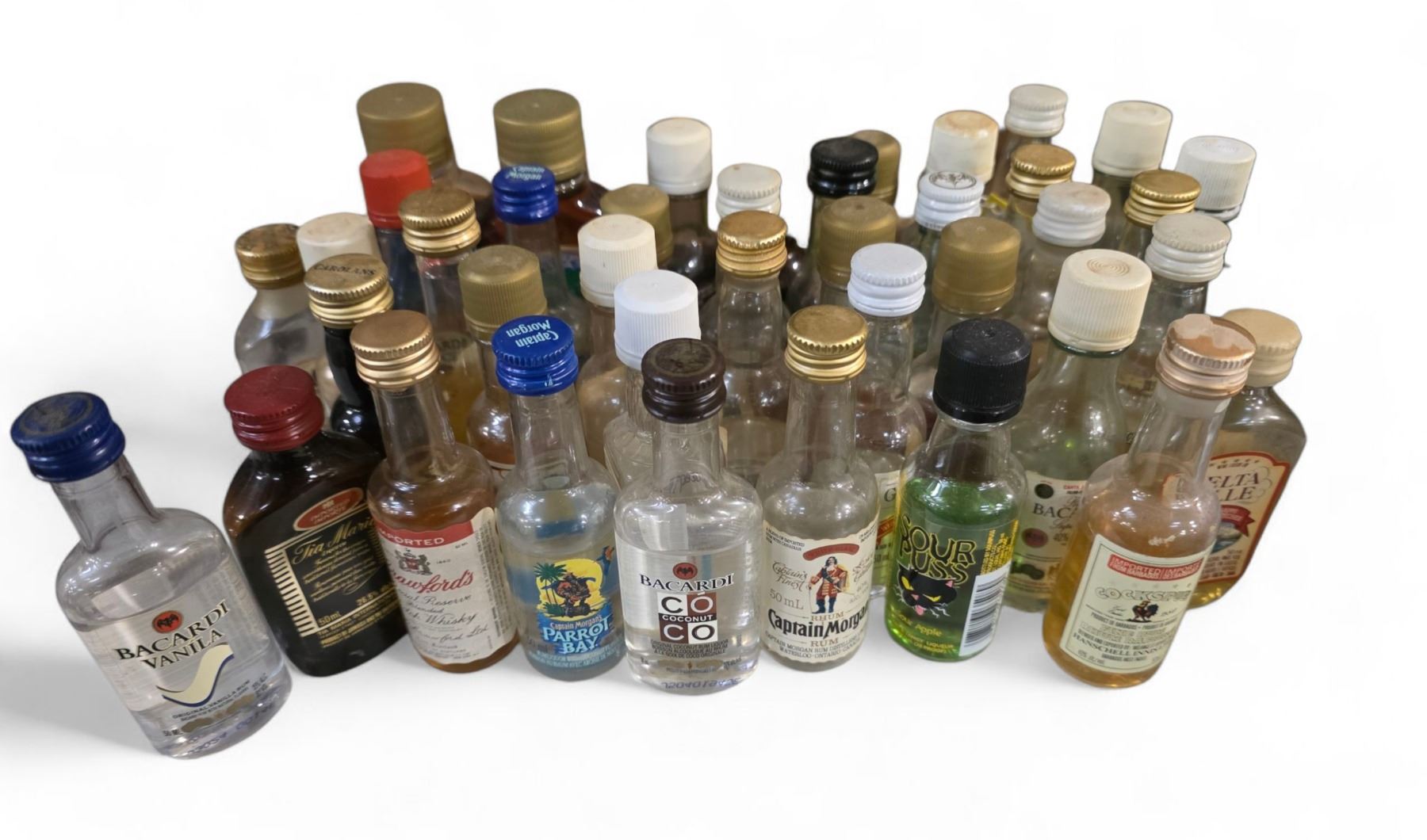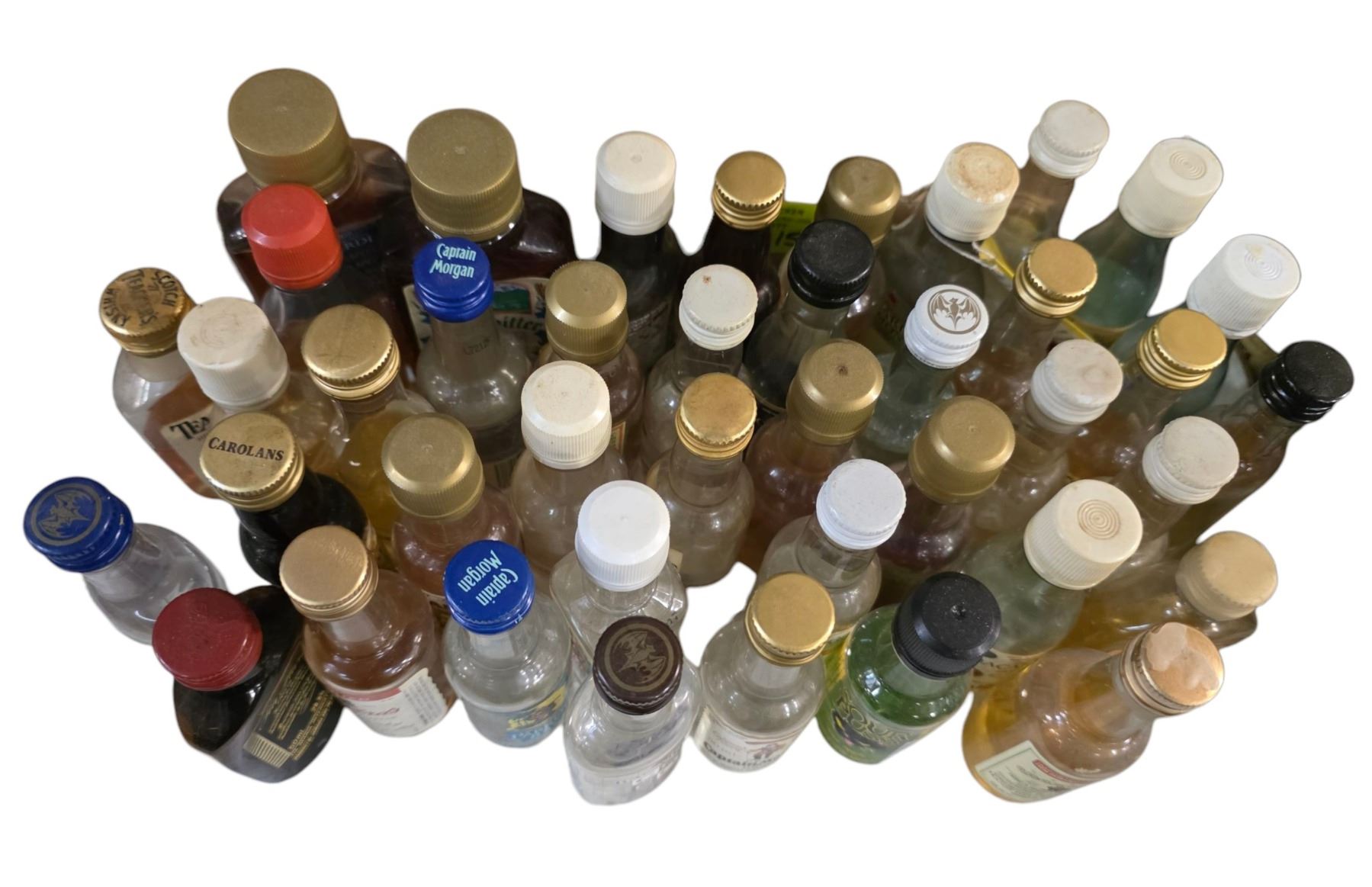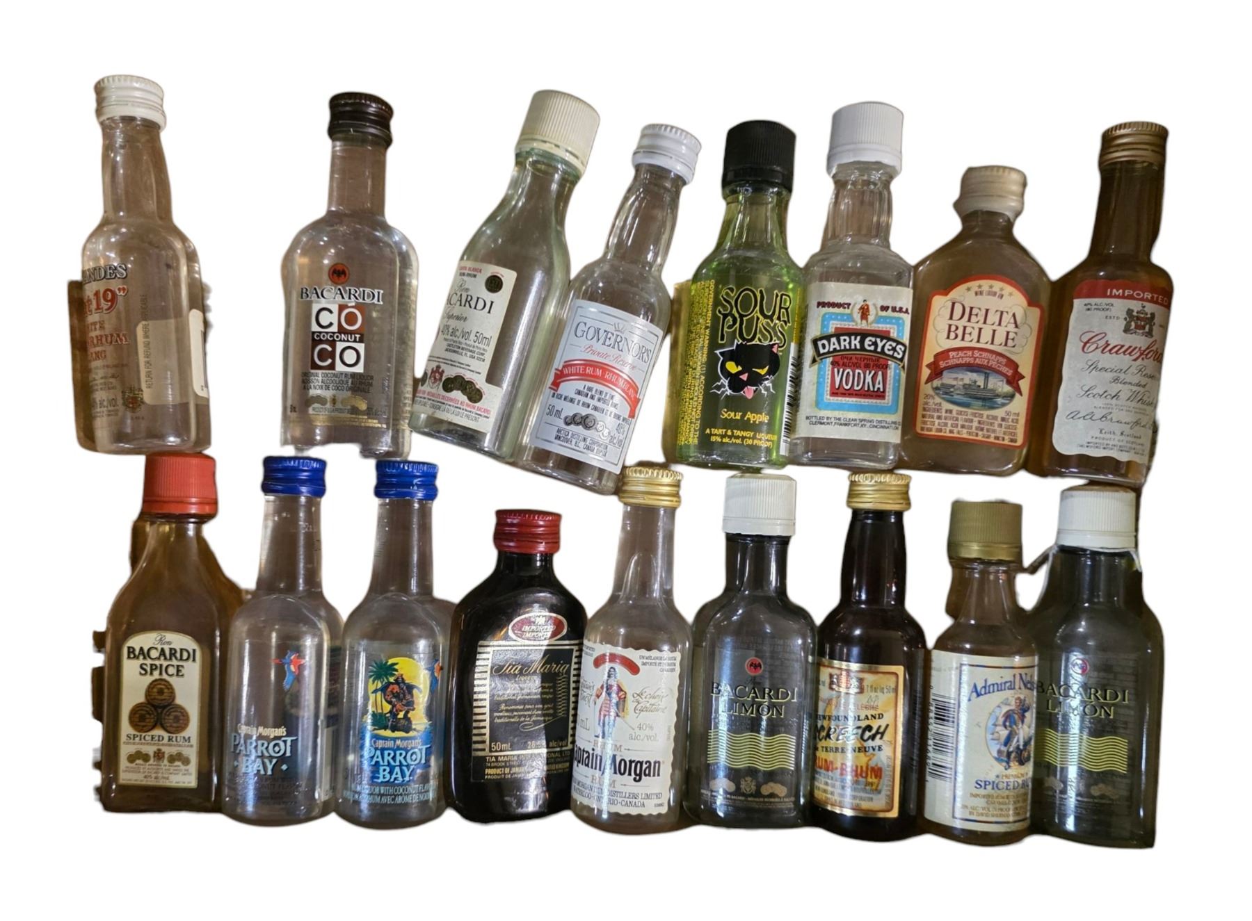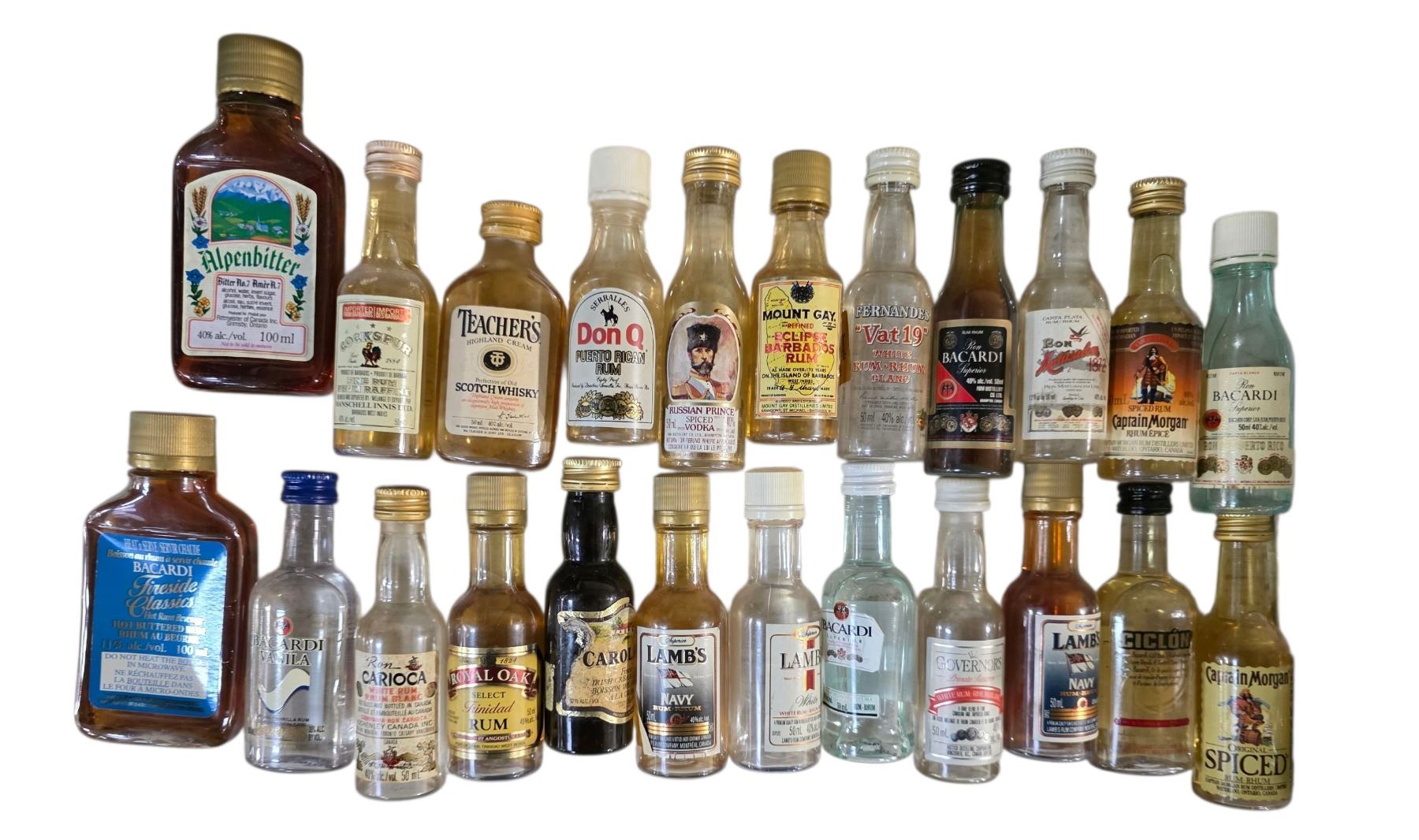 40 Miniature Empty Liquor Bottles - Featuring Brands such as Mount Gay Rum, Don Q Rum, and Teacher's Scotch Whisky