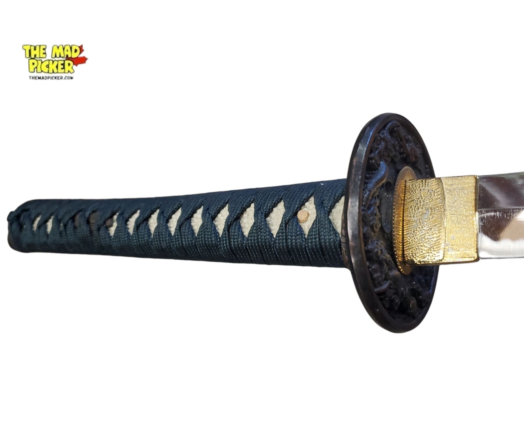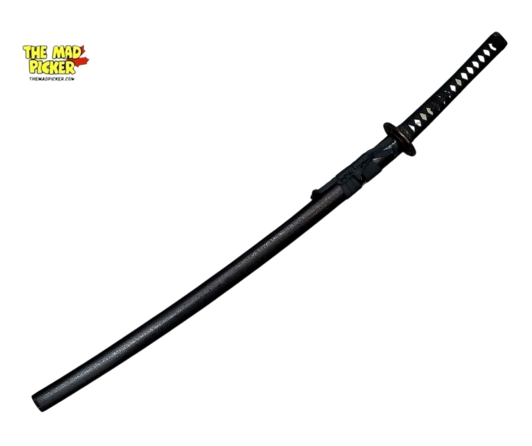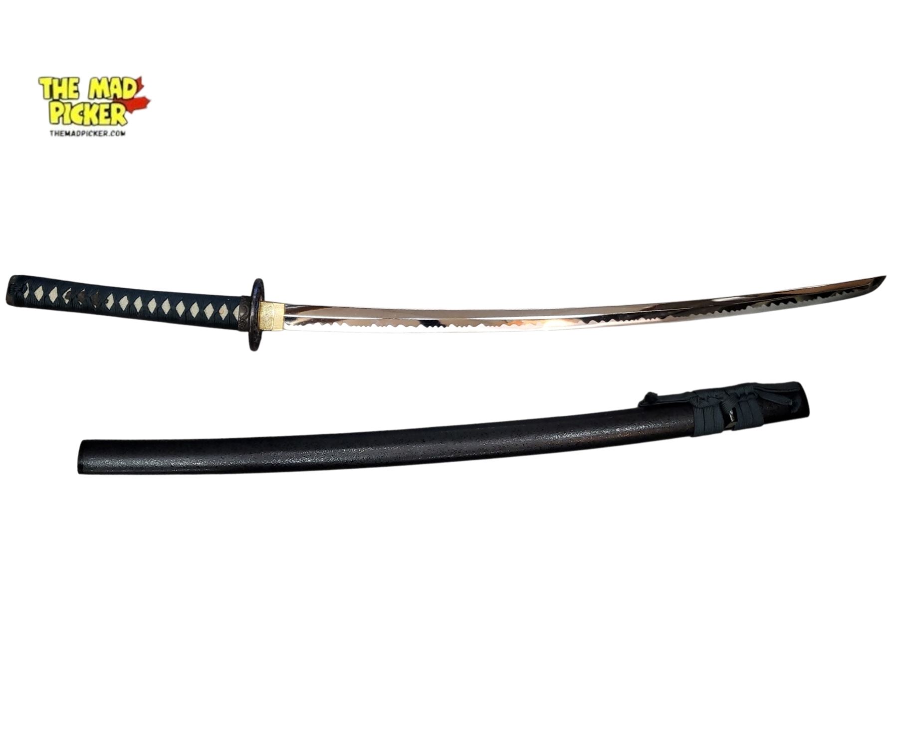 41-inch replica of a traditional Japanese katana. Features a steel blade with a black lacquered scabbard. The handle is wrapped in imitation ray skin with a diamond-patterned cord wrap for an authentic appearance. Designed for decorative purposes, not intended for actual combat or high-impact use.