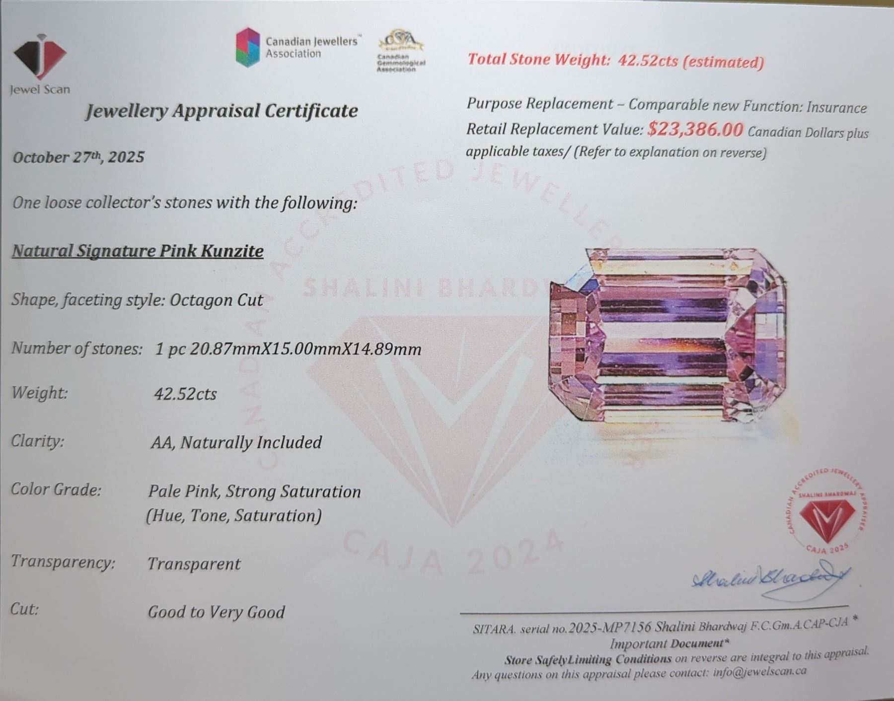 42.52 ct Certified Pink Kunzite gemstone ($23,386 Appraisal)