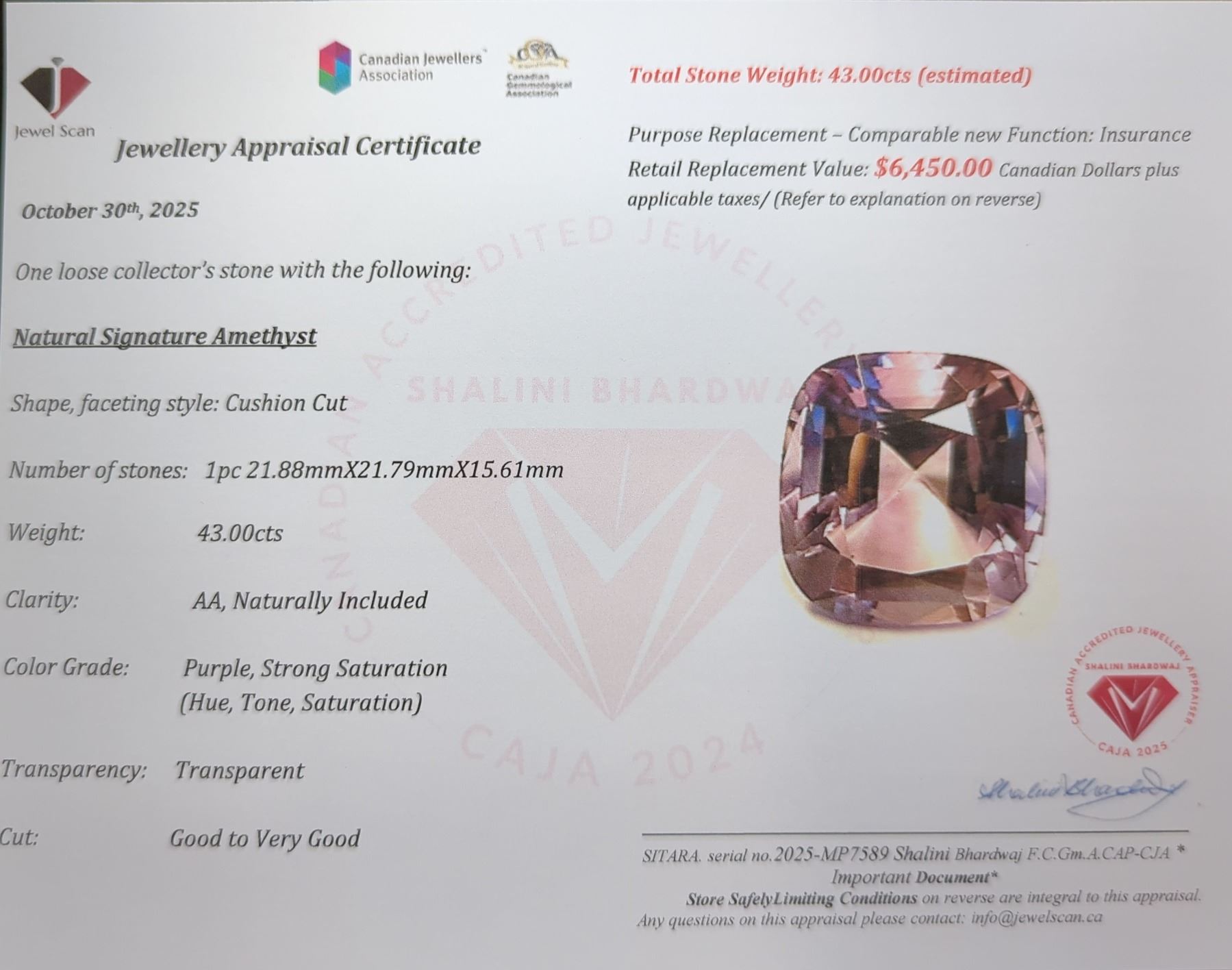 43 ct Certified Amethyst gemstone ($6,450 Appraisal)