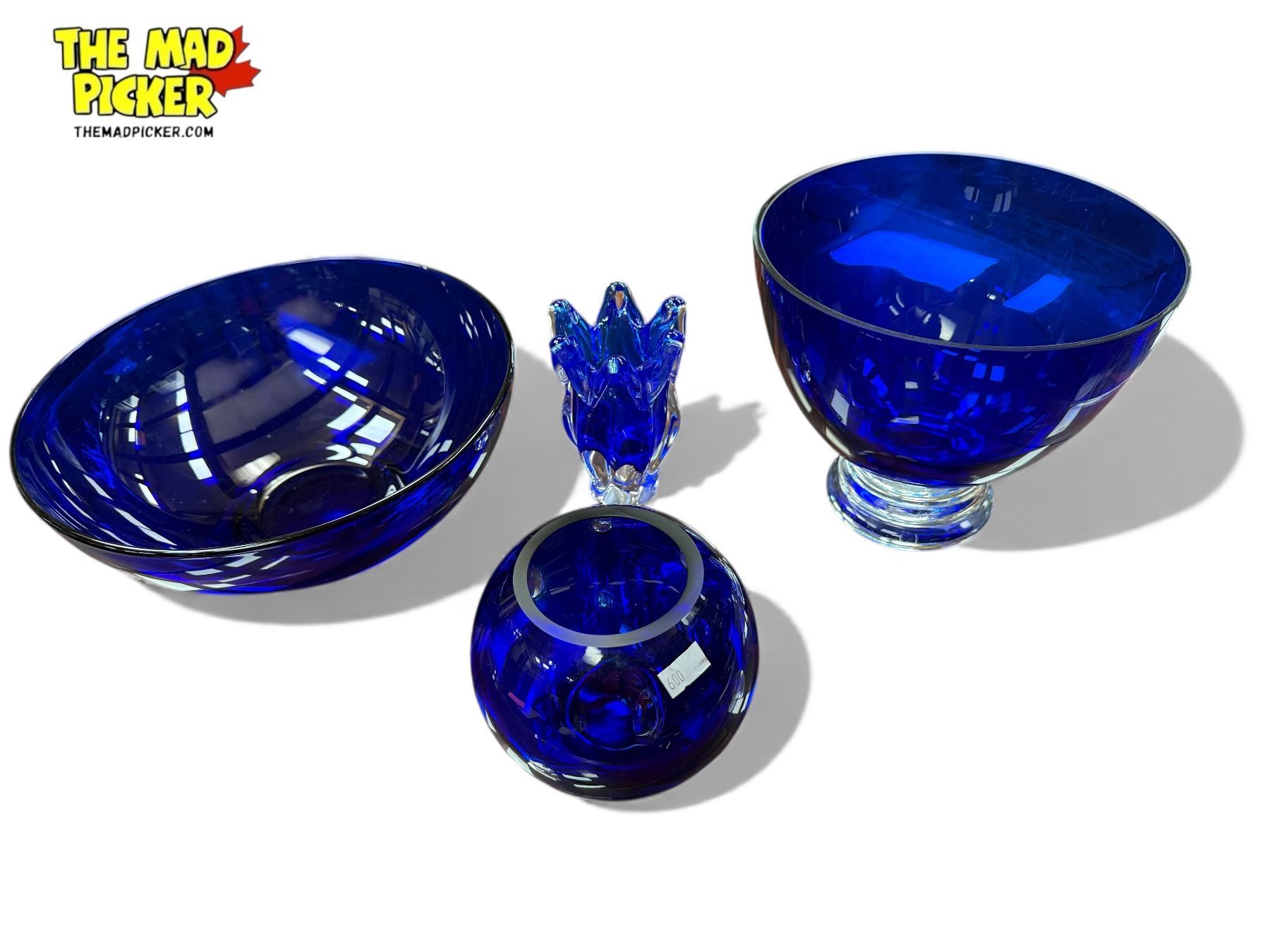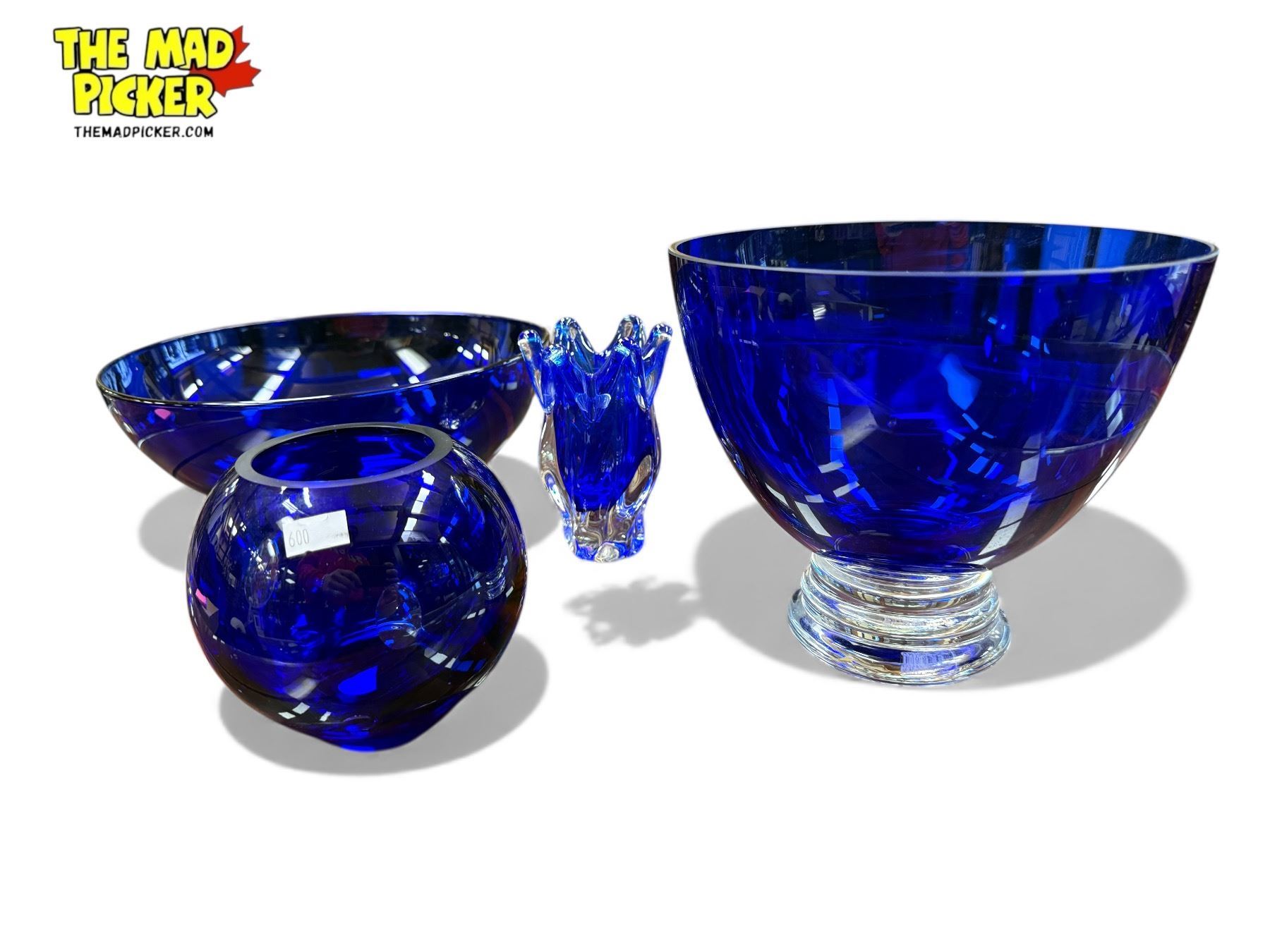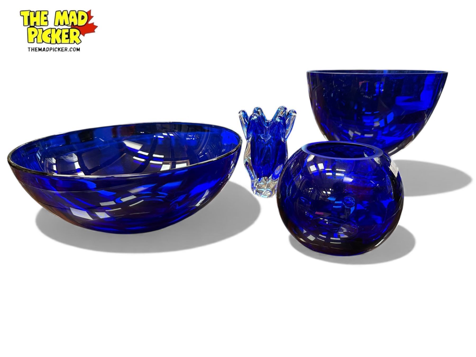 4x Cobalt Blue Glass Collectibles: Vases & Bowl