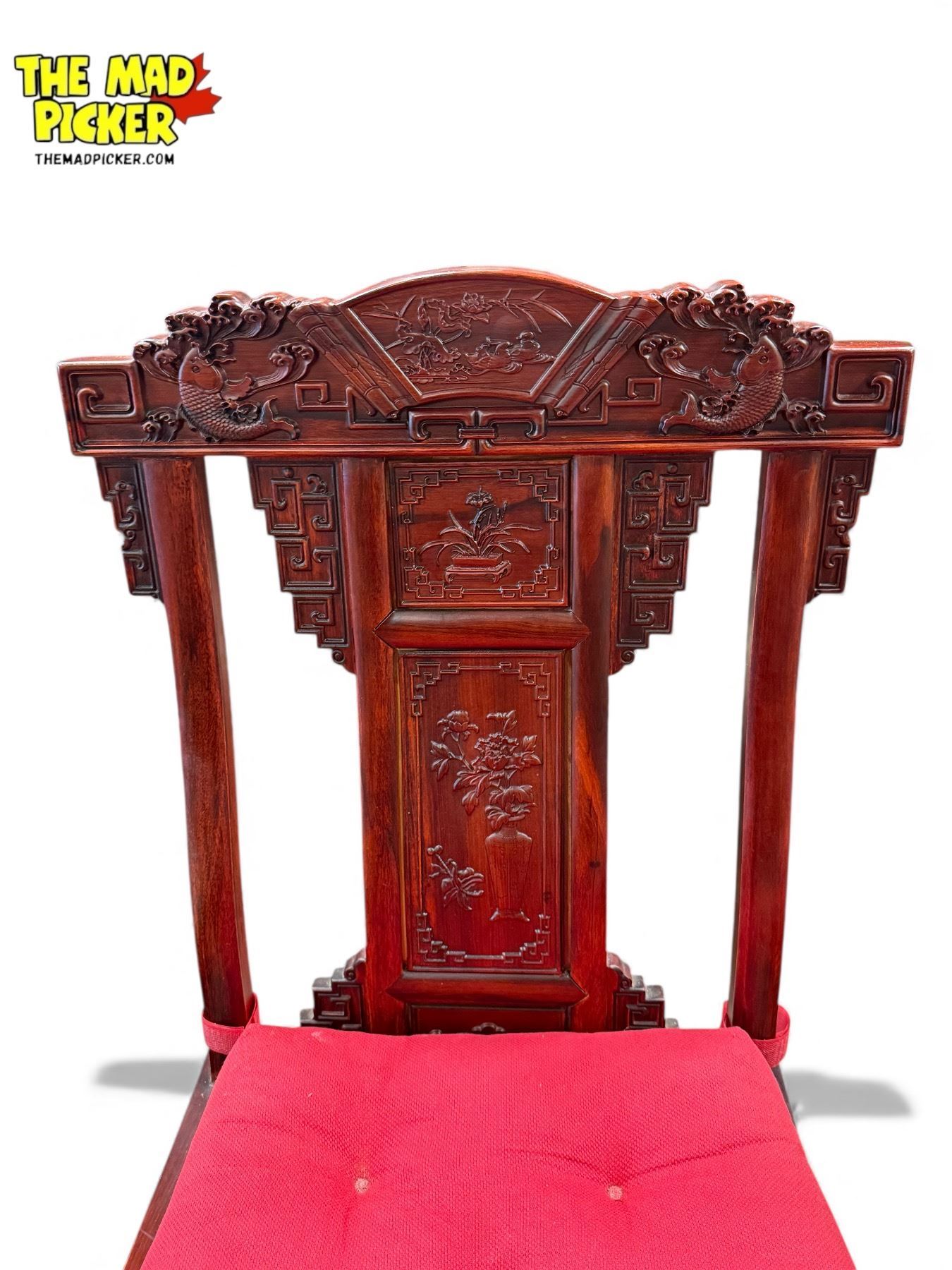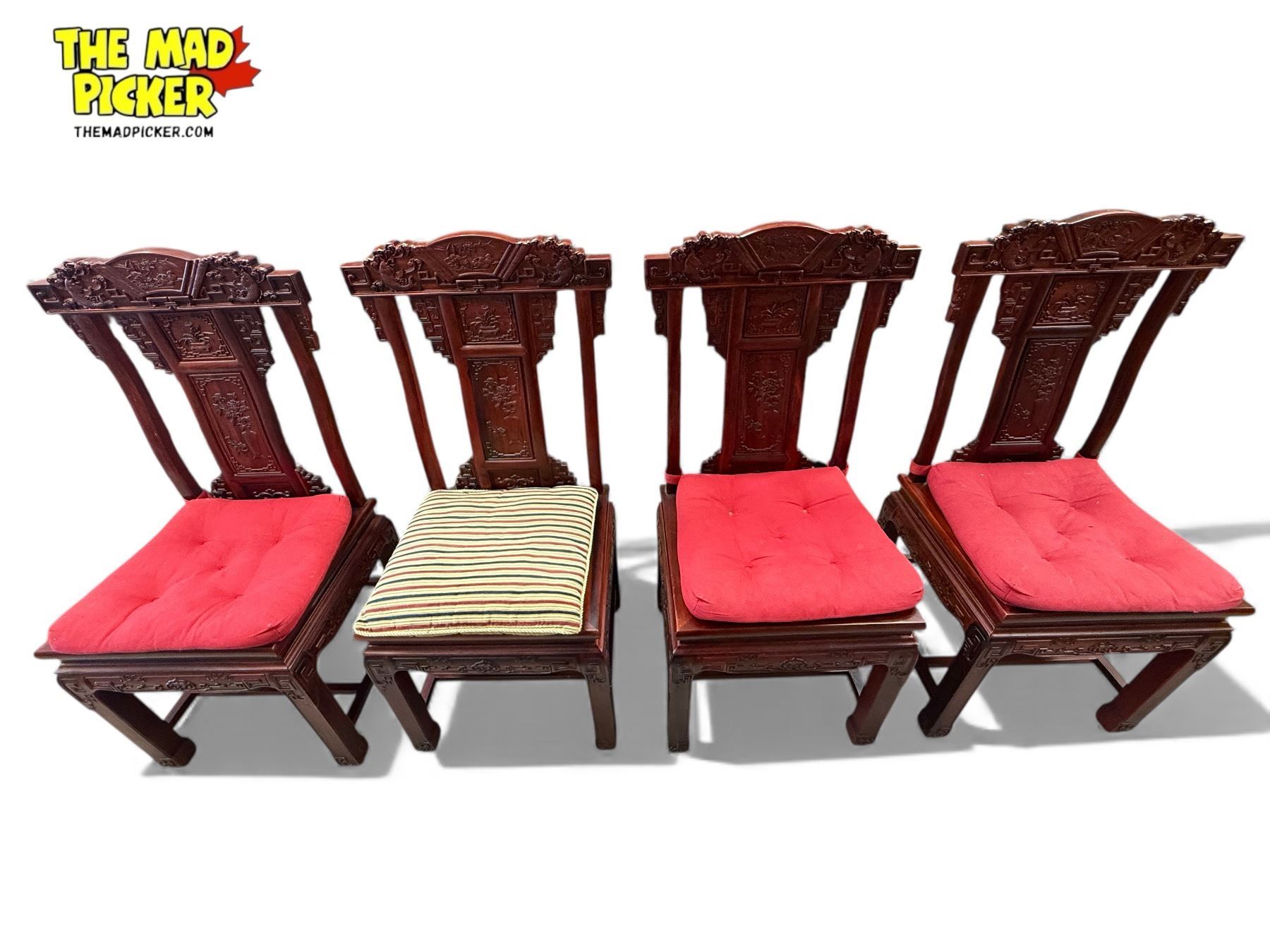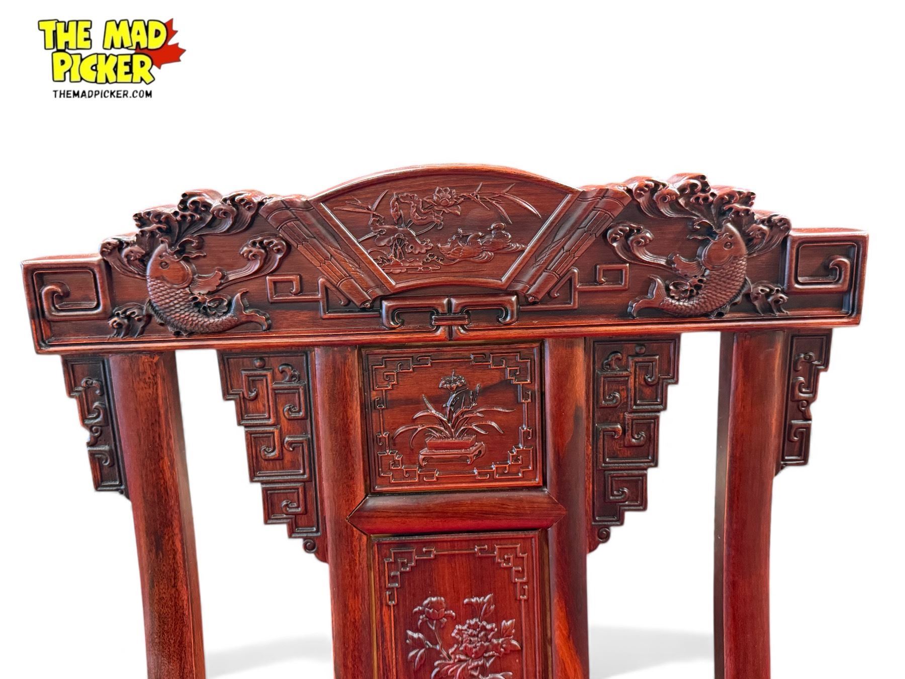 4x Vintage Chinese Rosewood Dining Chairs With Koi Fish, Duck, & Floral Details