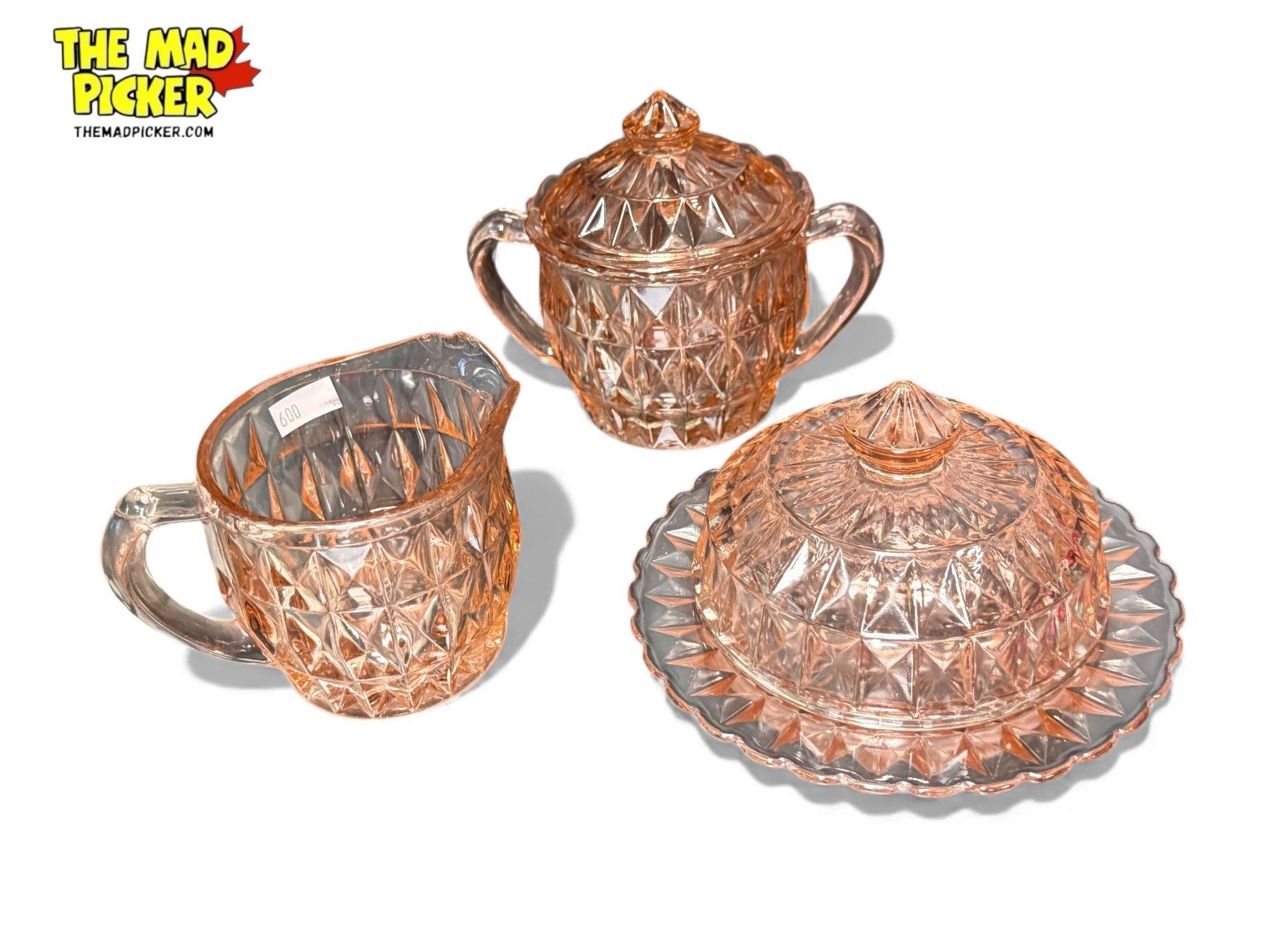 4x Vintage Glassware Collectibles: Depression Pink Creamer, Sugar, Butter Dish, & Yellow Bowl