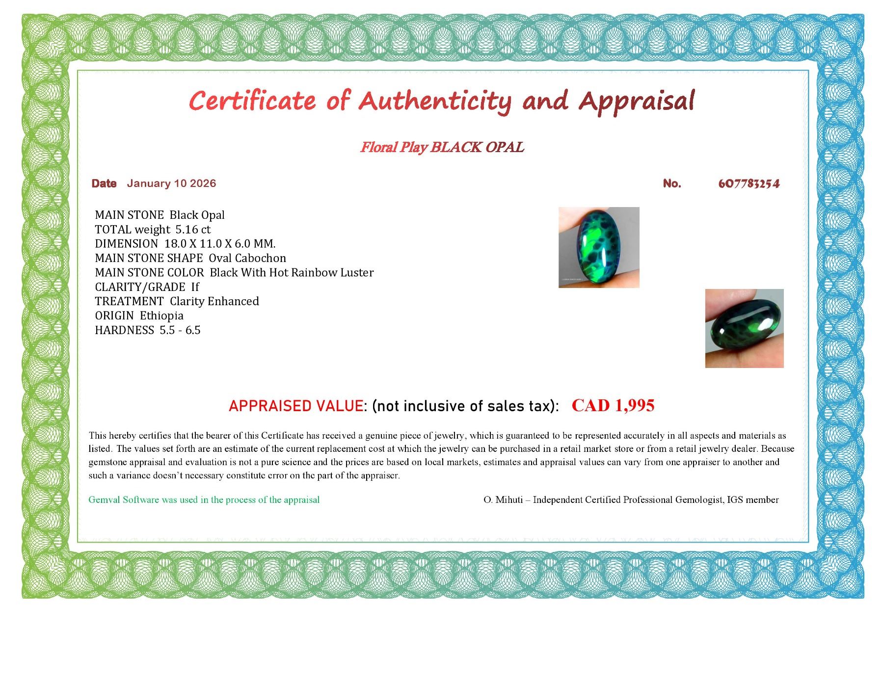 5,15 CARATS OVAL CUT CABOCHON AAA RARE FLORAL PLAY OF COLOR BLACK OPAL ETHIOPIA 18X11 mm - APPRAISED REPLACEMENT VALUE CAD $1,995