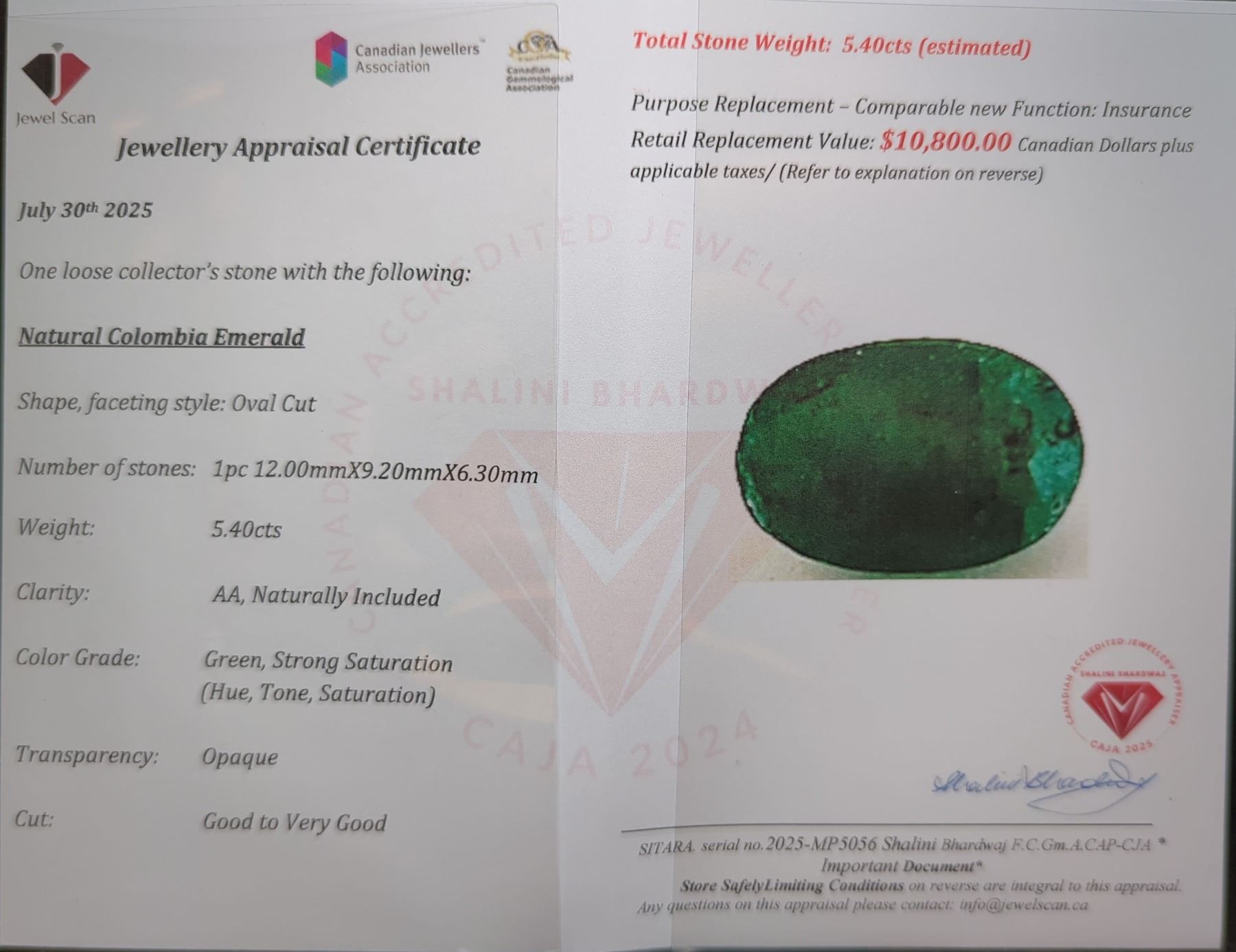 5.4 ct Authenticated Emerald gemstone ($10,800 Appraisal)