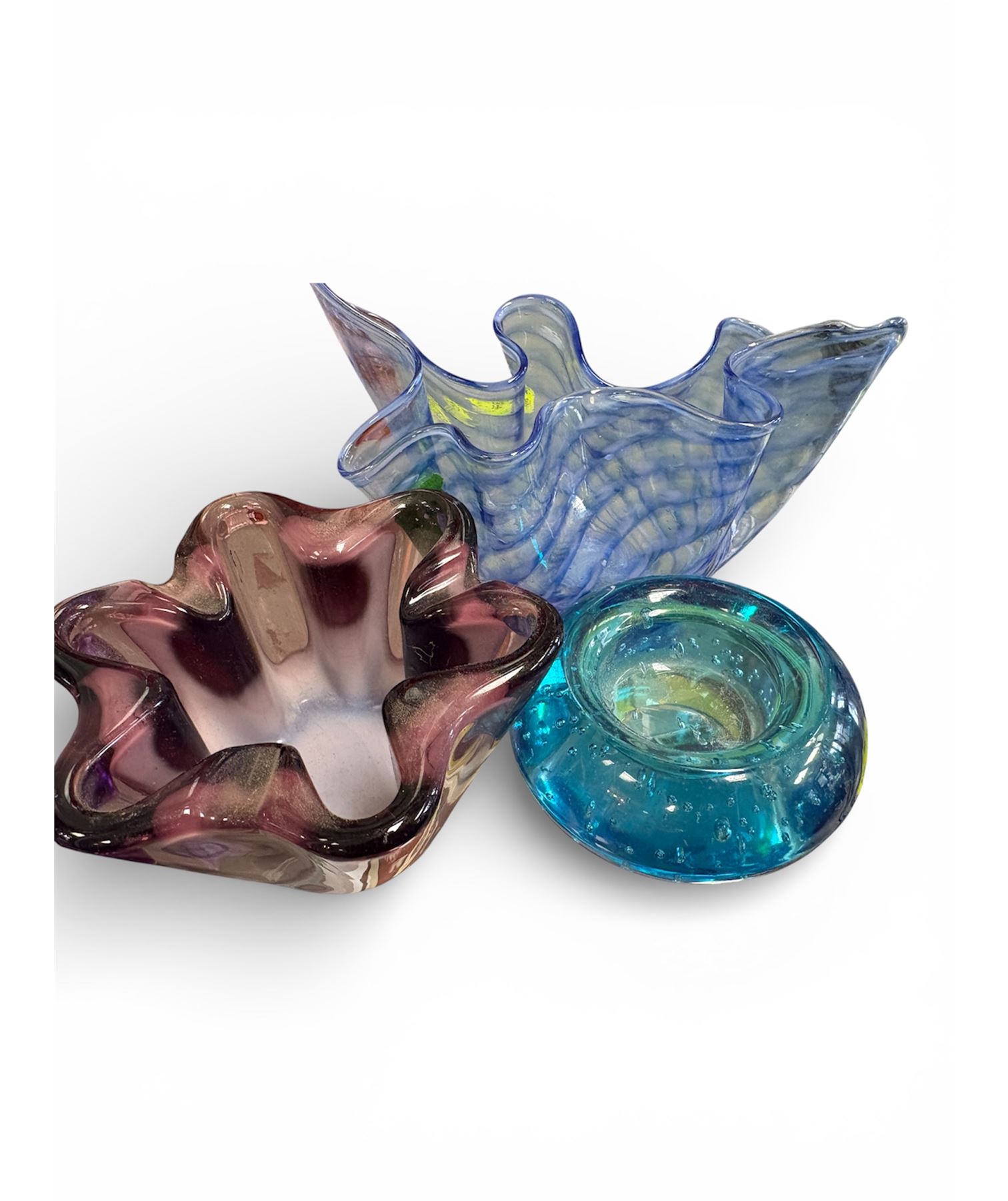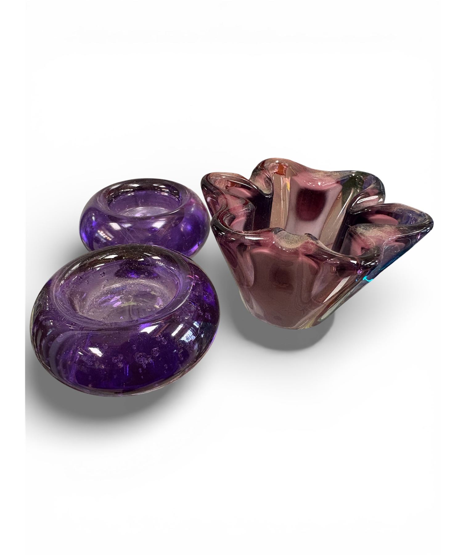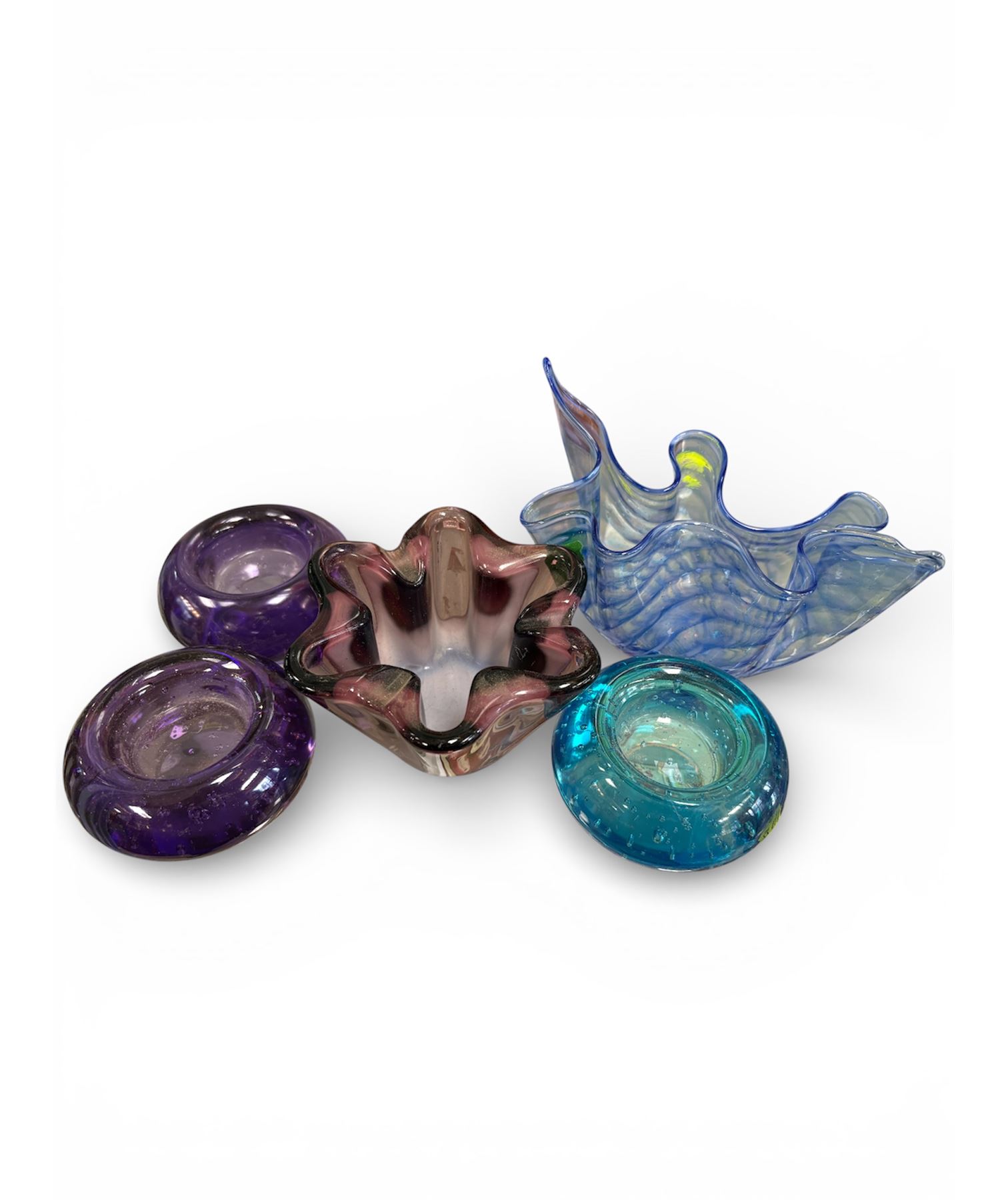 Five-piece art glass collection includes an Arte Vargas blue catchall, 4.75 inches tall, known for its hand-blown craftsmanship. Three matching candlestick holders and one striking purple vase complete the set. Vibrant colors and diverse shapes highlight the artistry in blown glassware.