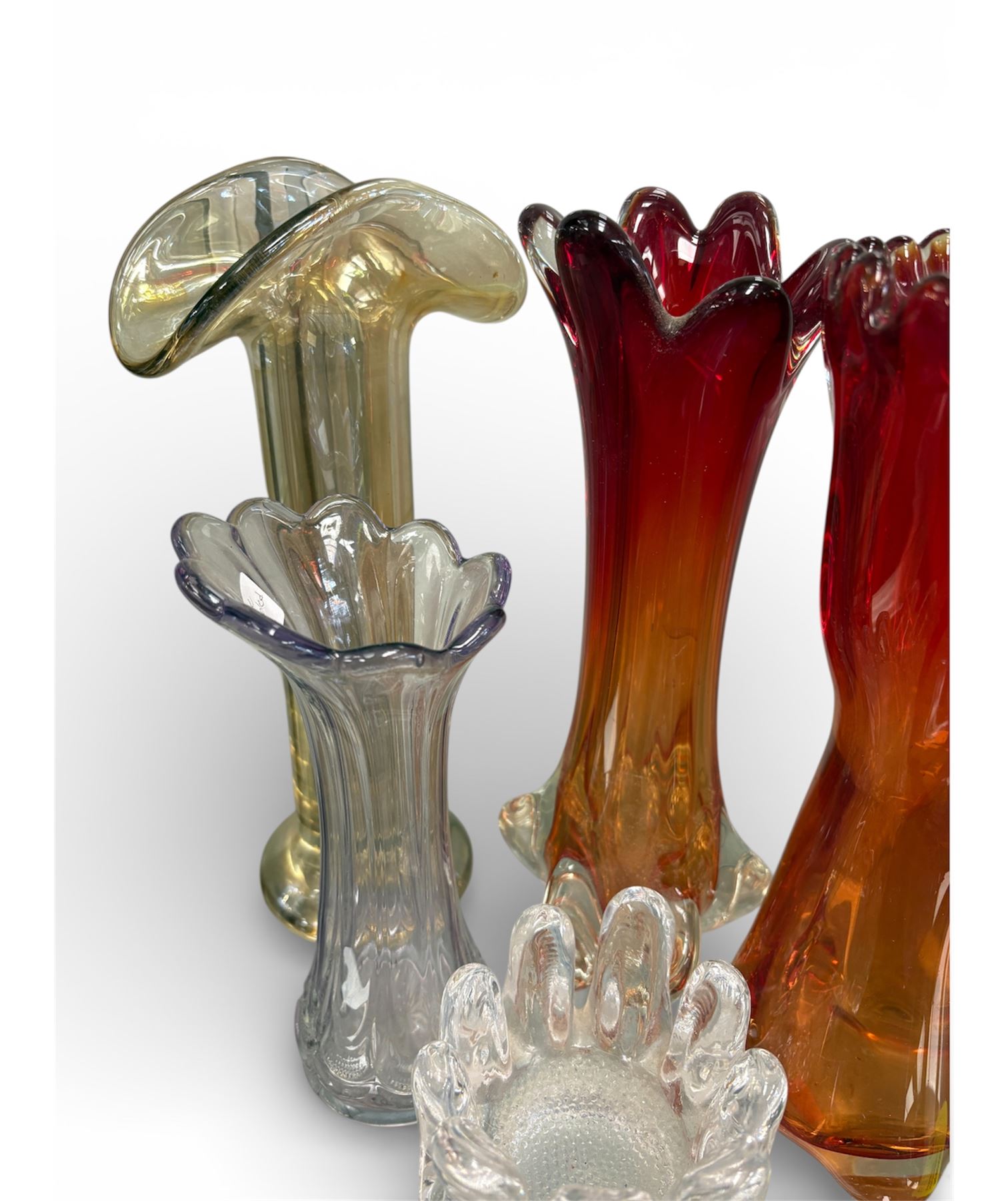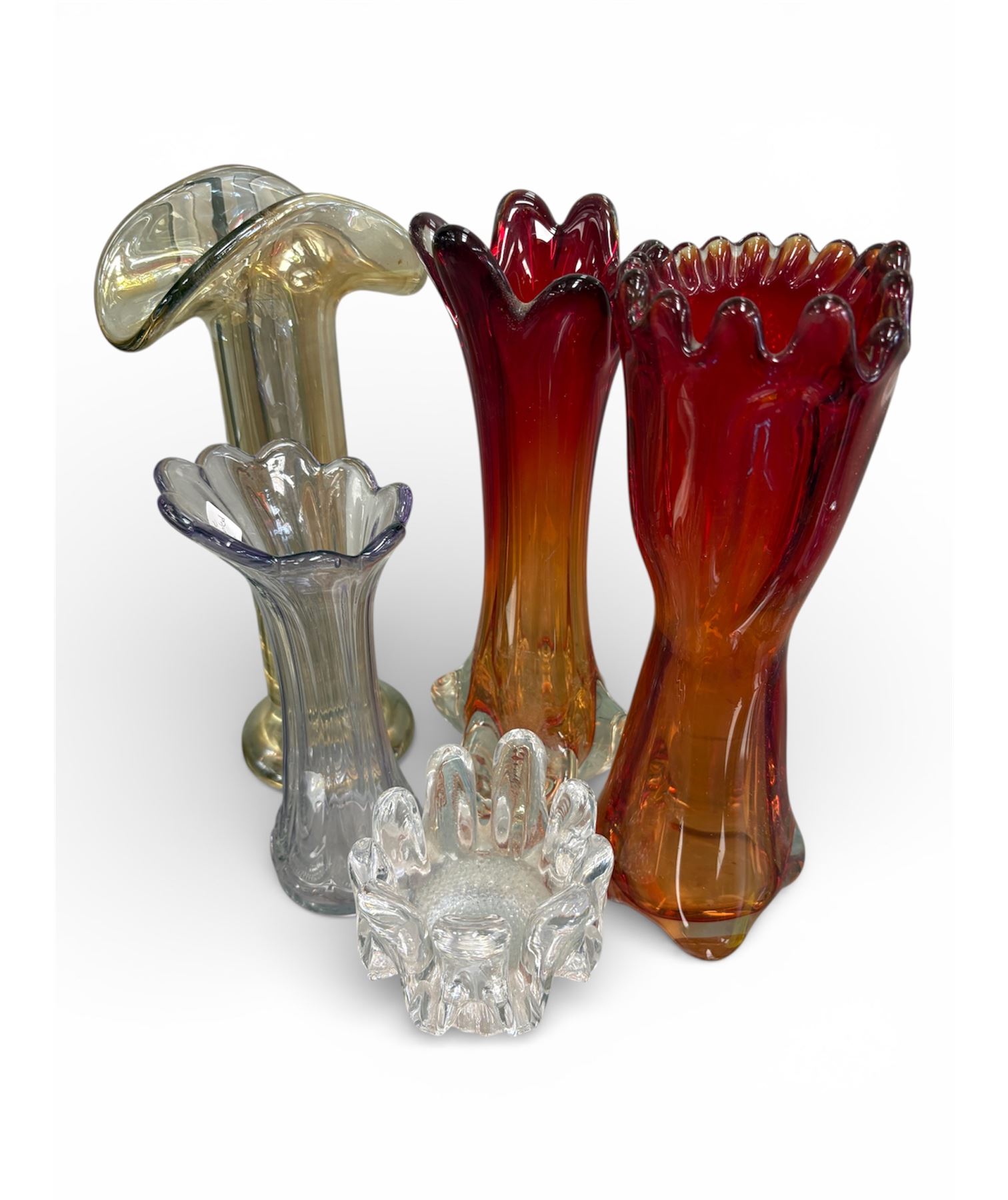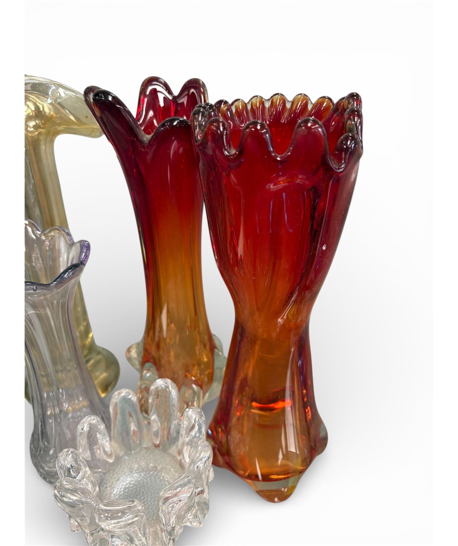 5-piece art glass collection created circa 1960s-1970s, these pieces are inspired by Murano craftsmanship. Each displays vibrant colors and artisanal techniques reflective of mid-20th century glass artistry.