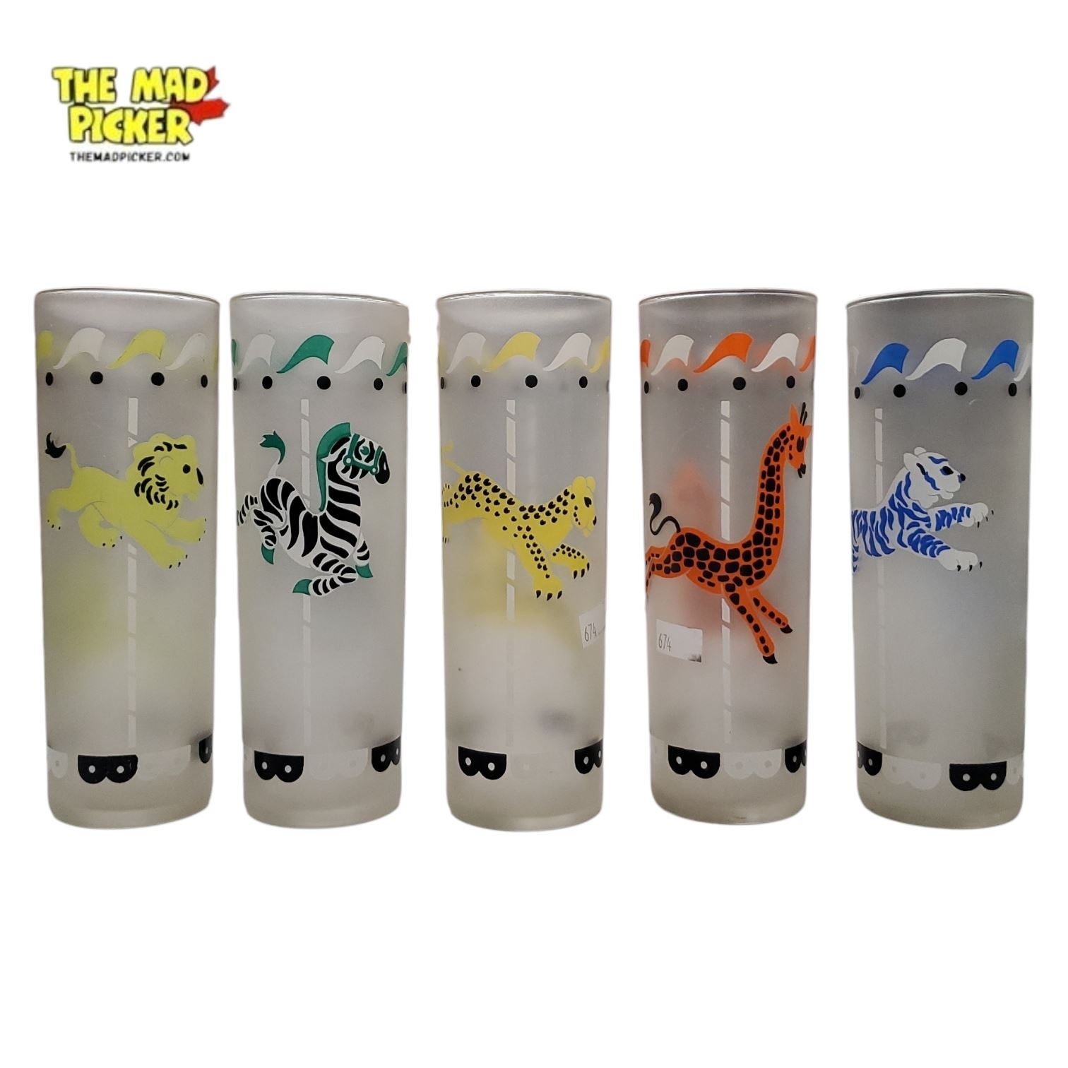 5-Piece Set of 1950s Libbey 'Merry-Go-Round' Frosted Highball Glasses Features colorful, detailed circus carousel horse designs on frosted glass. Each glass showcases a unique horse with vibrant accents. Classic mid-century Libbey glassware.