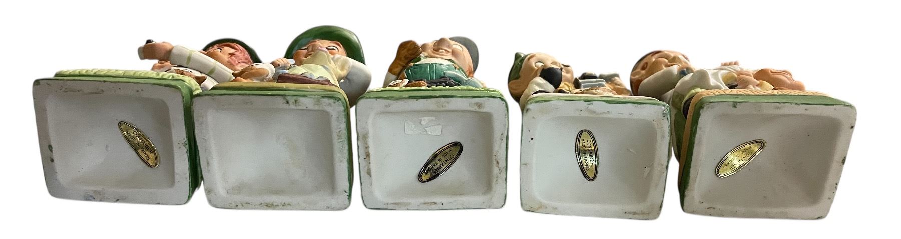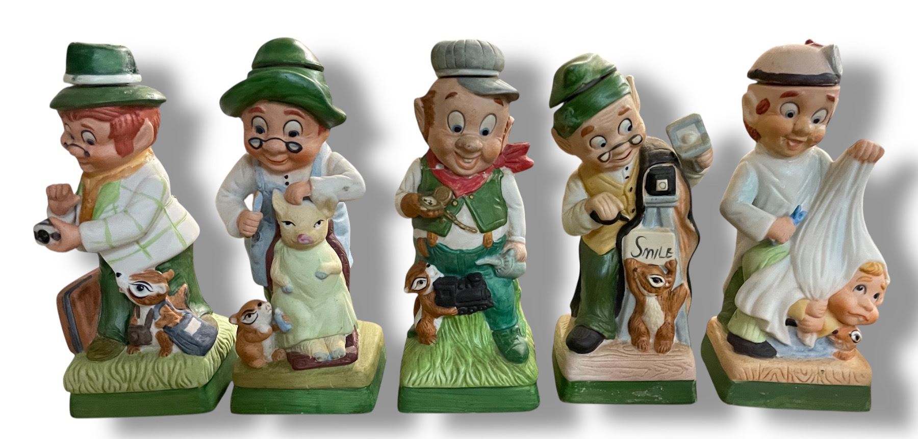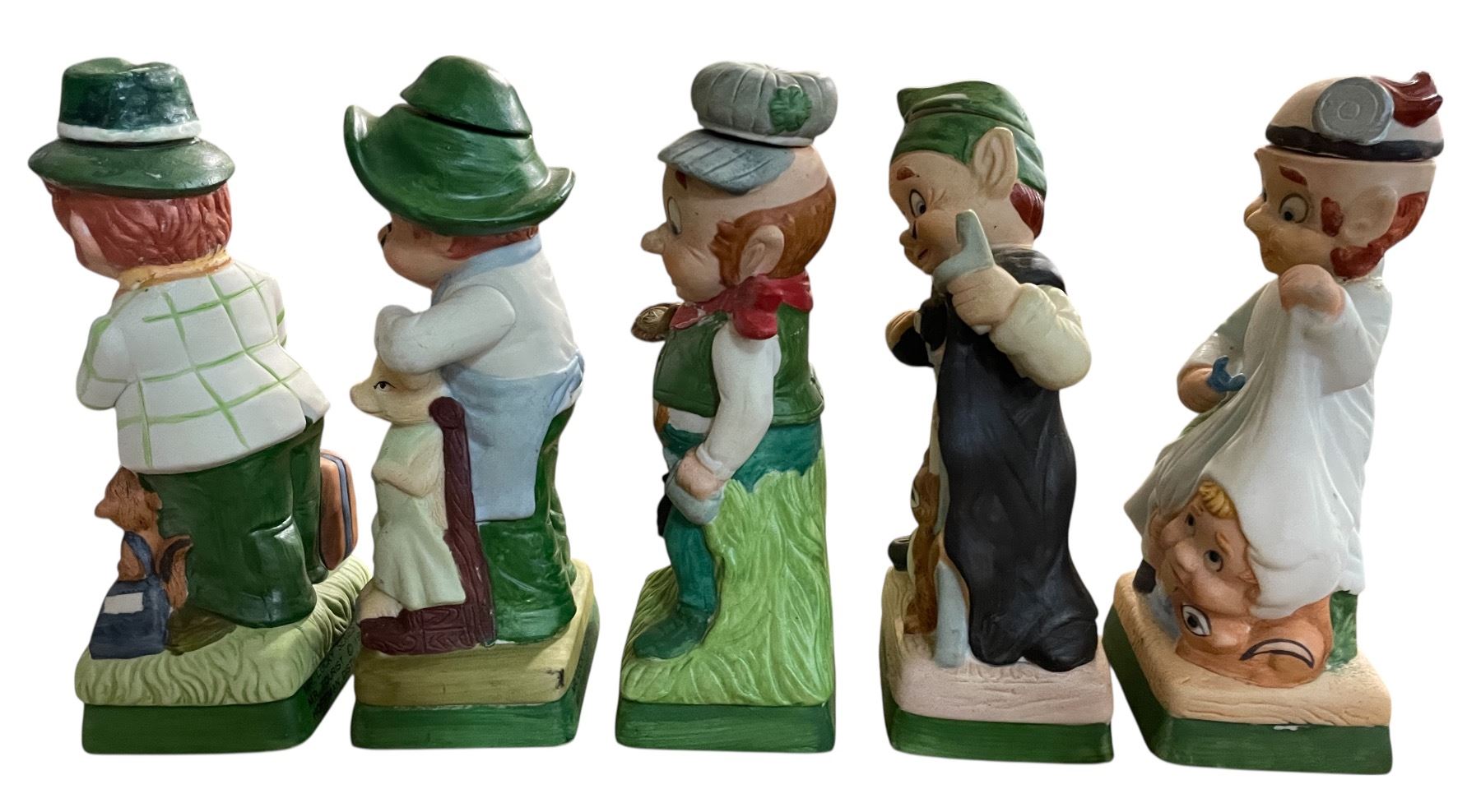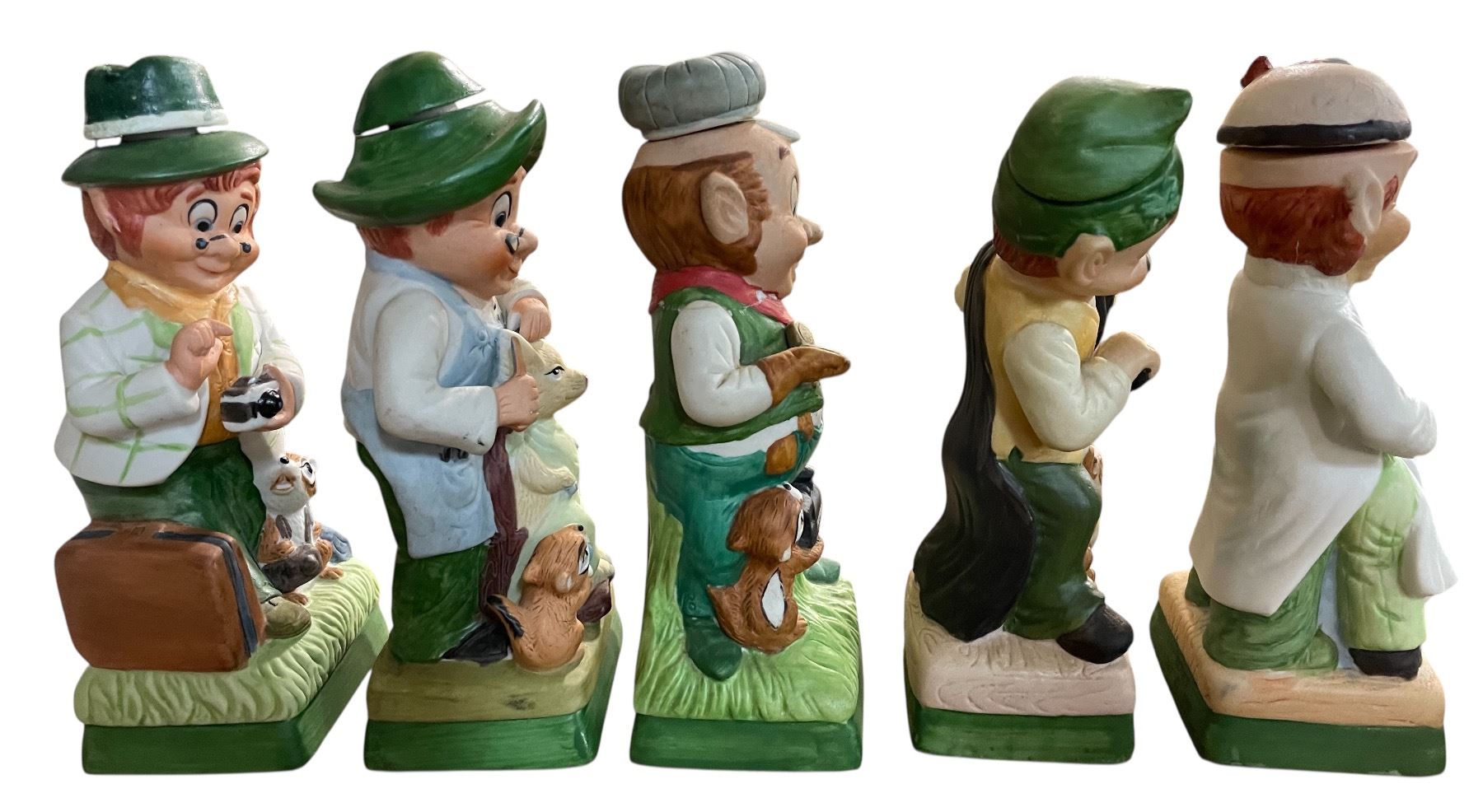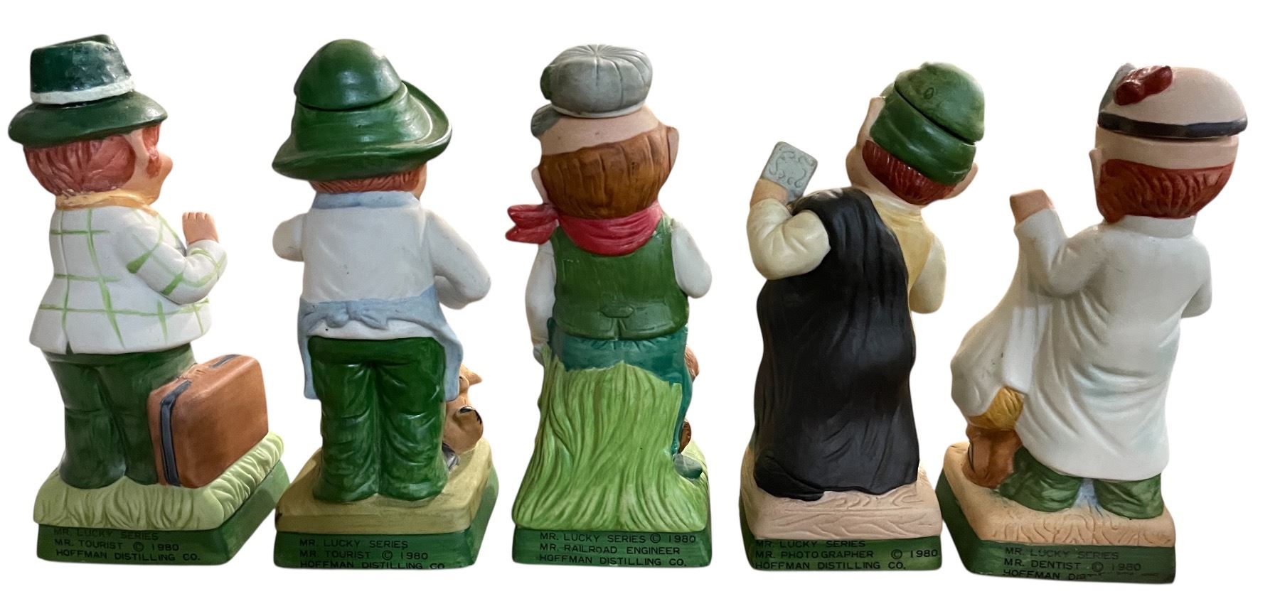 5 Vintage 1980 Hoffman Ceramic Whiskey Decanters Empty, Includes "Mr. Tourist", "Mr. Farmer", "Mr. Railroad Engineer ", "Mr. Photographer", and "Mr. Dentist"