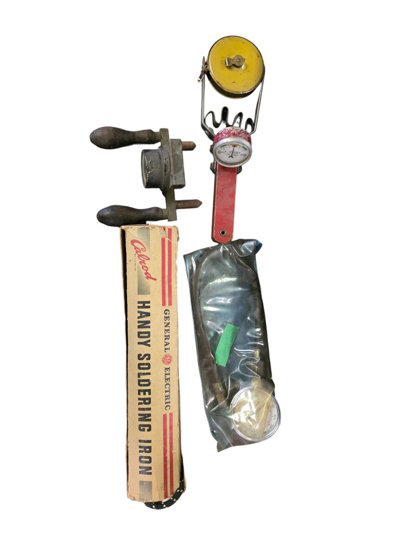 5 Vintage Tools Includes GE Handy Soldering Iron, 2 Battery Cell Tester, Gauge