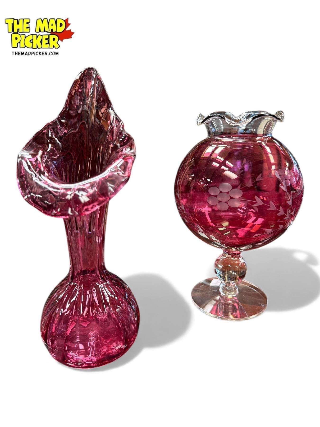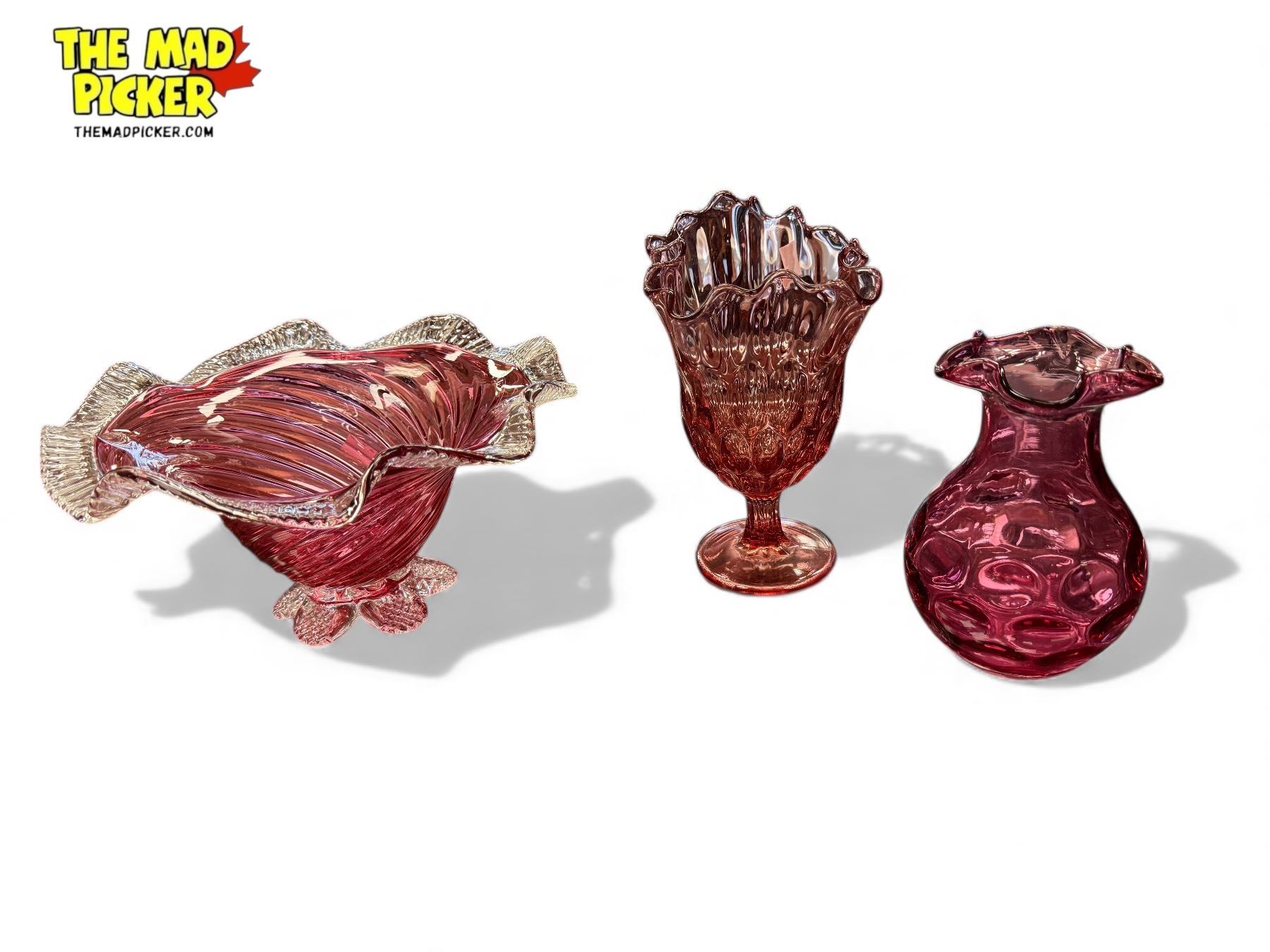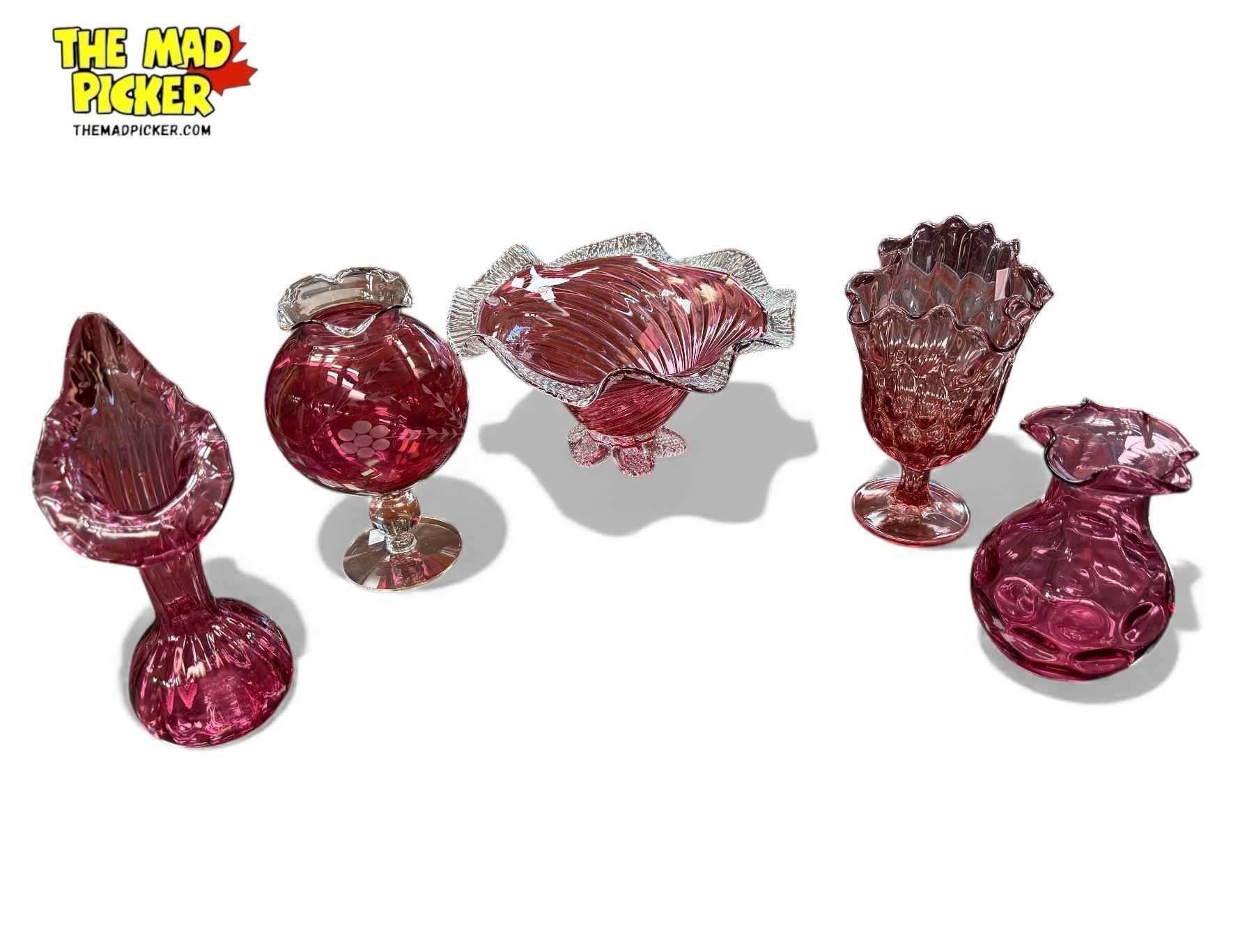 5x Vintage Cranberry Glass Collectibles: Vases & Bowl