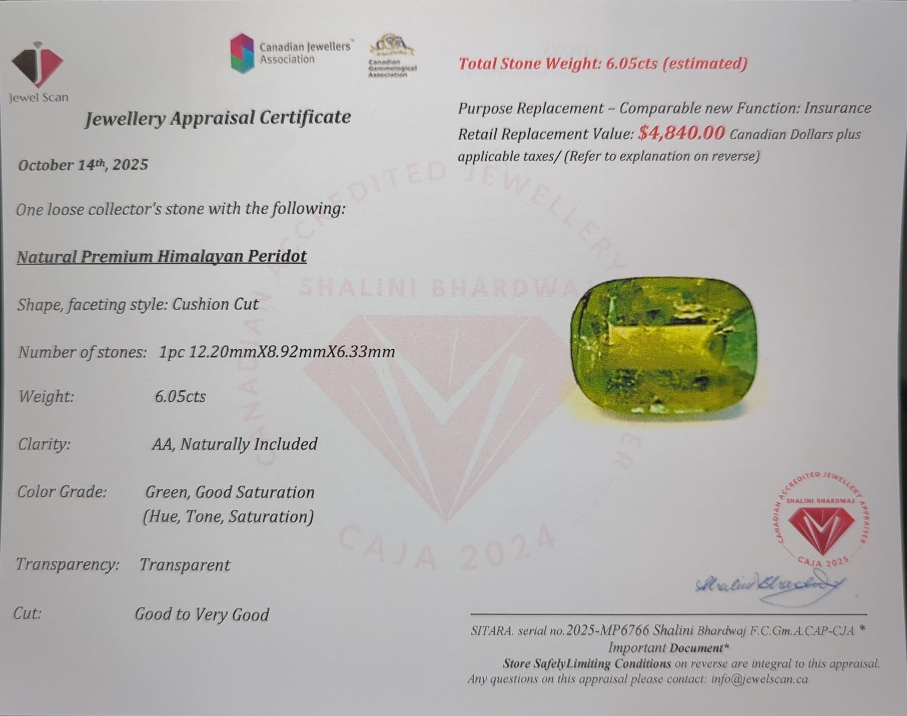6.05 ct Certified Himalayan Peridot gemstone ($4,840 Appraisal)