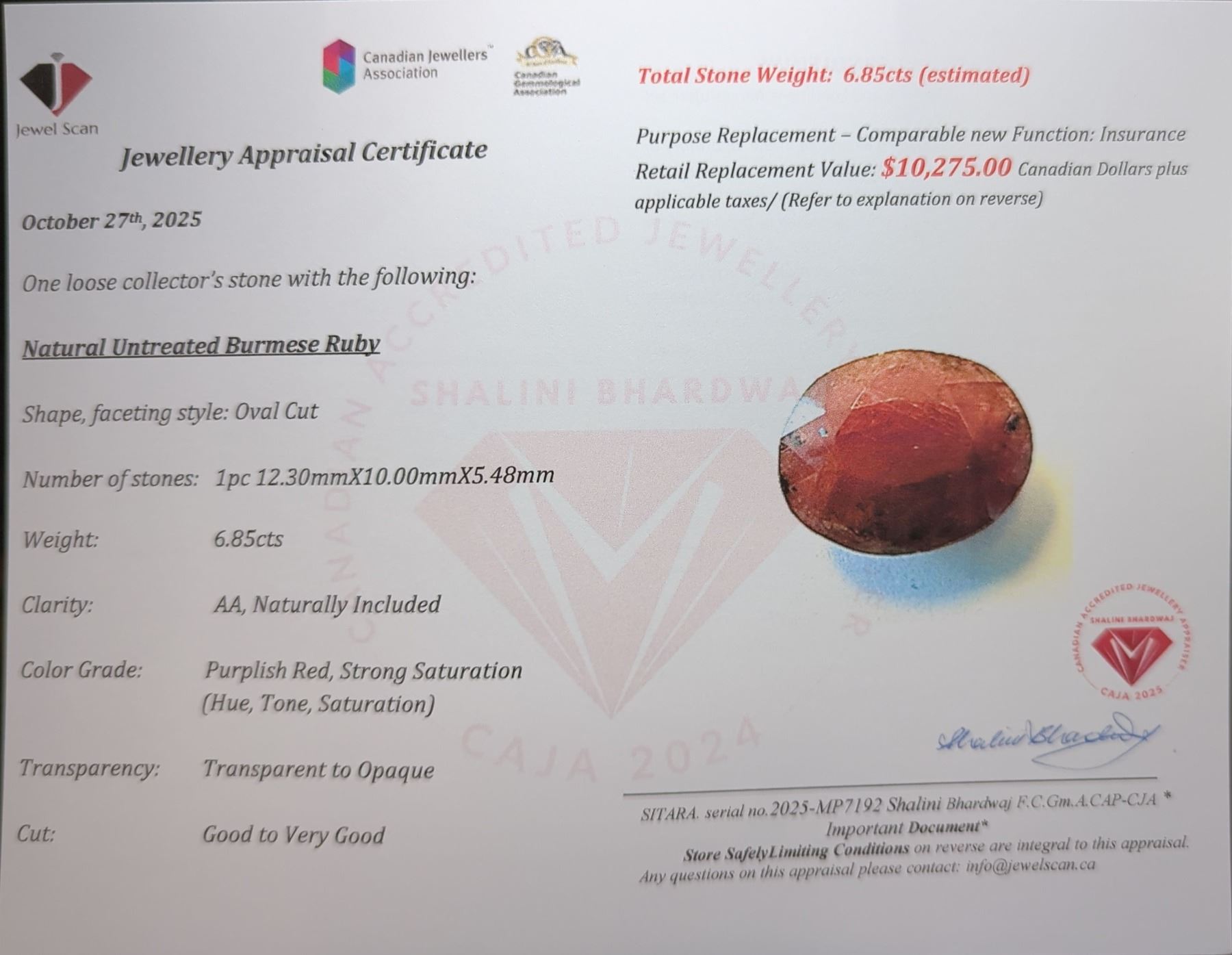 6.85 ct Certified Untreated Ruby gemstone ($10,275 Appraisal)