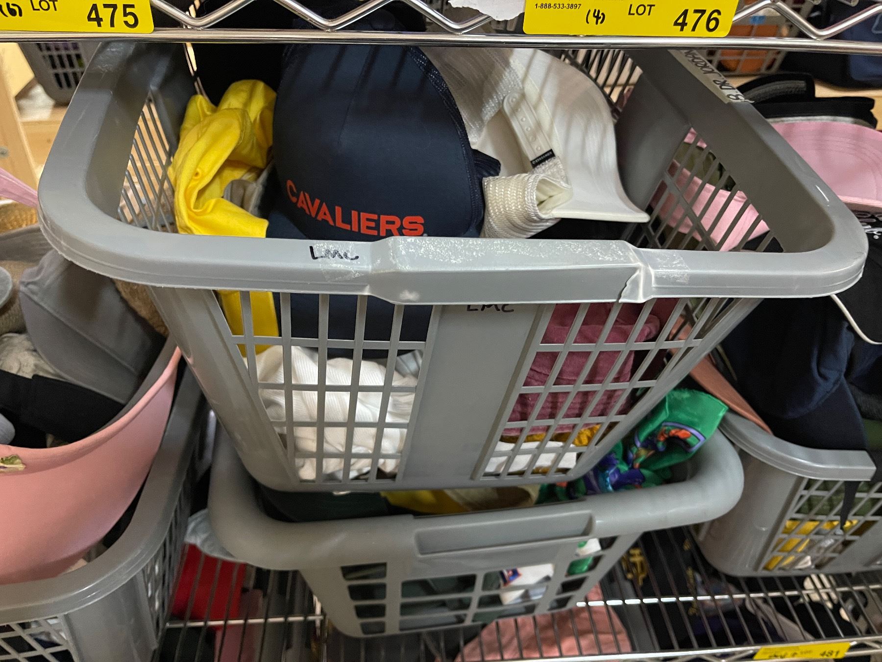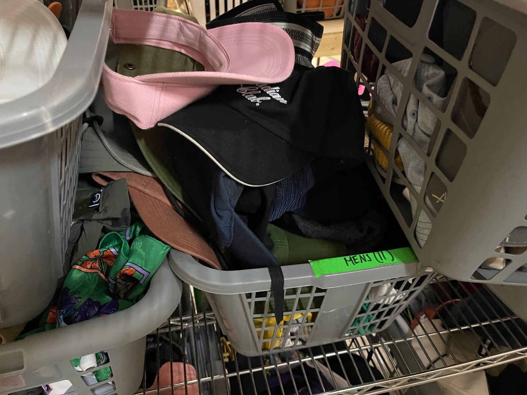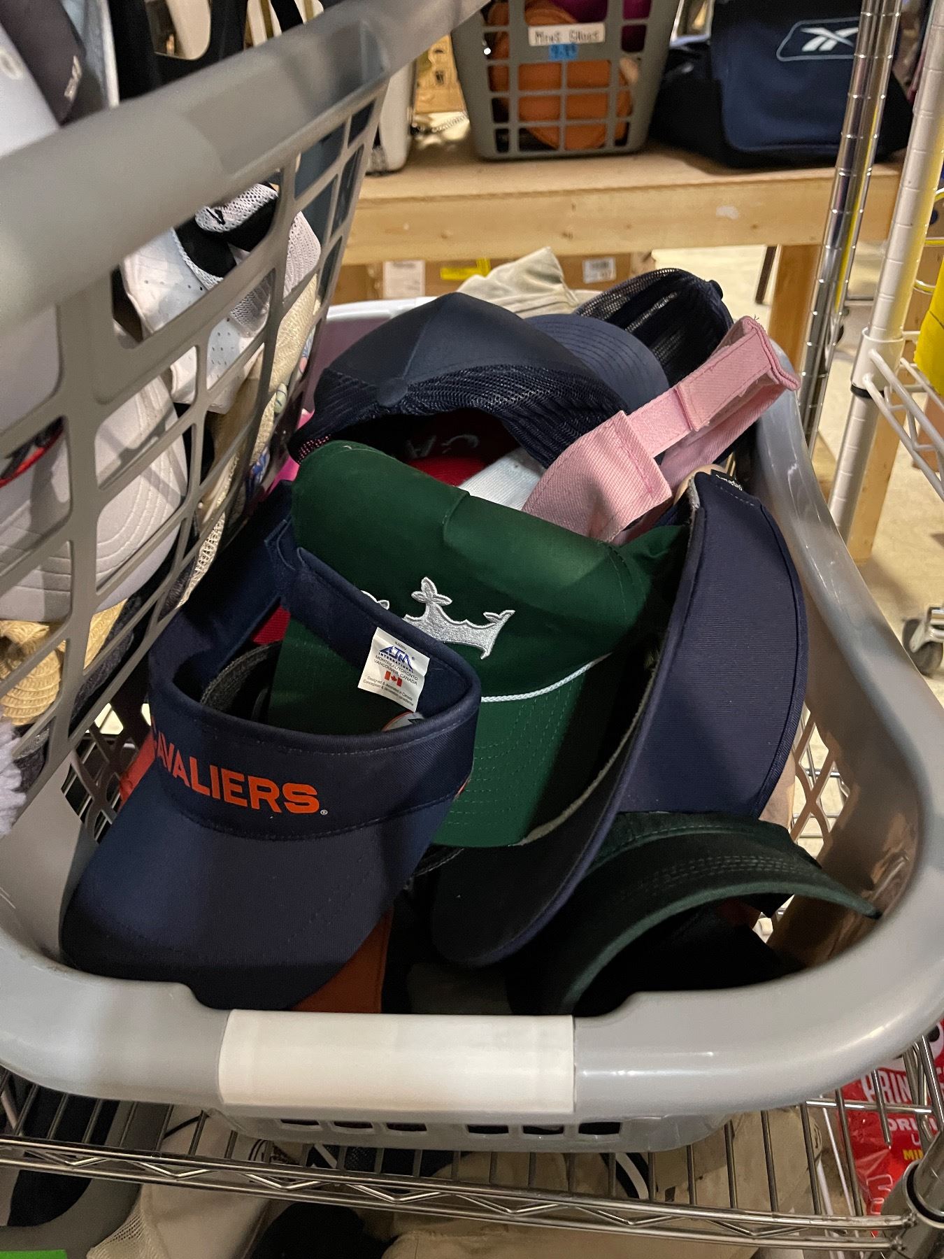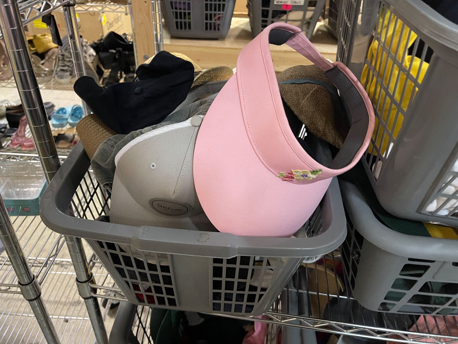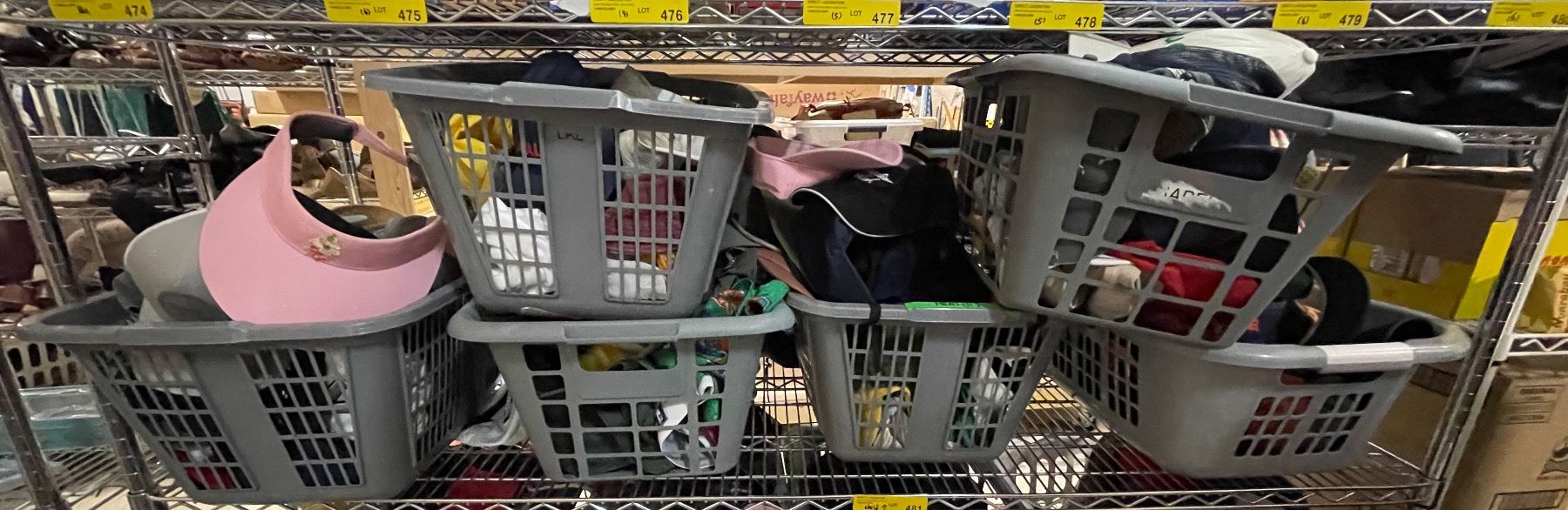 6 Baskets of Assorted Hats and Caps Includes Sun Hats, Baseball Caps, and More
