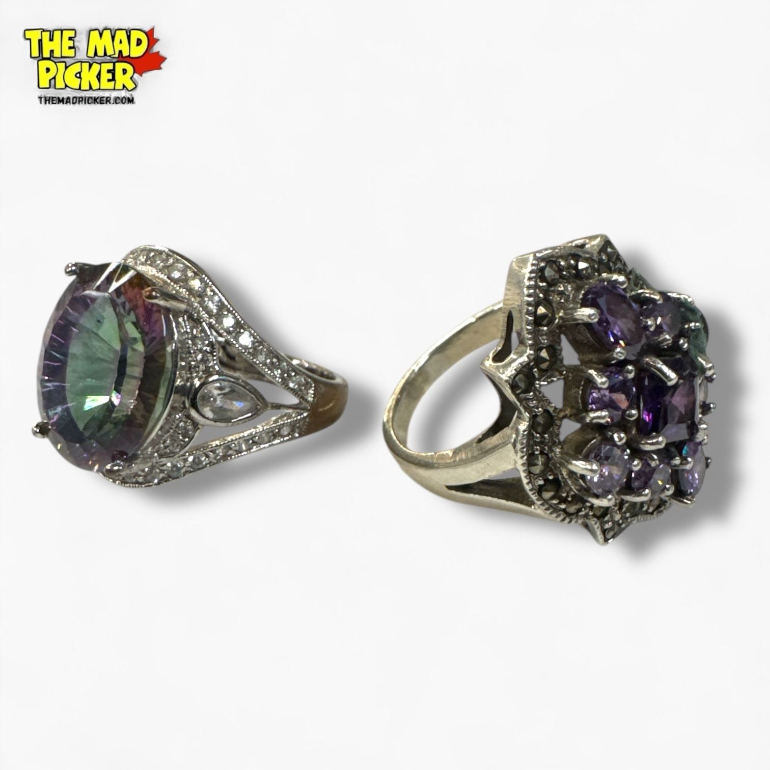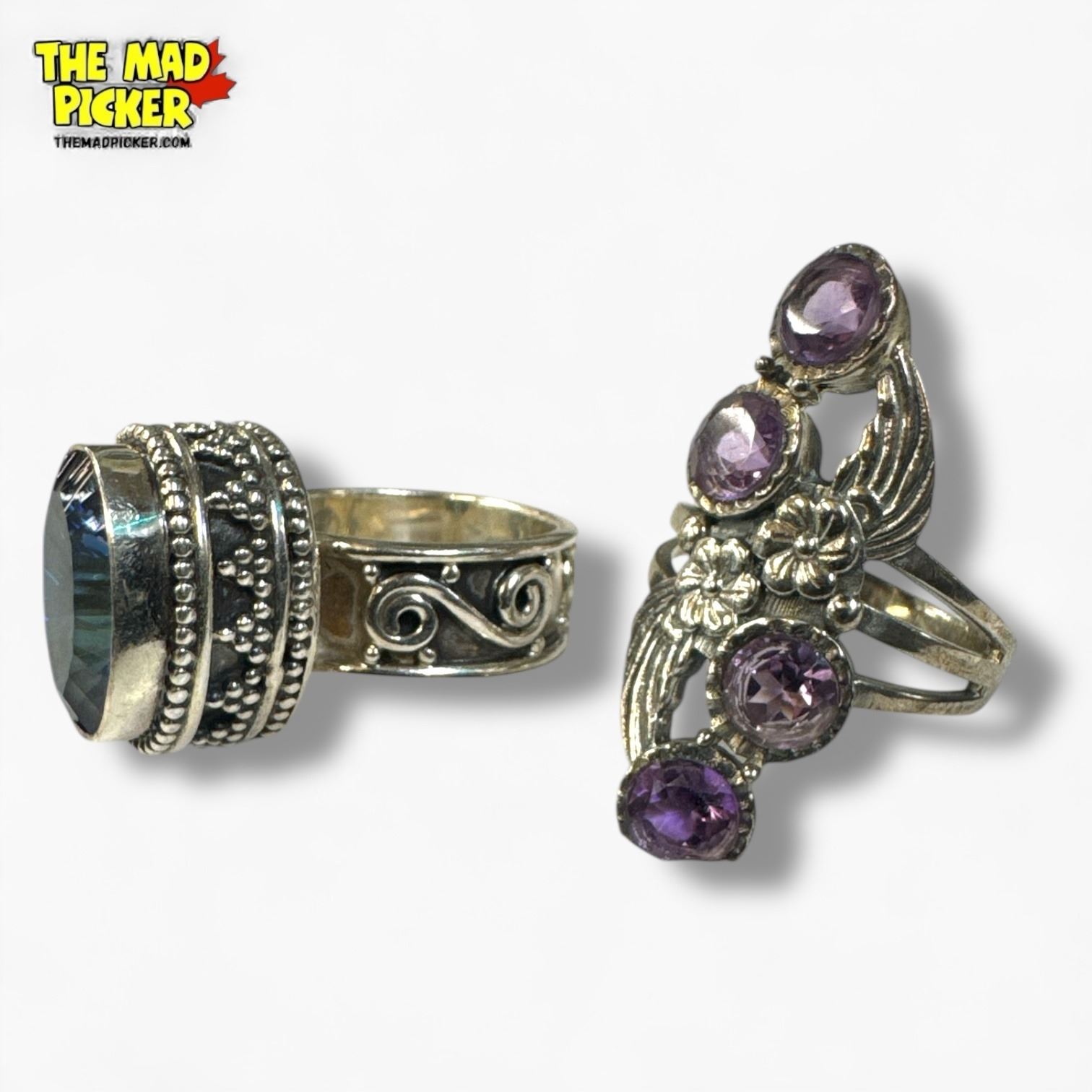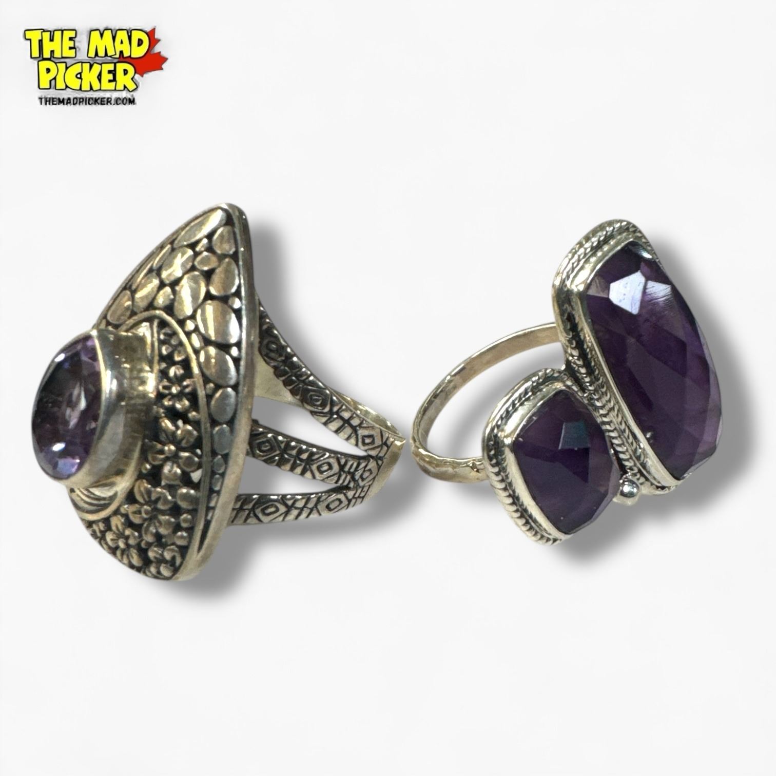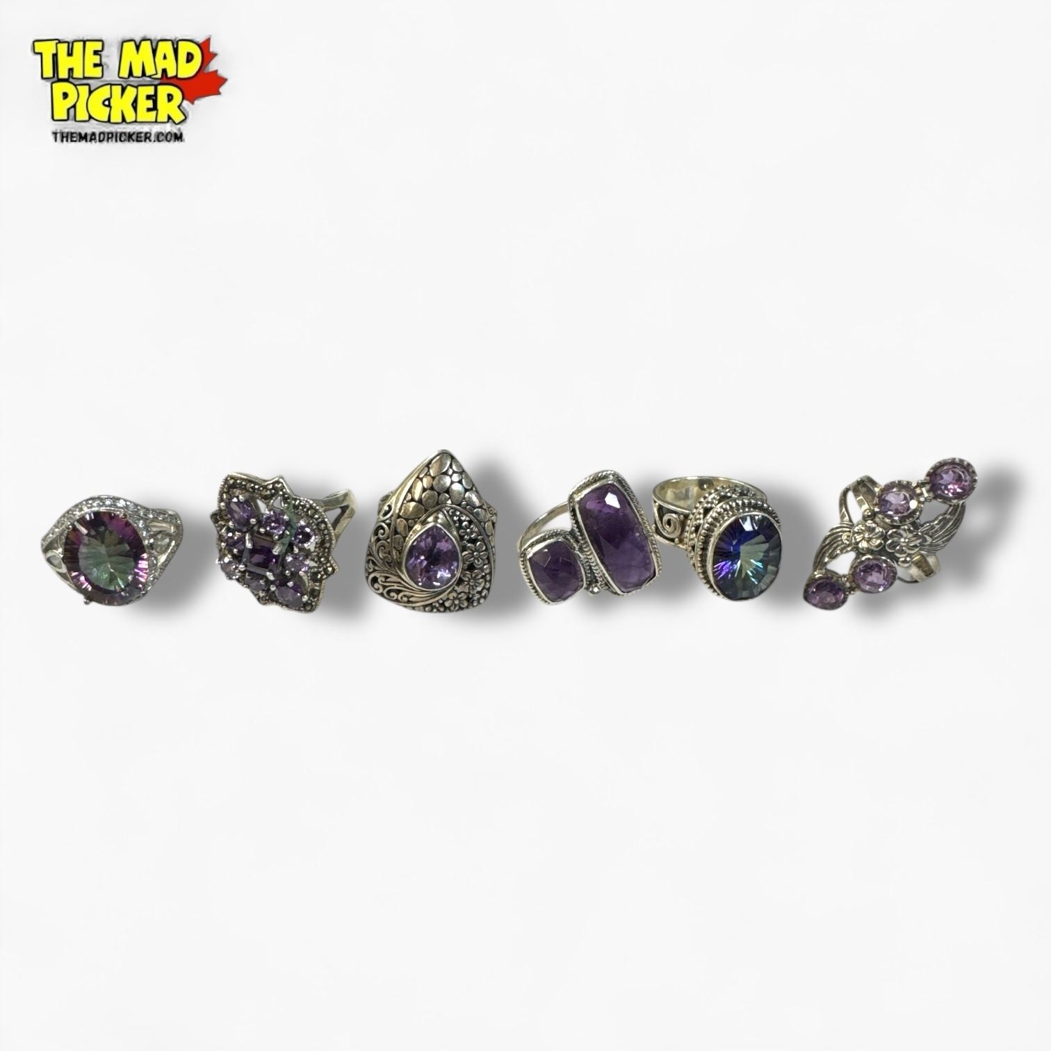 6 New .925 Sterling Silver Amethyst Rings - Longest ring is 35.5 mm long - Total Weight: 57.8 grams