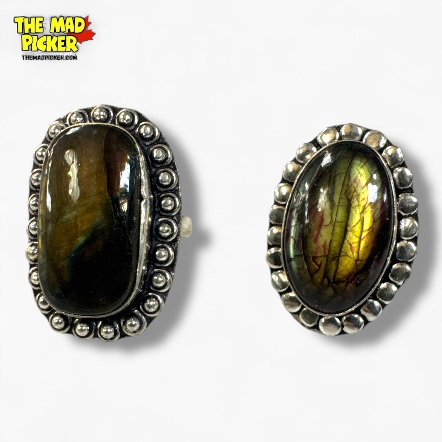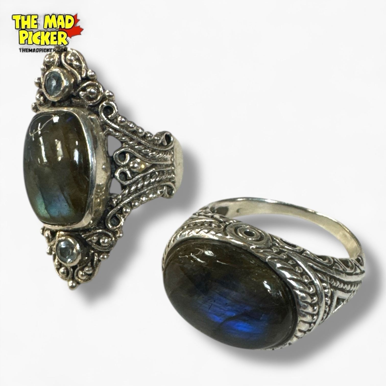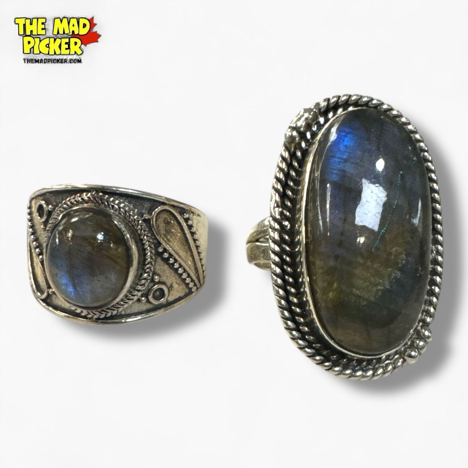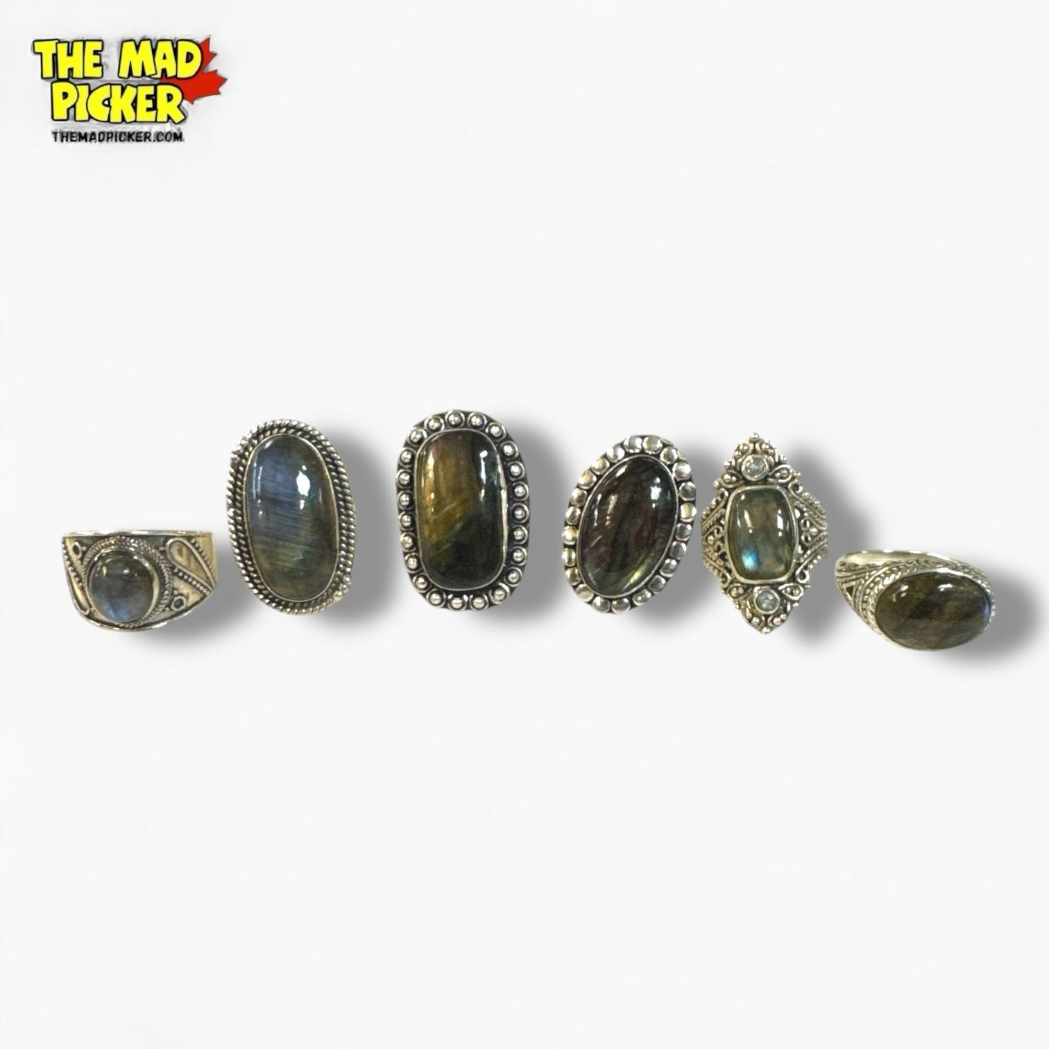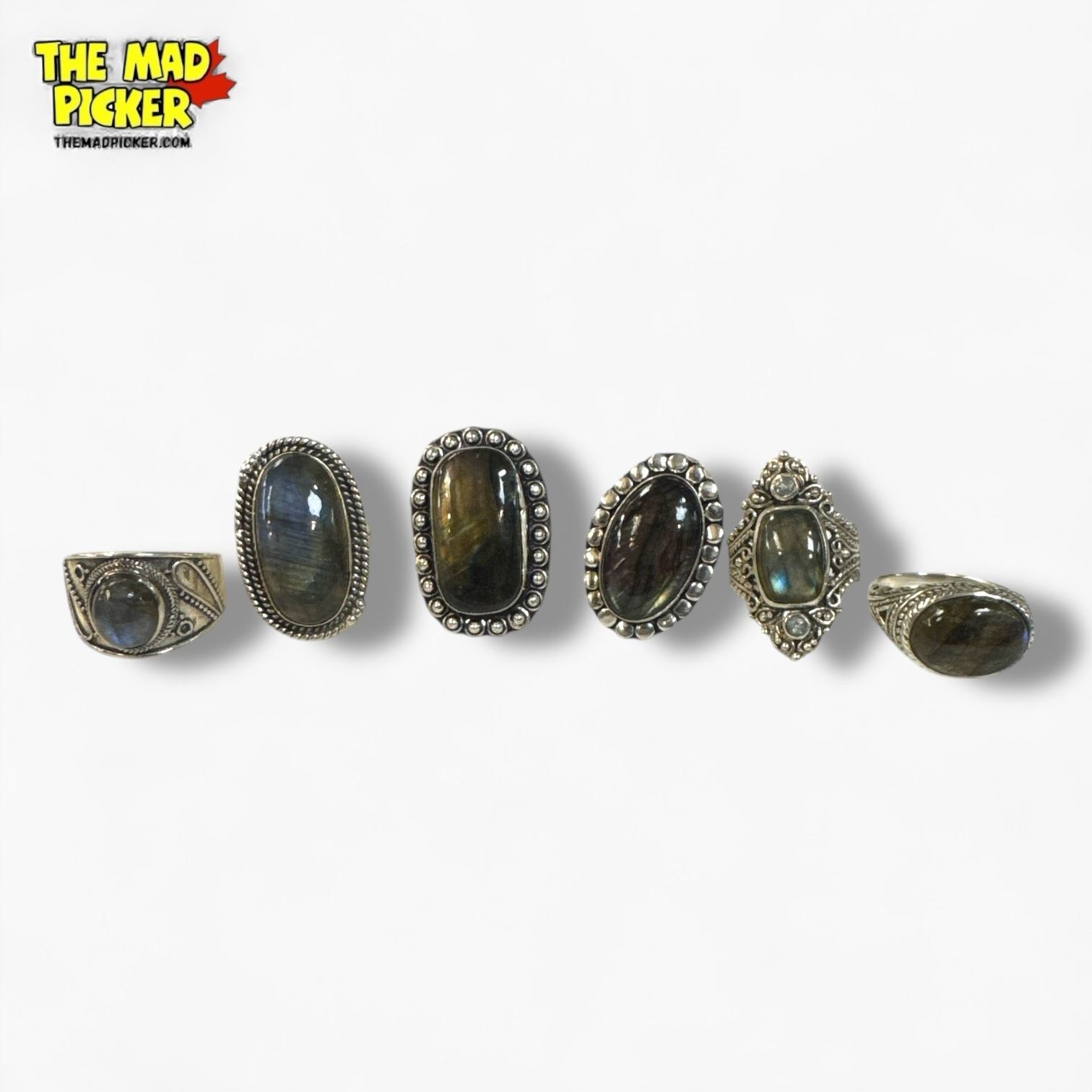 6 New .925 Sterling Silver Polished Labradorite Rings - Longest ring is 32 mm - Total Weight: 54 grams