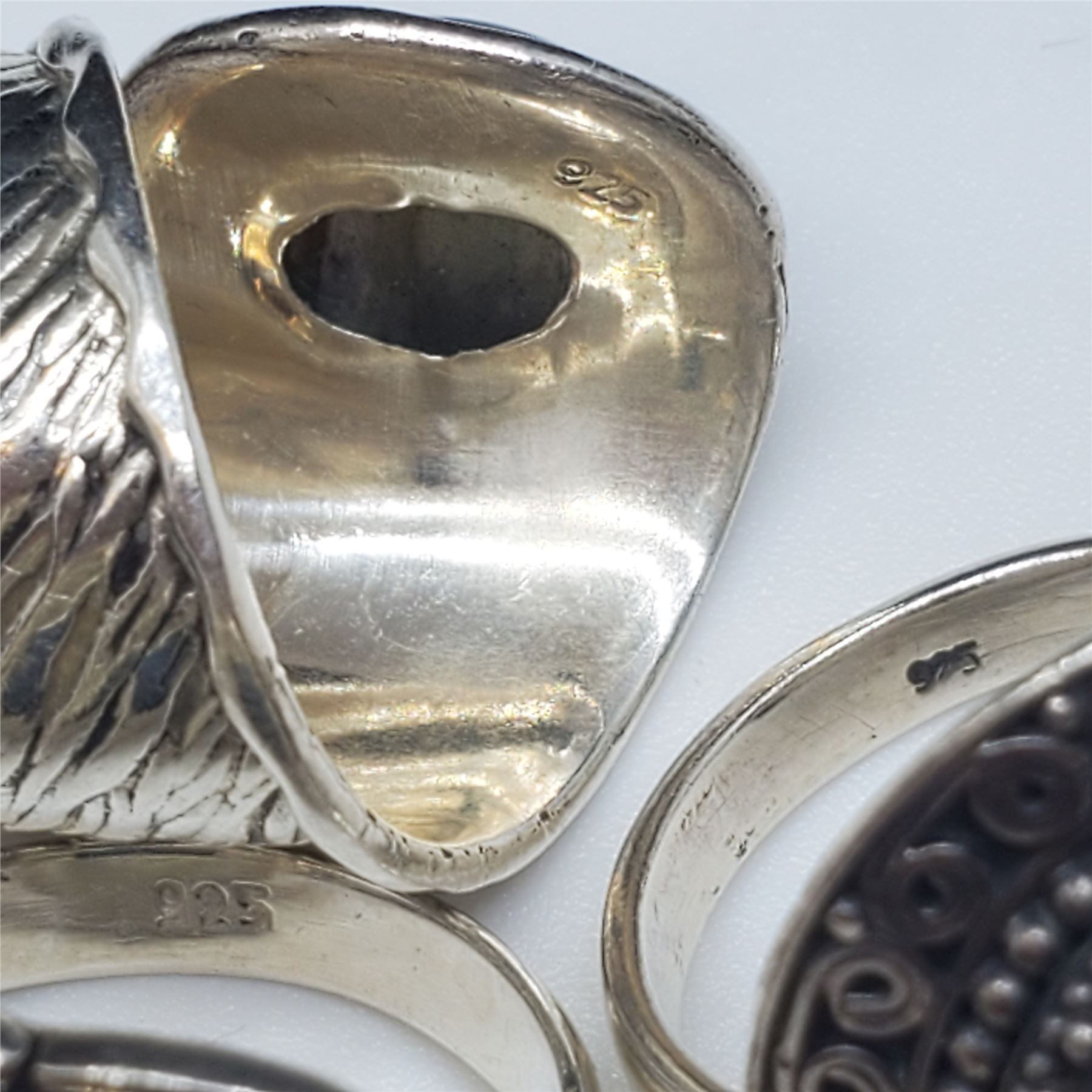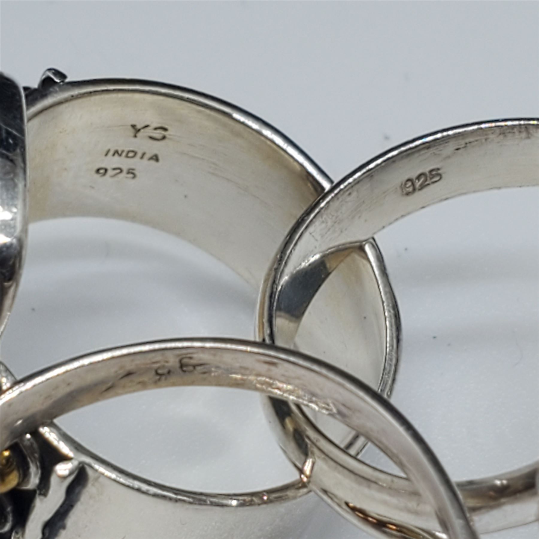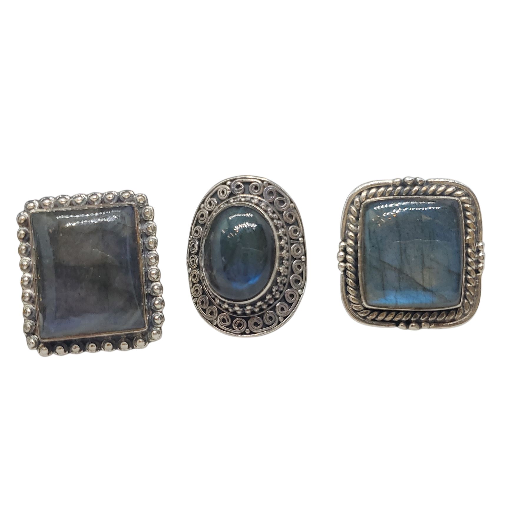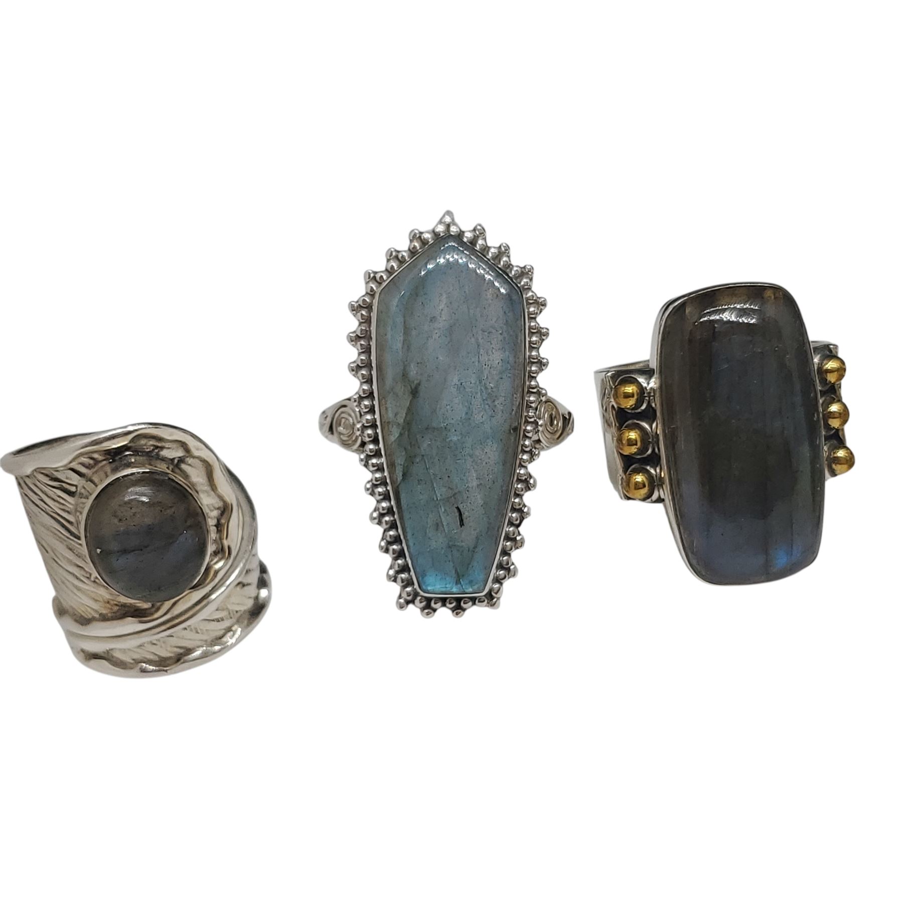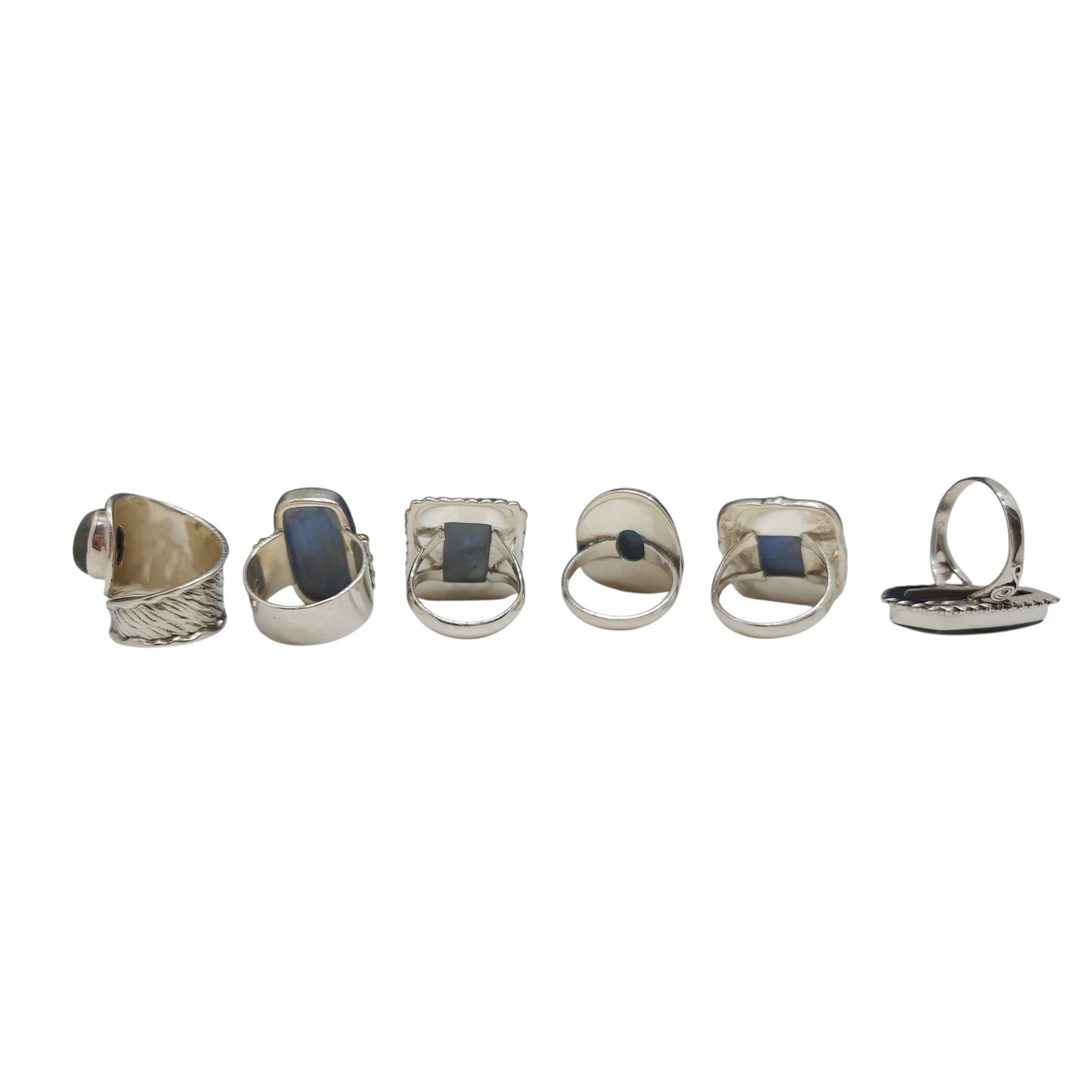 6 New .925 Sterling Silver Polished Labradorite Rings - Longest ring is 33 mm - Total Weight: 54.7 grams