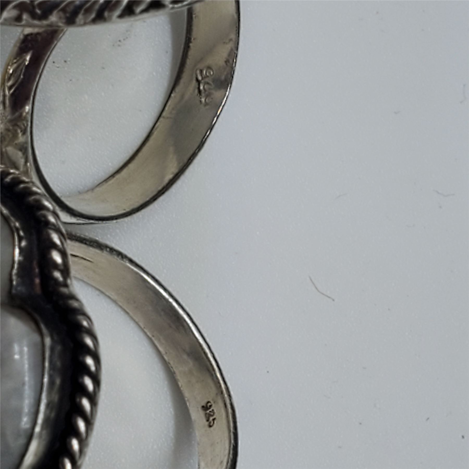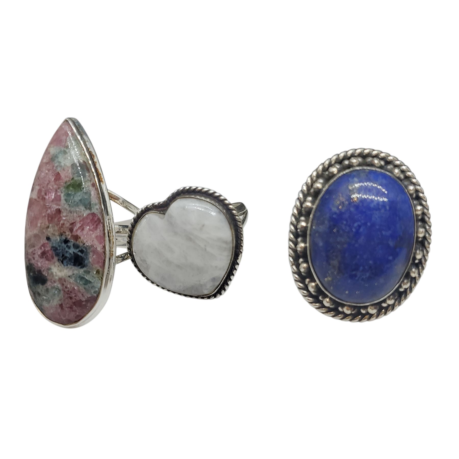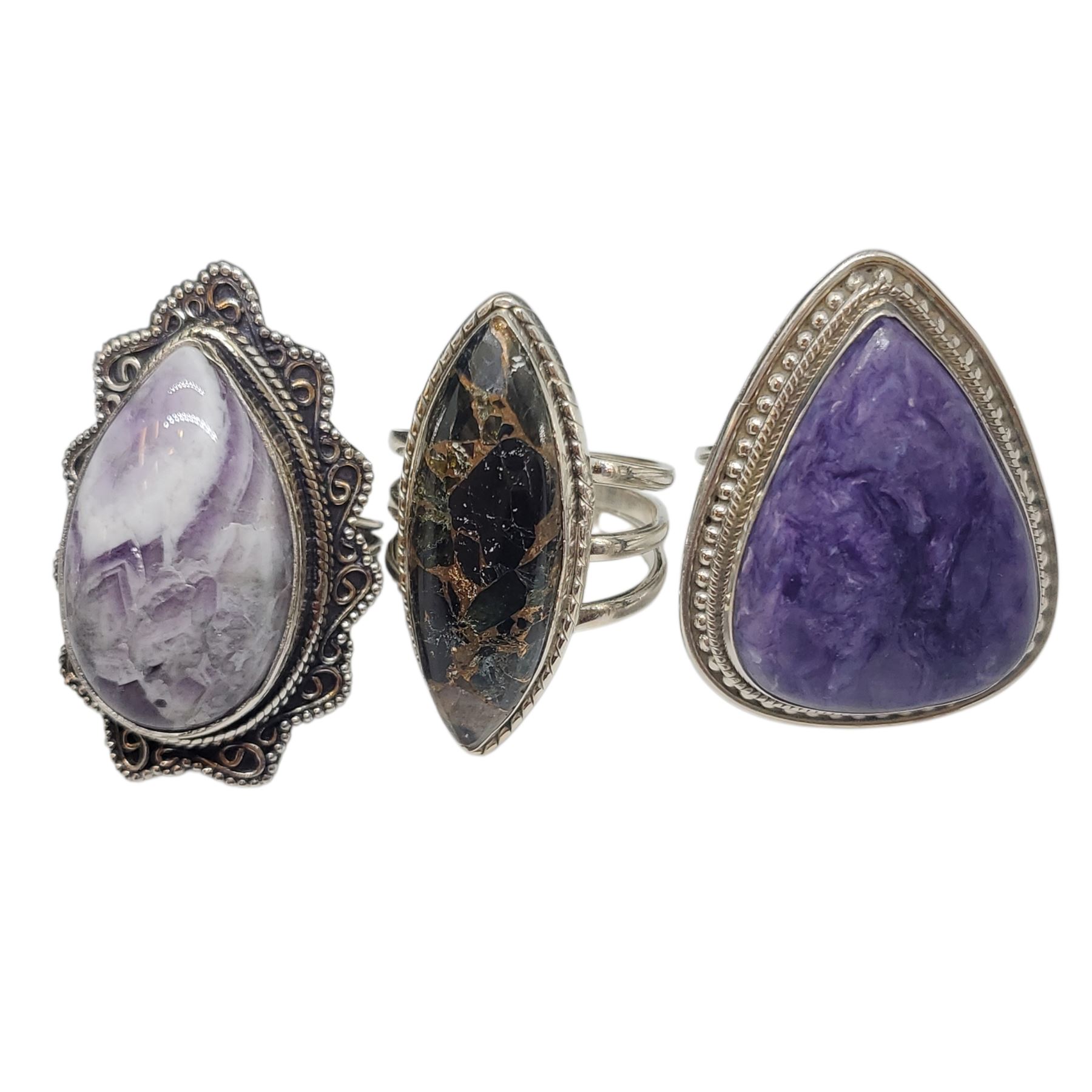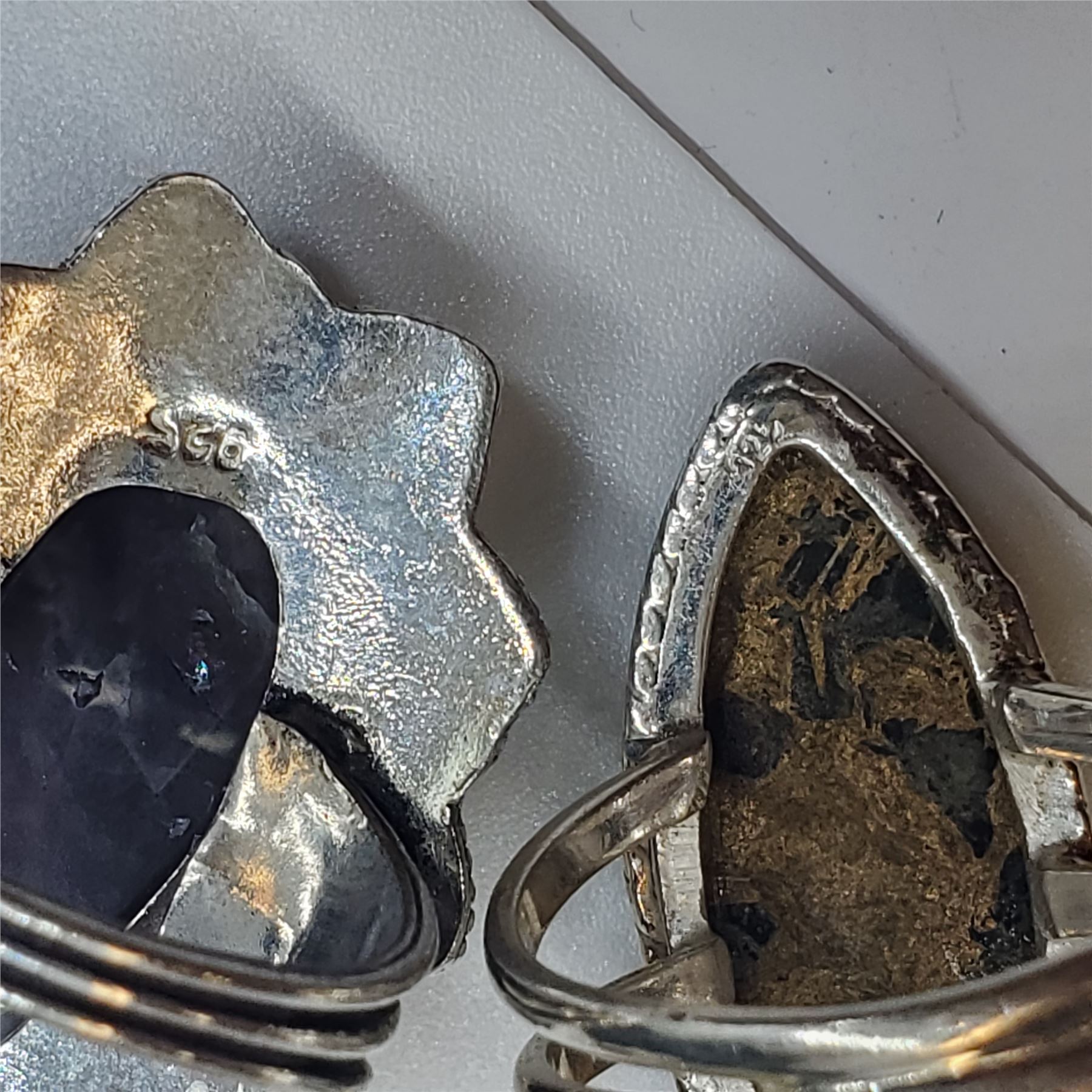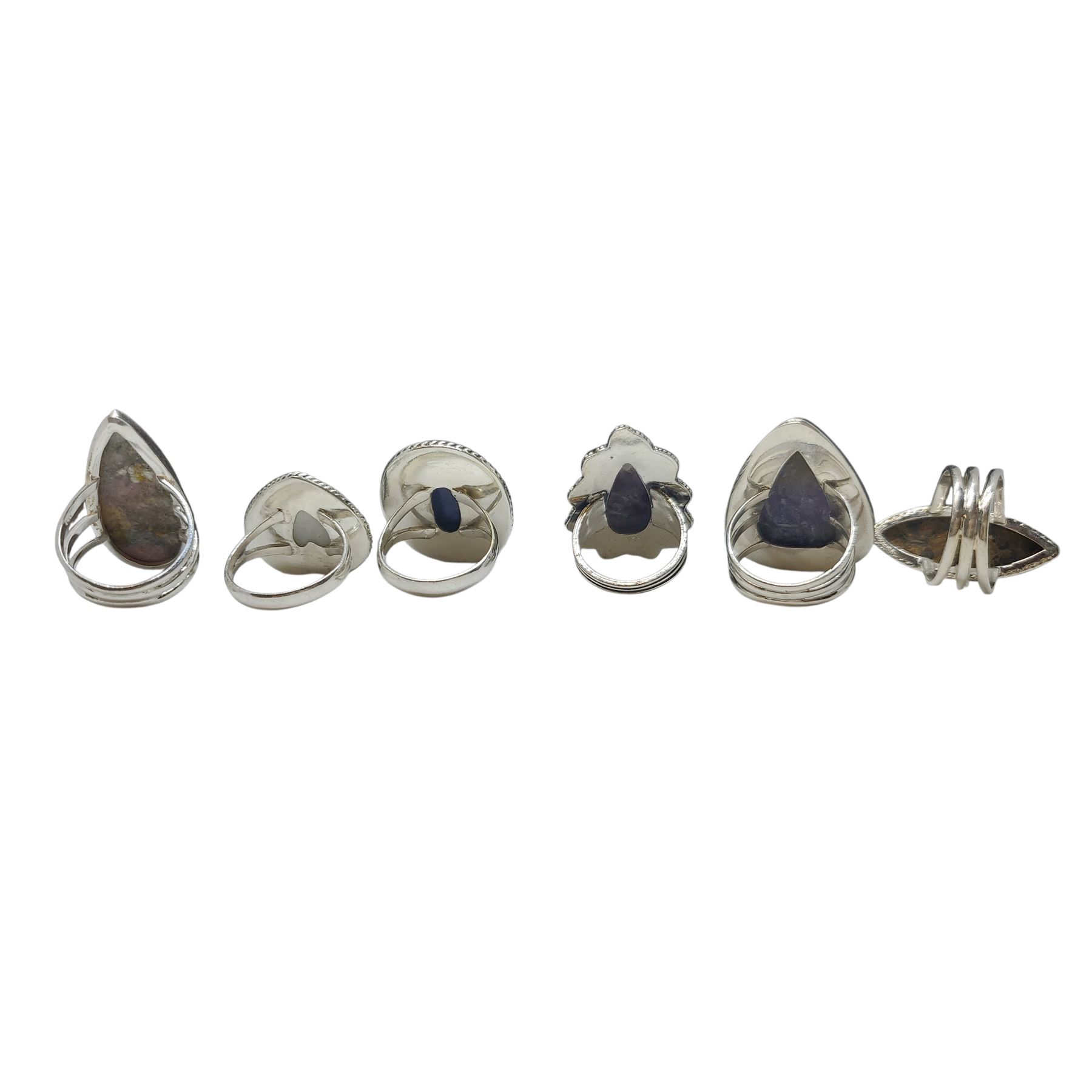 6 New .925 Sterling Silver Polished Natural Stone Rings - Charoite, Black Jack Turquoise, Lapis and more. Longest ring is 40 mm - Total Weight: 69 grams
