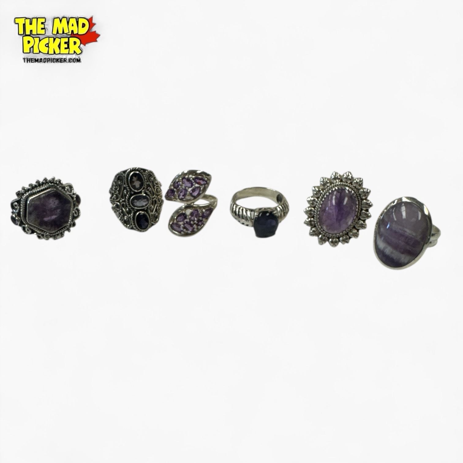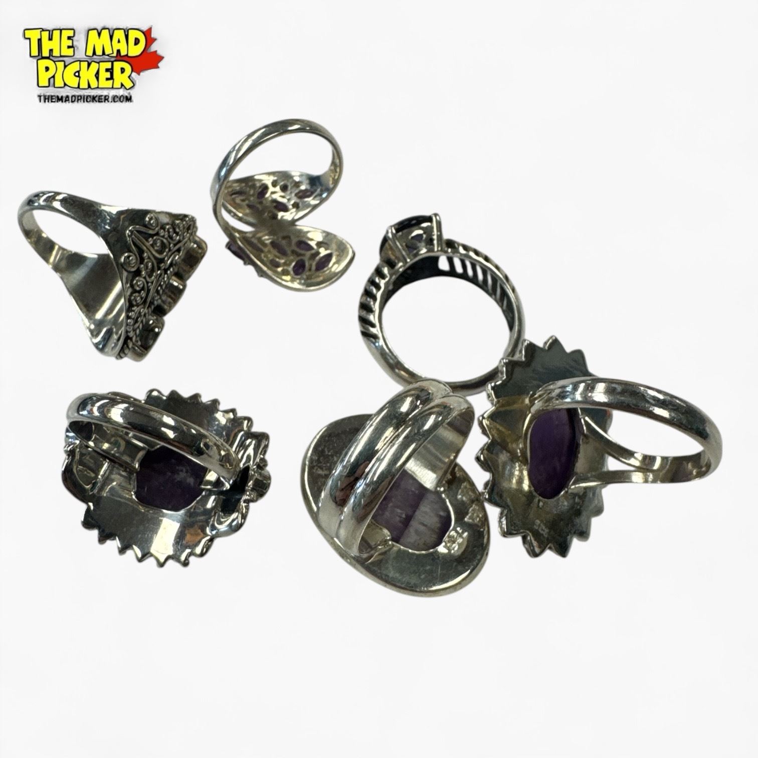 6 New Amethyst Cabochon & Faceted Amethyst Crystal Rings in Silve Settings (all stamped .925) * Total weight: 45.6 grams