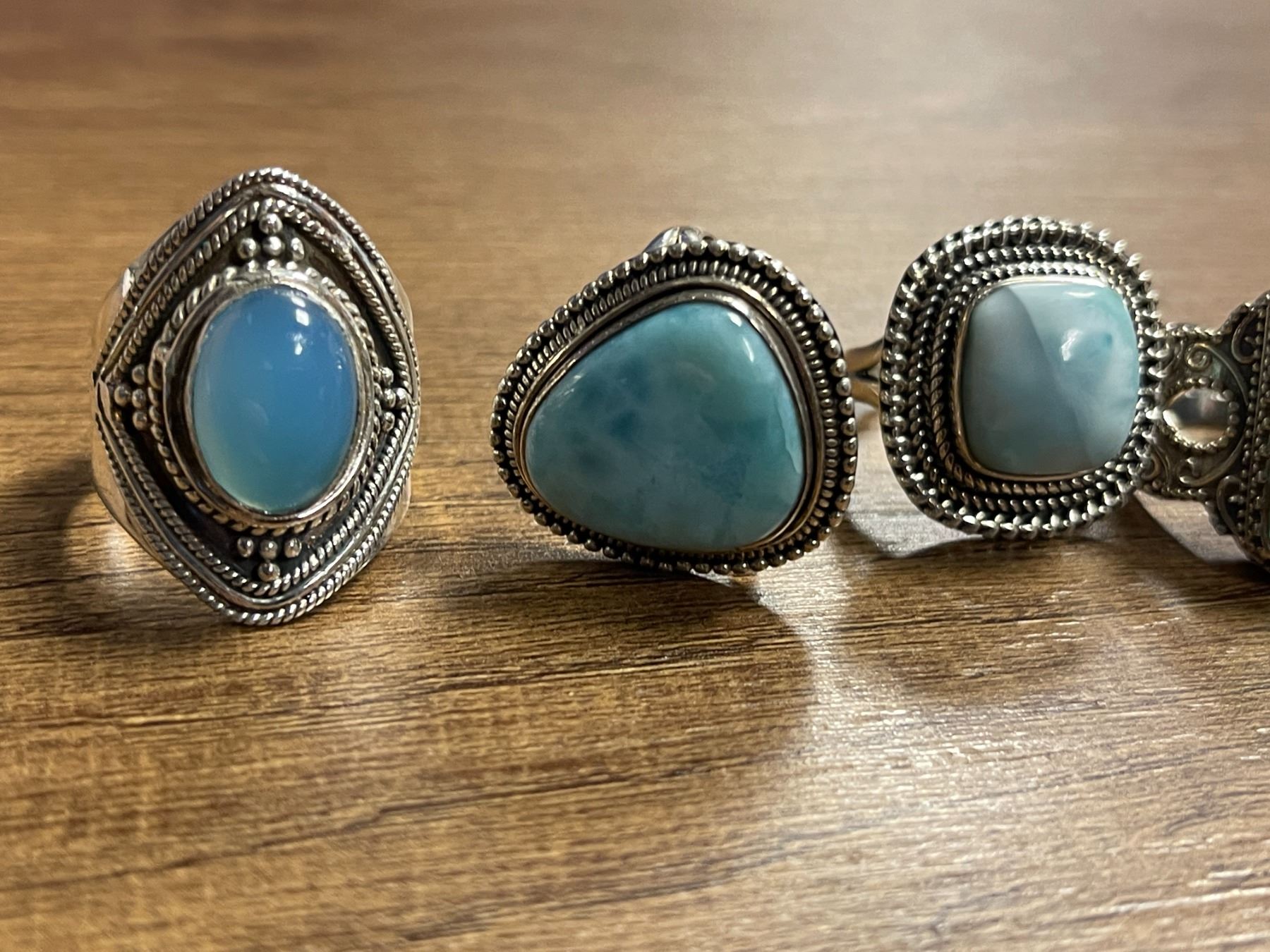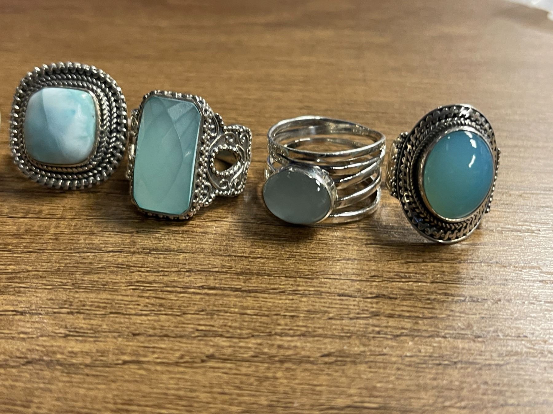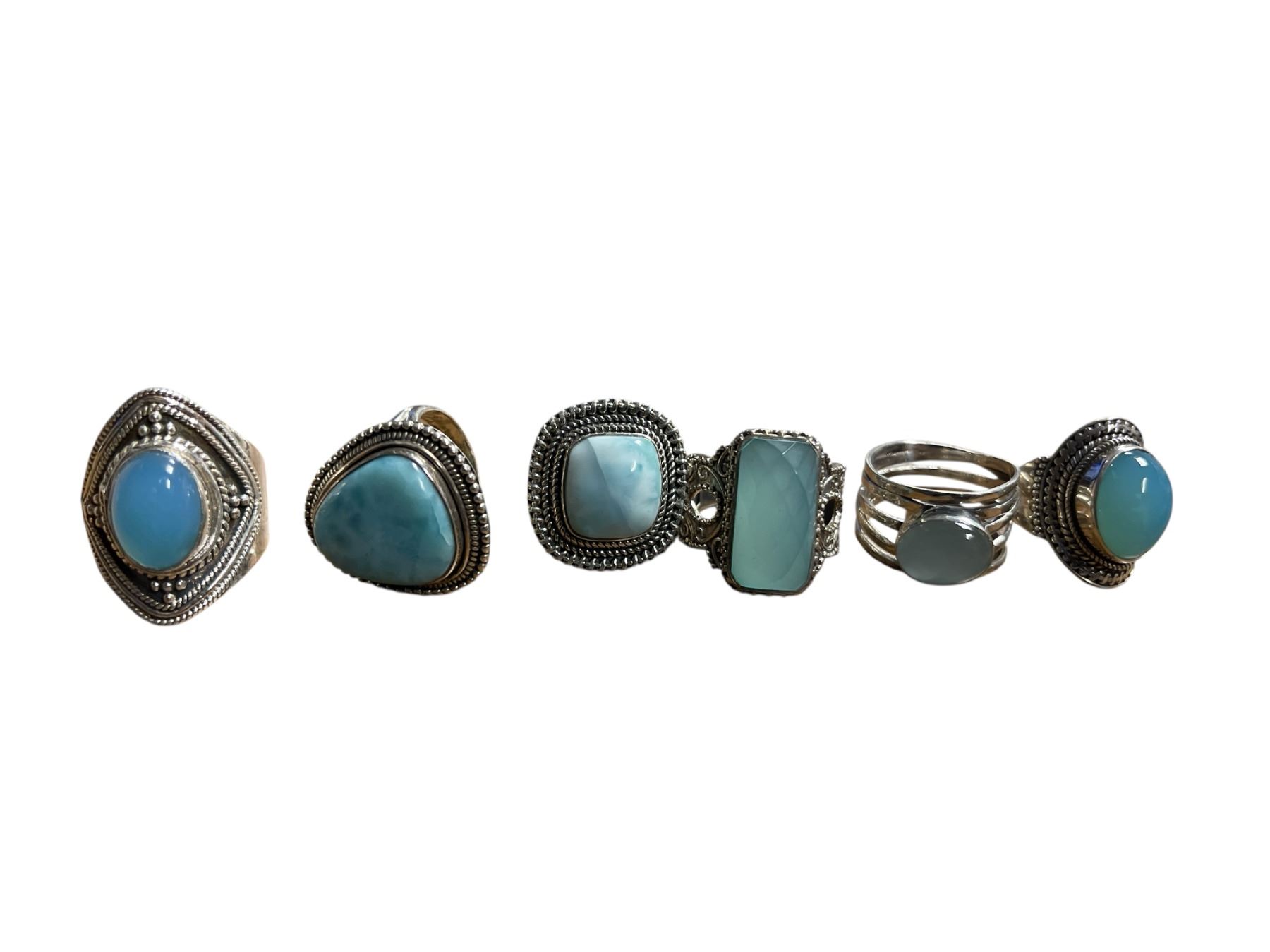 6 New Blue Chalcedony & Larimar Rings in Silver Settings - all stamped .925 (longest ring is 29 mm) Total weight: 55.2 grams