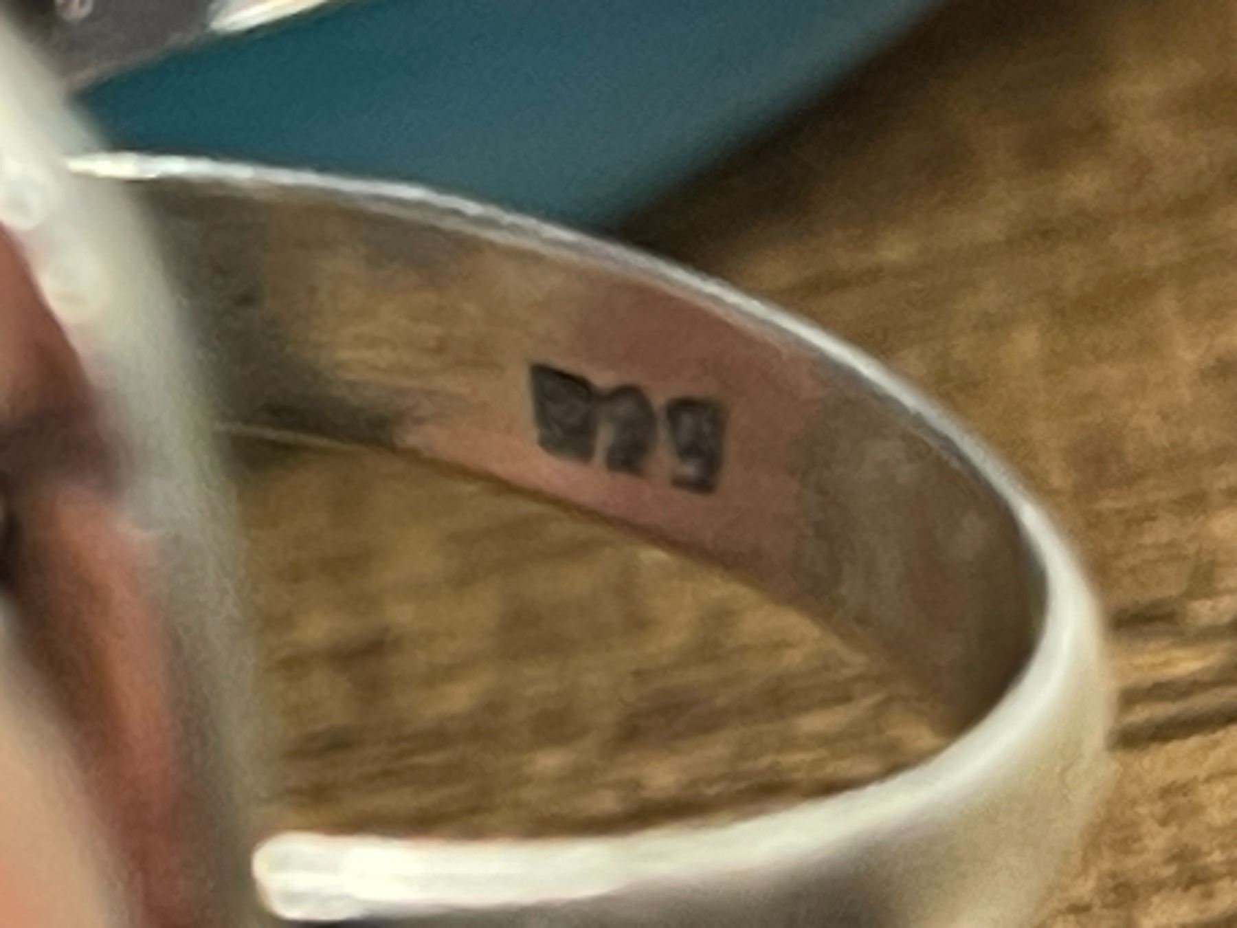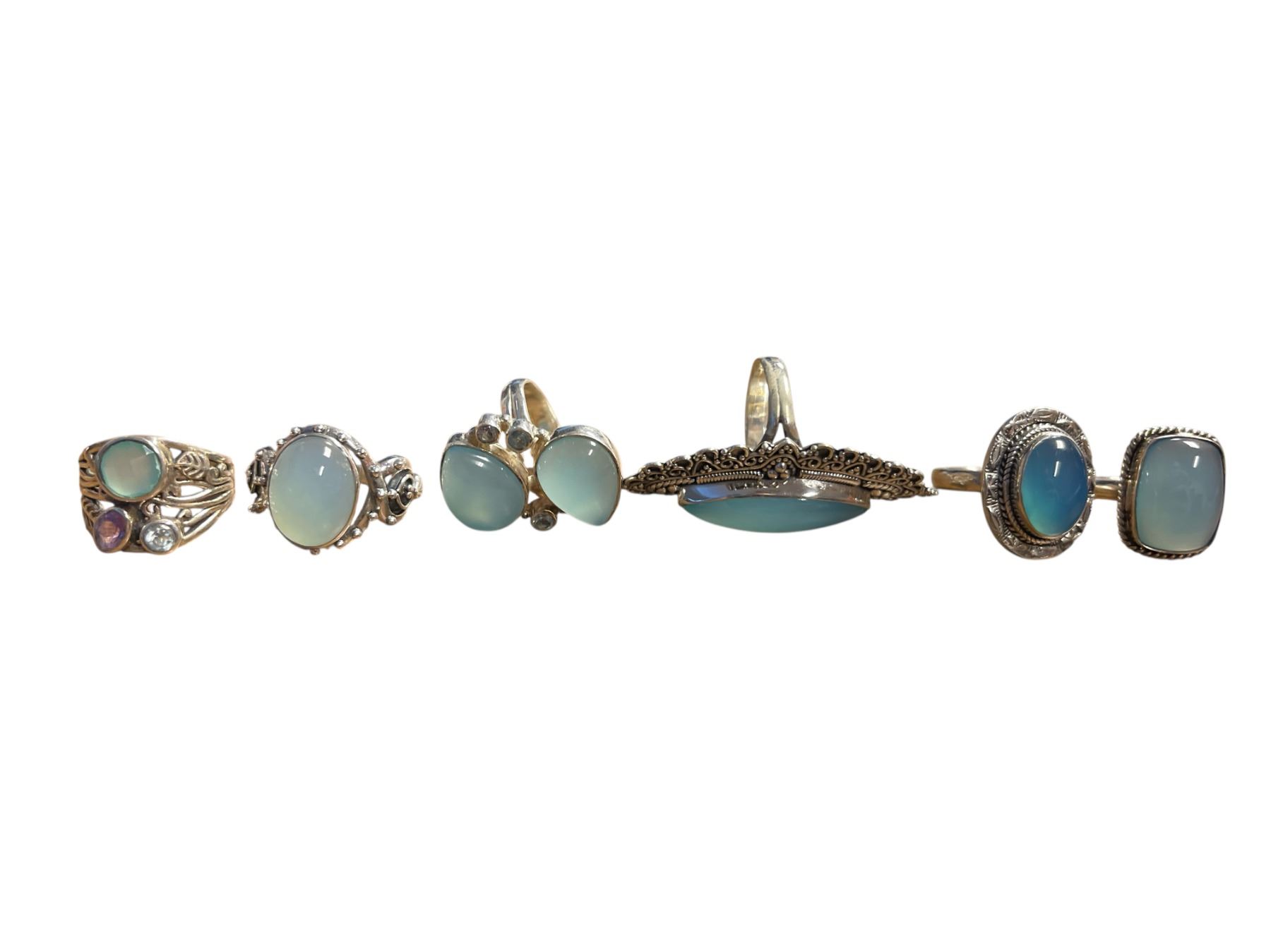 6 New Blue Chalcedony Rings in Silver Settings - all stamped .925 (longest ring is 50 mm) Total weight: 56.4 grams