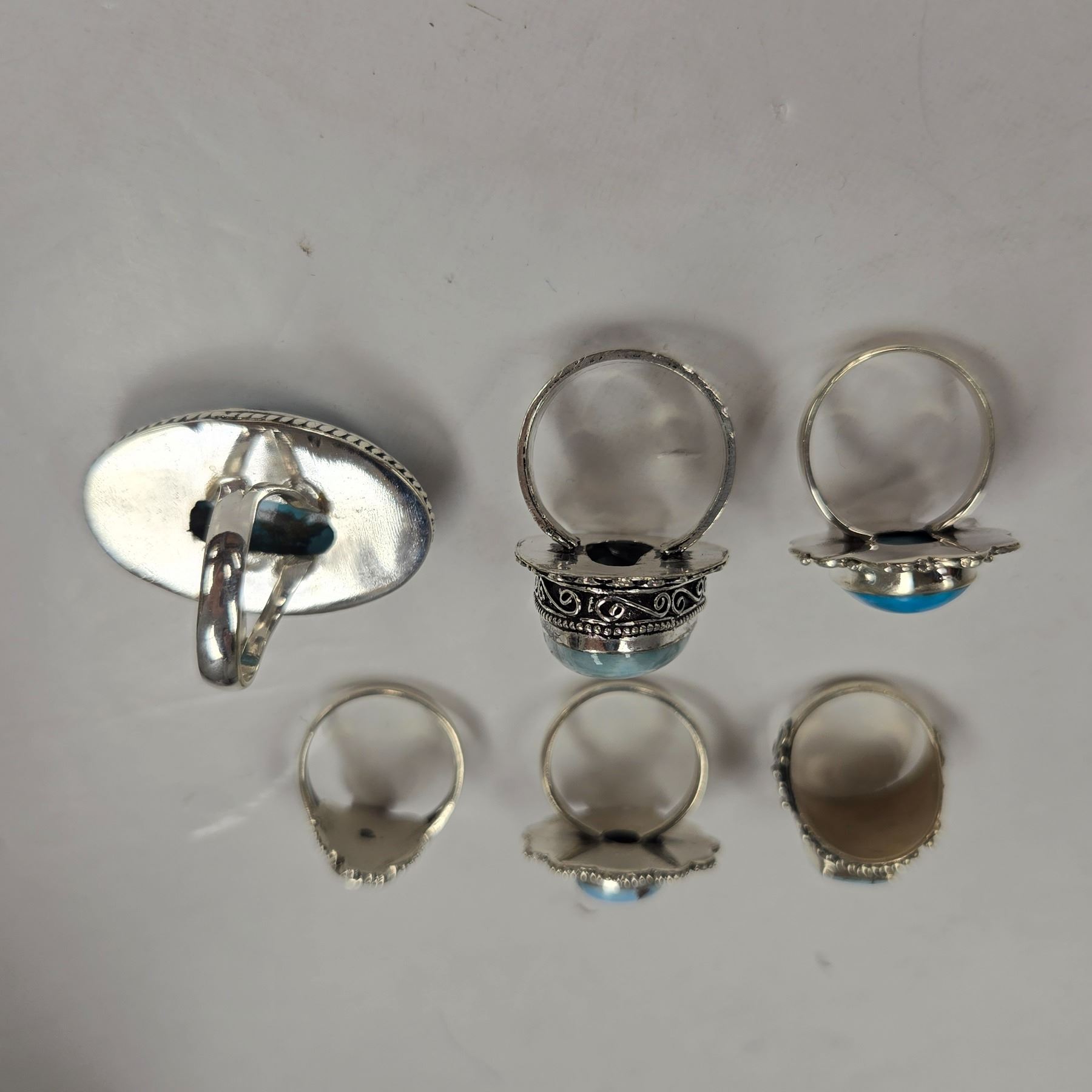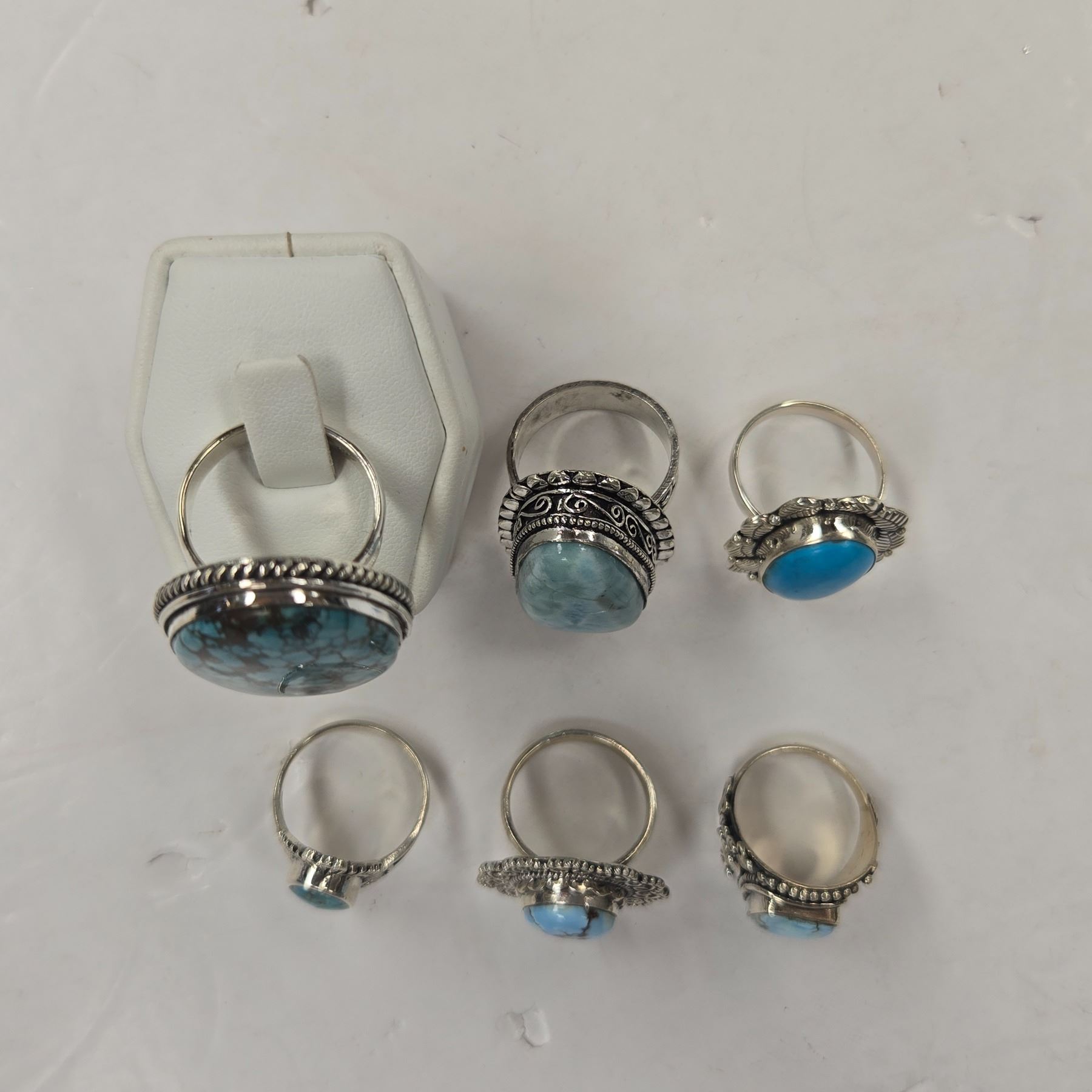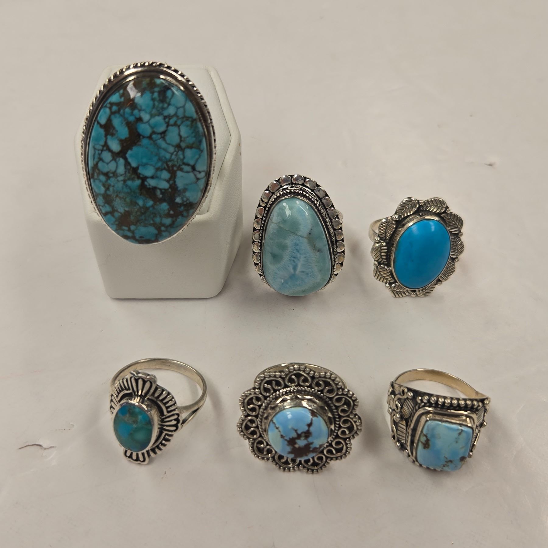 6 New Blue Larimar (Dolphin Stone), Turquoise and Natural Agate Rings in Silver Settings (all stamped .925) Total weight: 66.2 grams