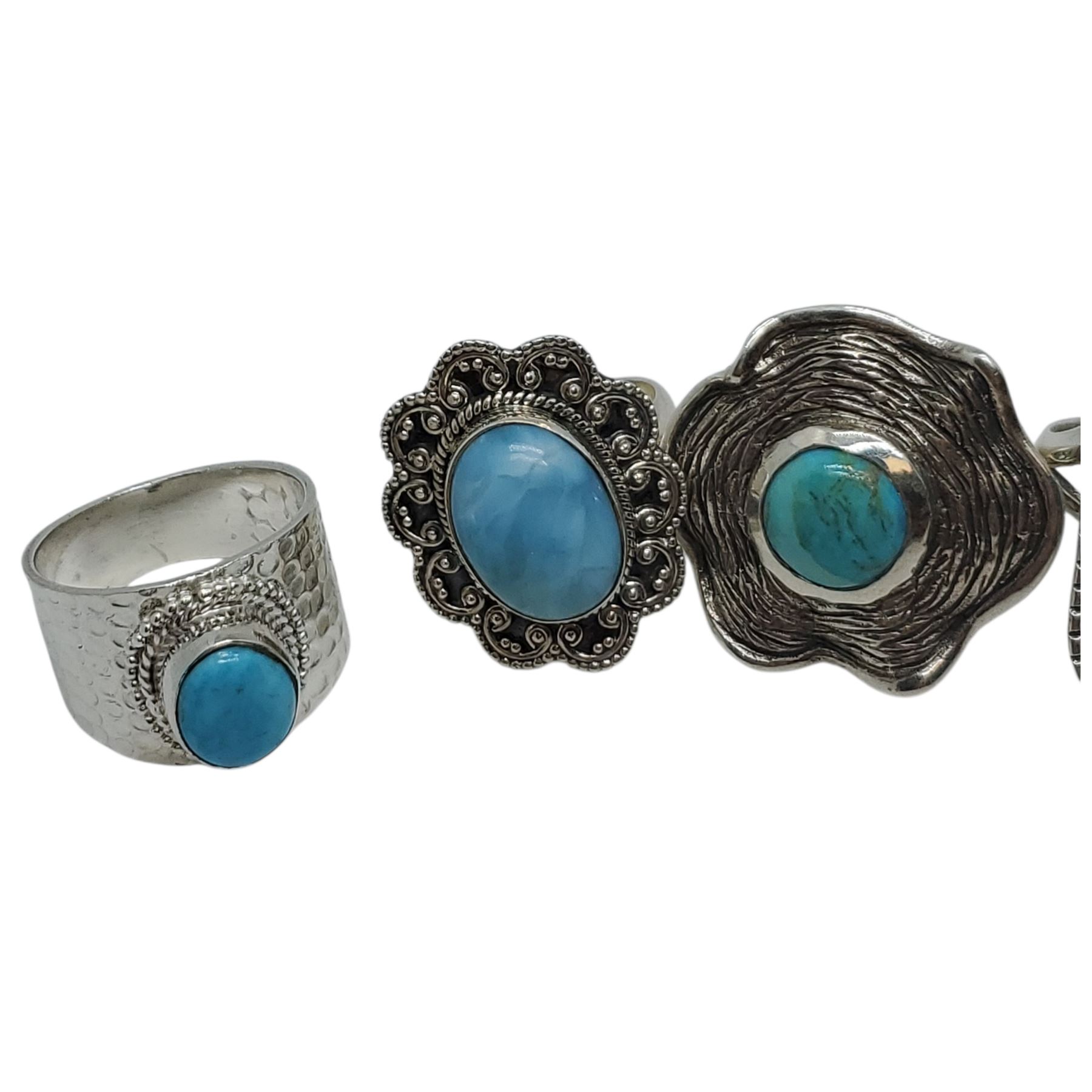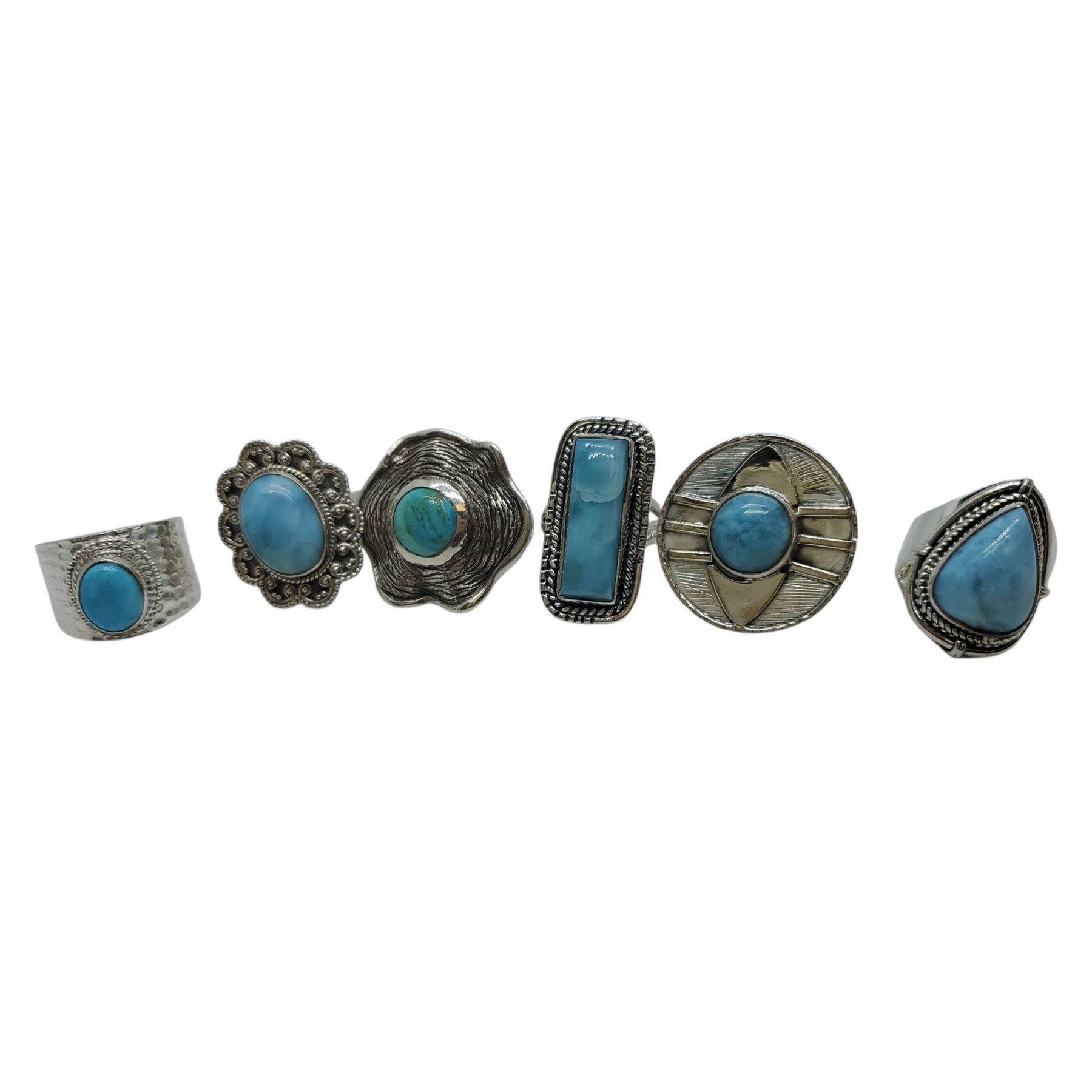 6 New Blue Turquoise & Blue Lace Agate Rings in Silver Settings * all stamped .925 (longest ring is 29 mm) Total weight: 44.8 grams