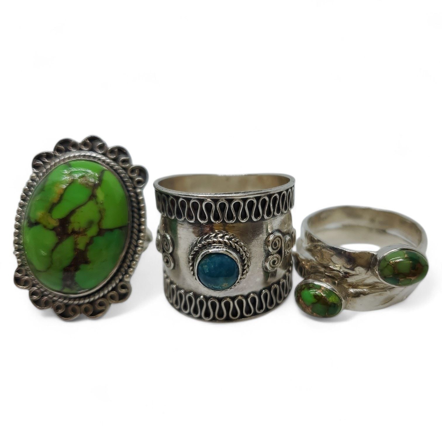 6 New Blue Turquoise & Green Copper Turquoise Rings in Silver Settings * all stamped .925 (longest ring is 26 mm) * Total weight: 43.1 grams