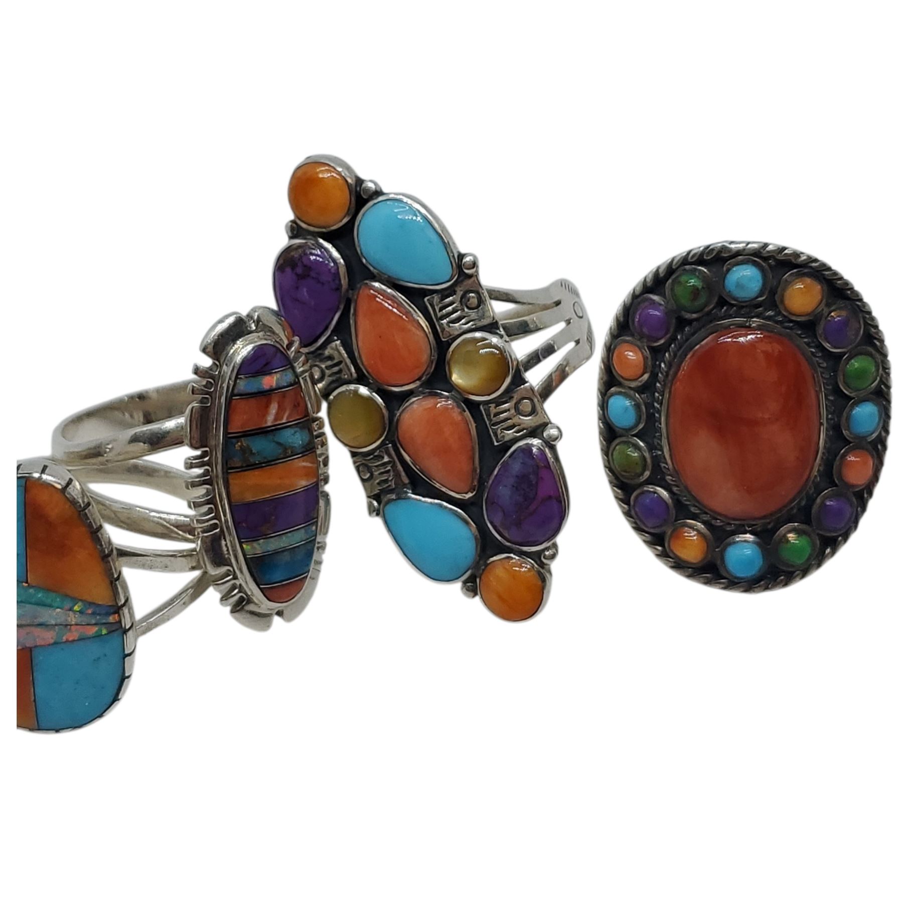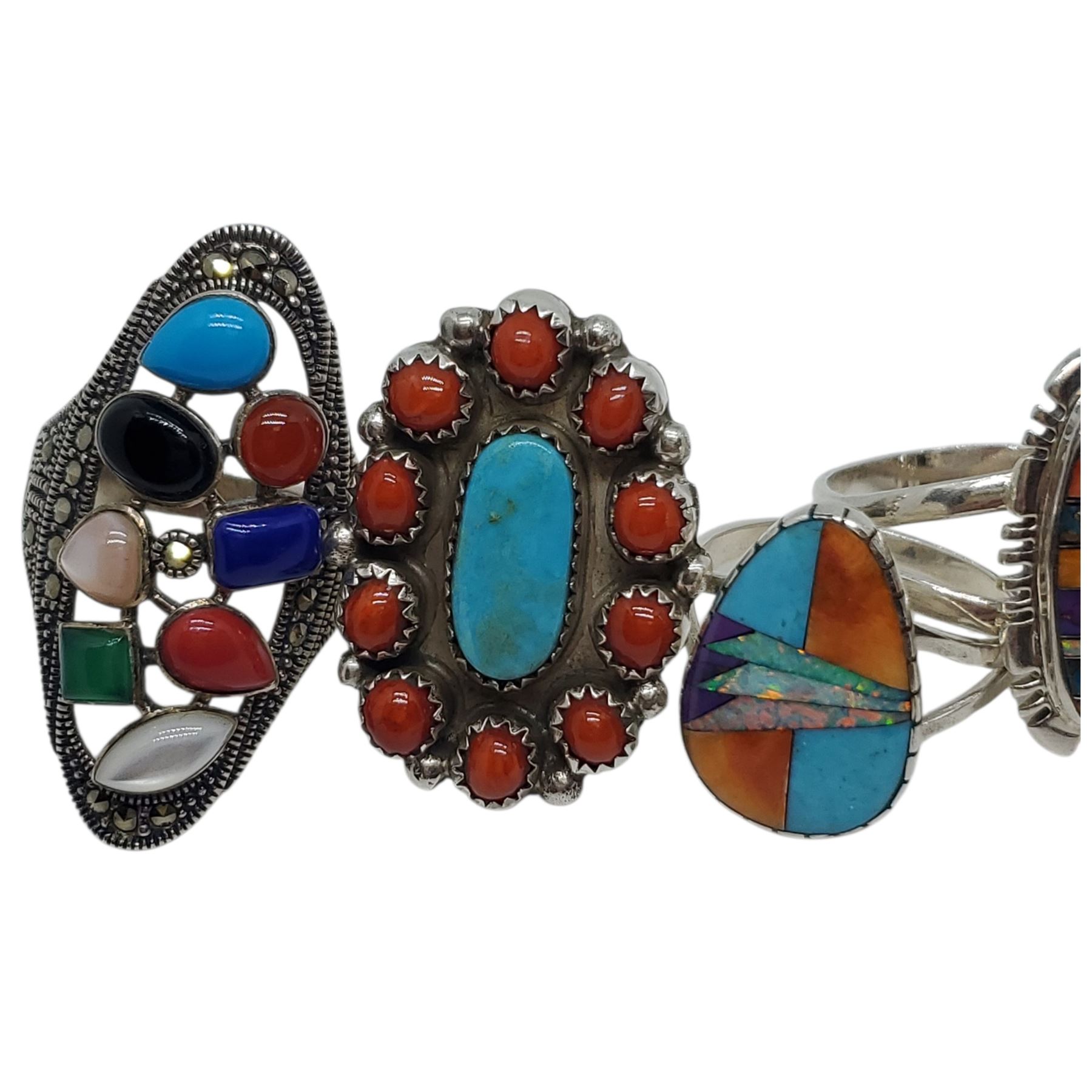 6 New Colourful Inlaid & Multi-gemstone Rings in Silver Settings * all stamped .925 (longest ring is 39 mm) Total weight: 42.6 grams