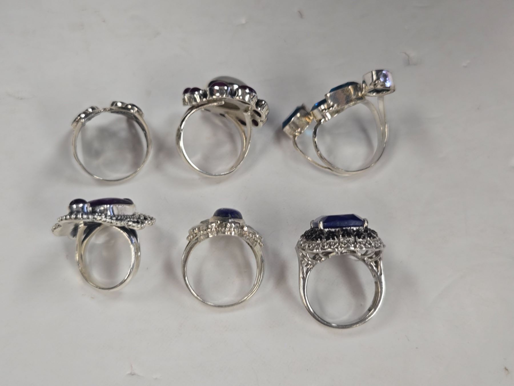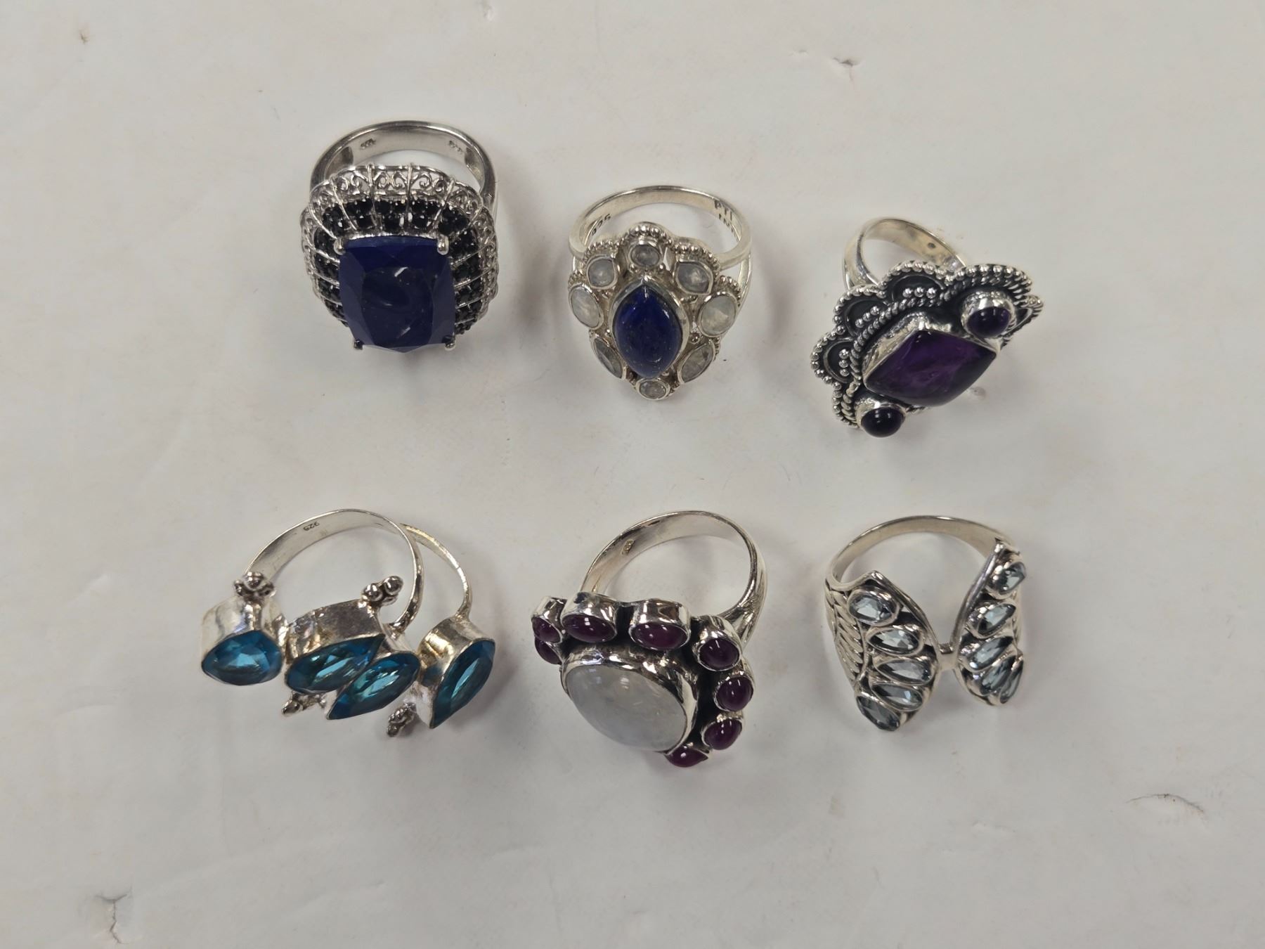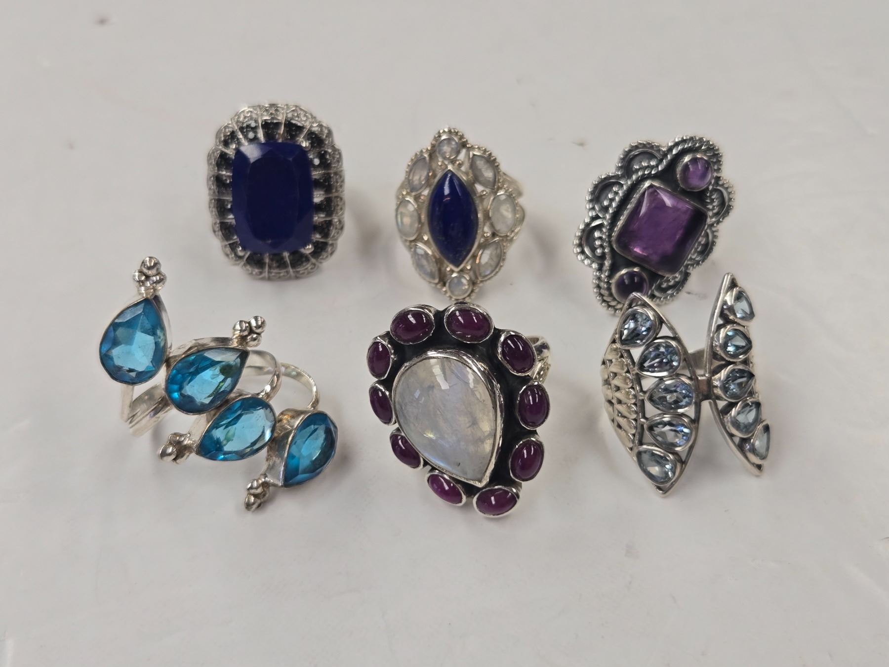 6 New Crystal & Quartz Rings in Silver Settings - all stamped .925 (Blue Topaz Crystal, Amethyst, Garnet with Moonstone & Kyanite ) Total weight: 60.0 grams