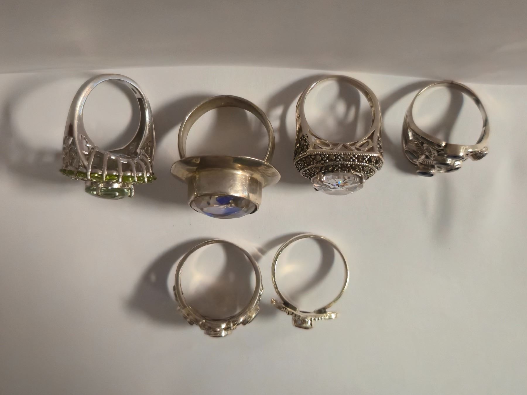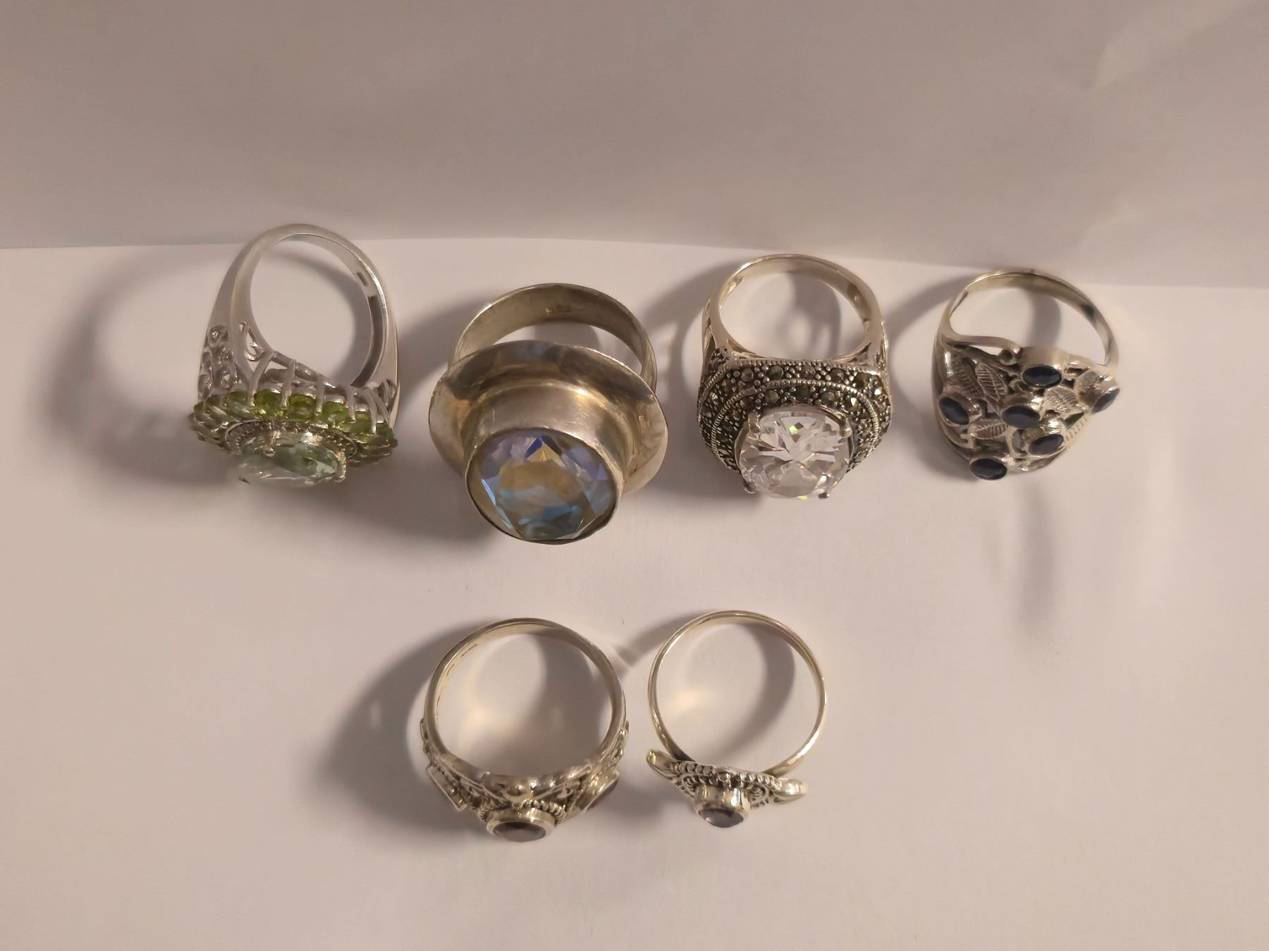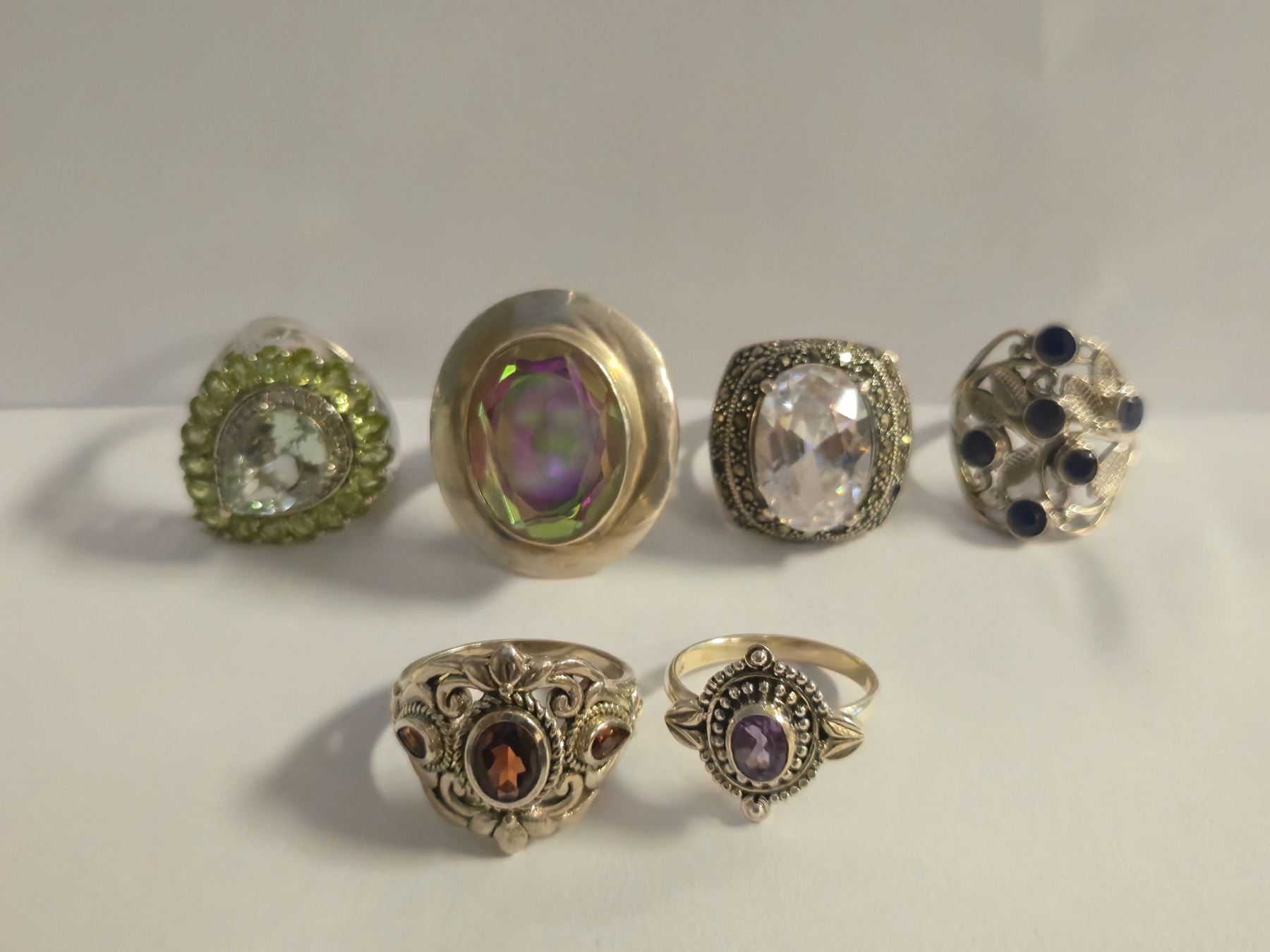 6 New Faceted Crystal & Quartz Crystal Rings in Silver Settings - all stamped .925 (longest ring is 30 mm) Total weight: 52.5 grams