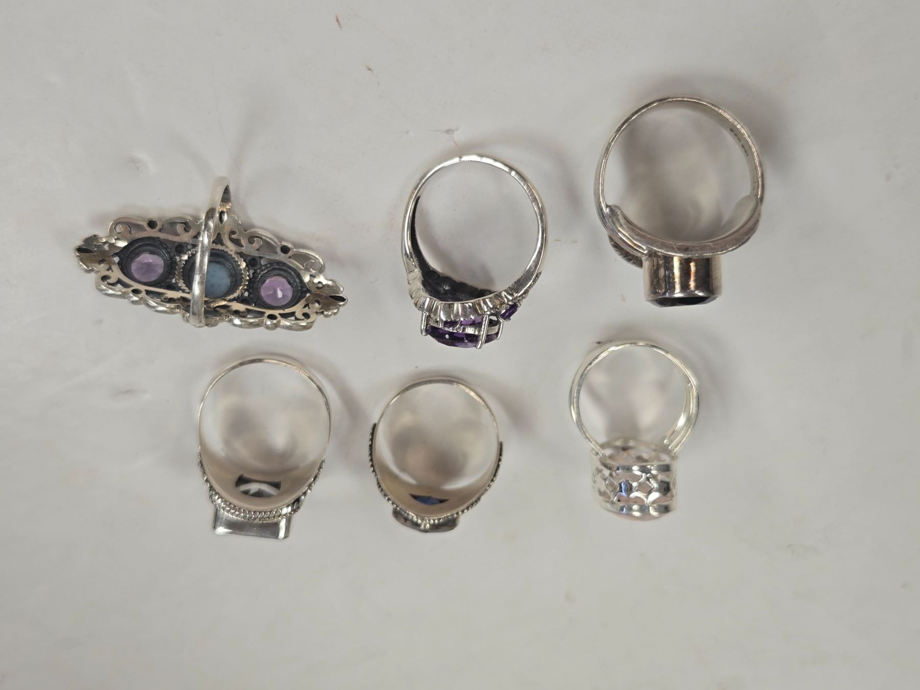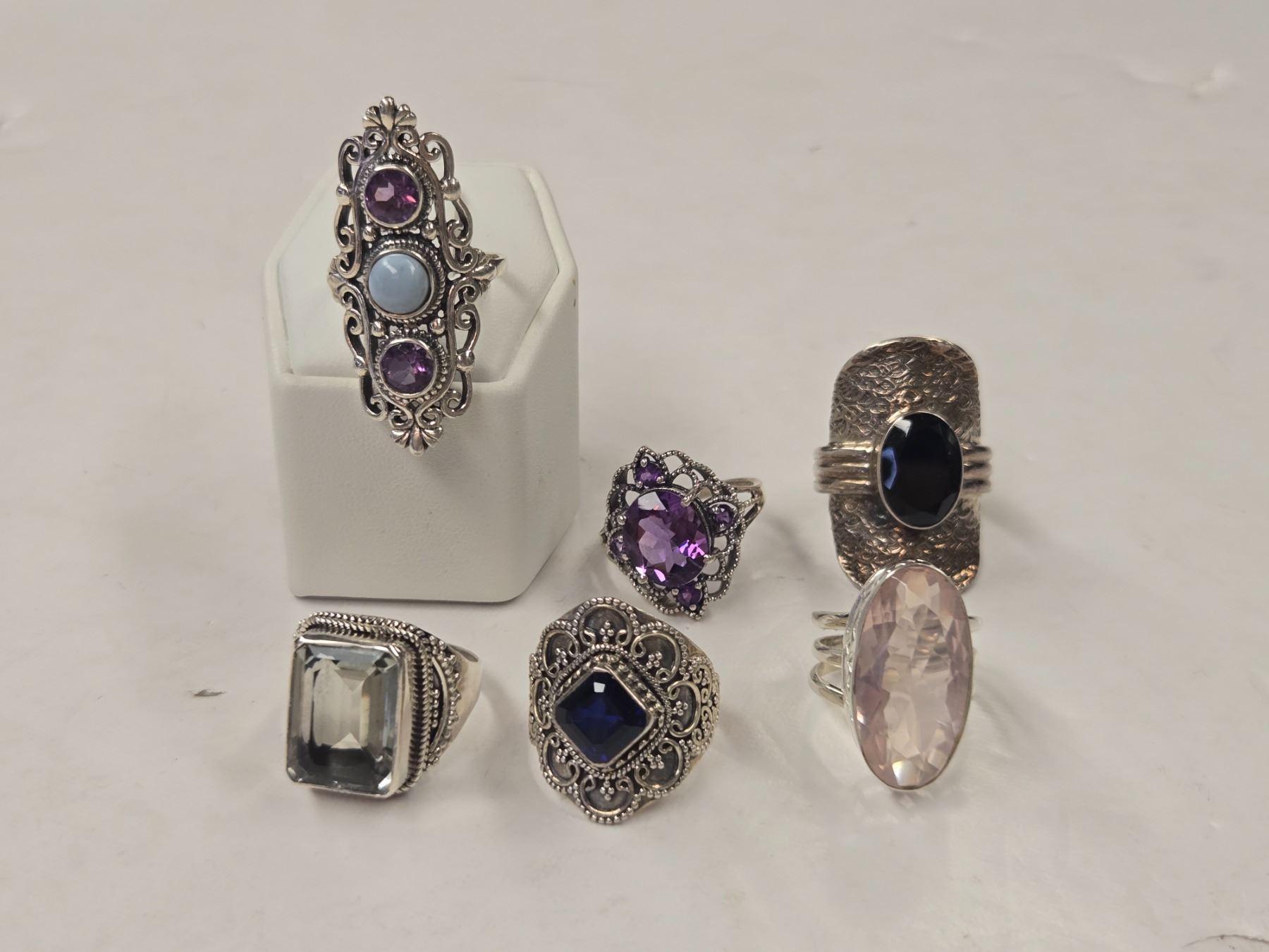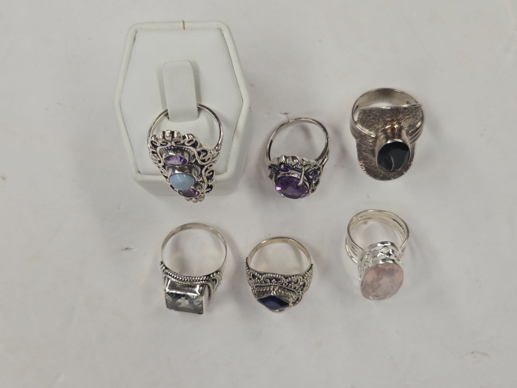 6 New Faceted Crystal & Quartz Rings in Silver Settings - all stamped .925 (Amethyst, Peridot, Hematite, and Rose Quartz) Total weight: 46.8 grams