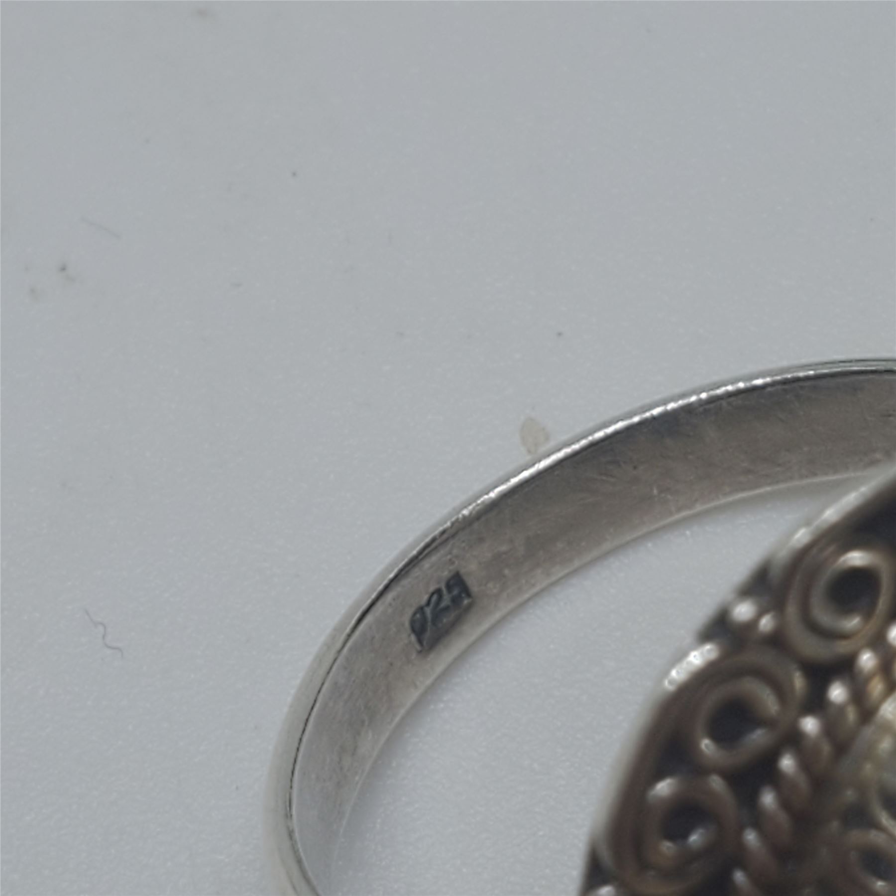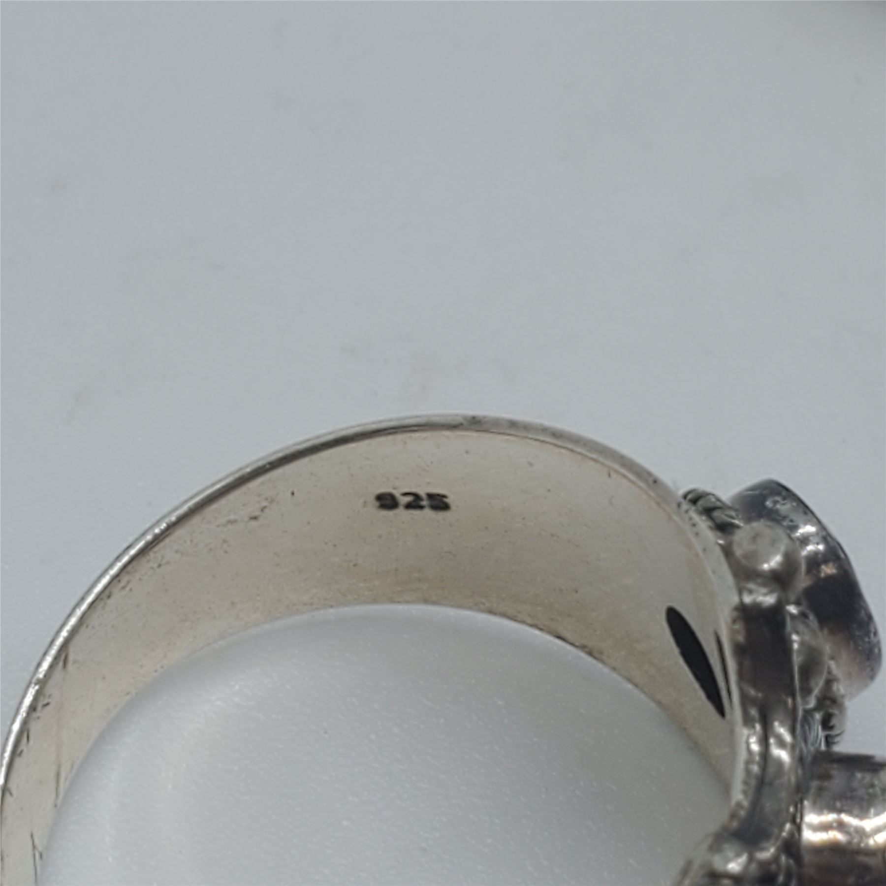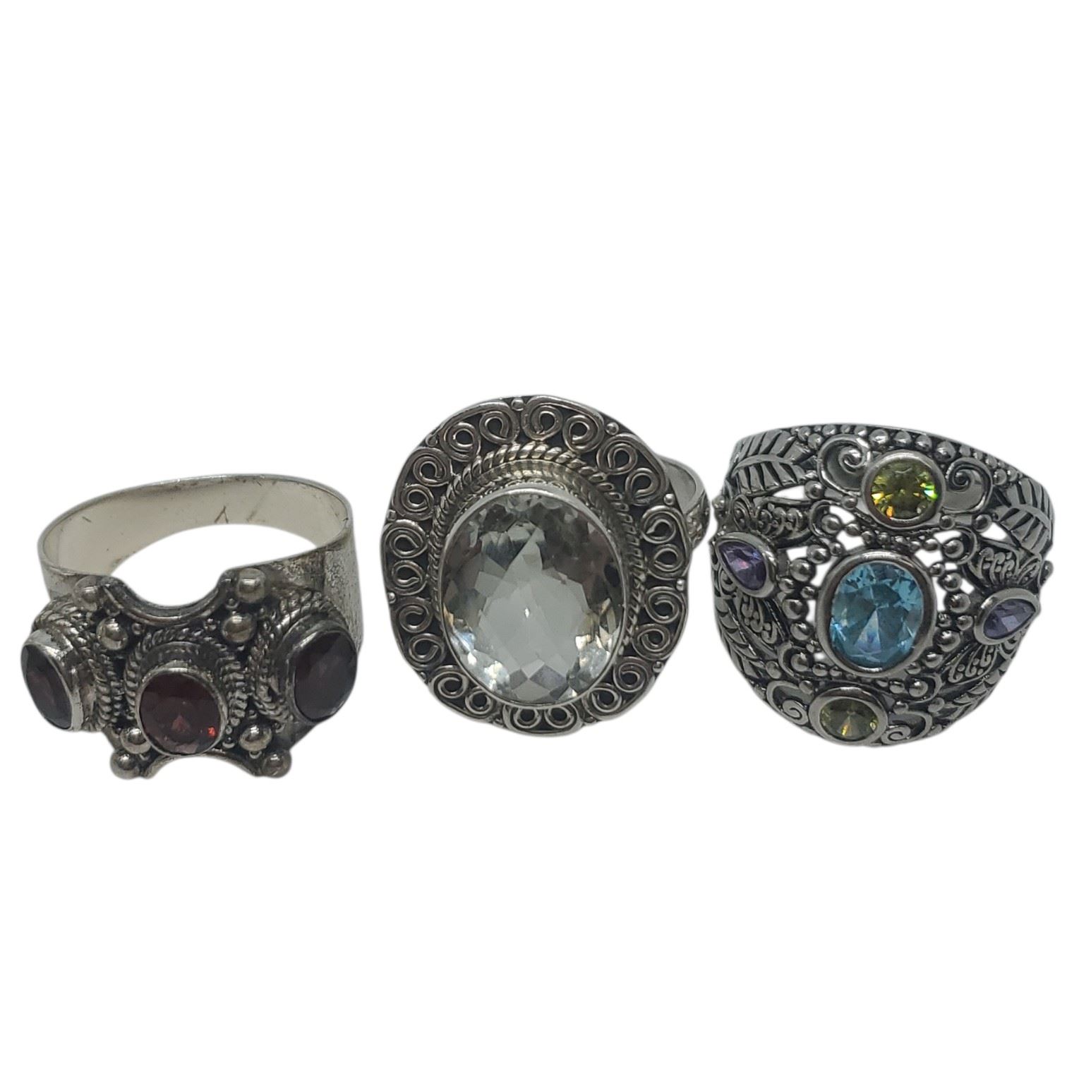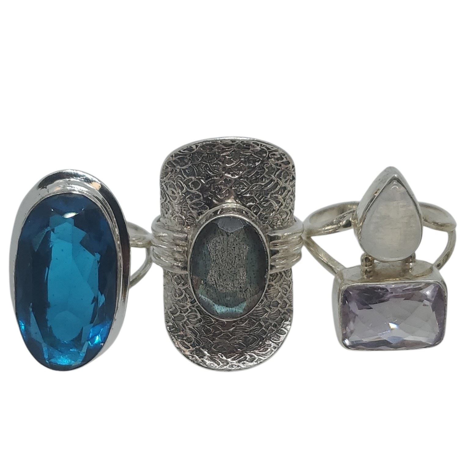 6 New Faceted Crystal and Quartz Crystal Rings in Silver Settings * all stamped .925 (Garnet, Topaz and Aquamarine) (longest ring is 34 mm) * Total weight: 51.2 grams