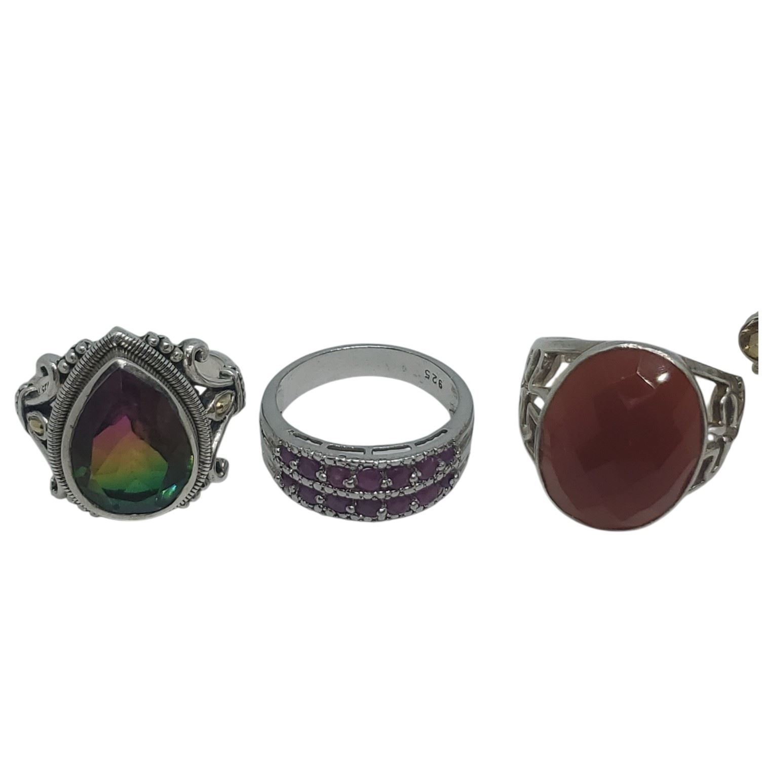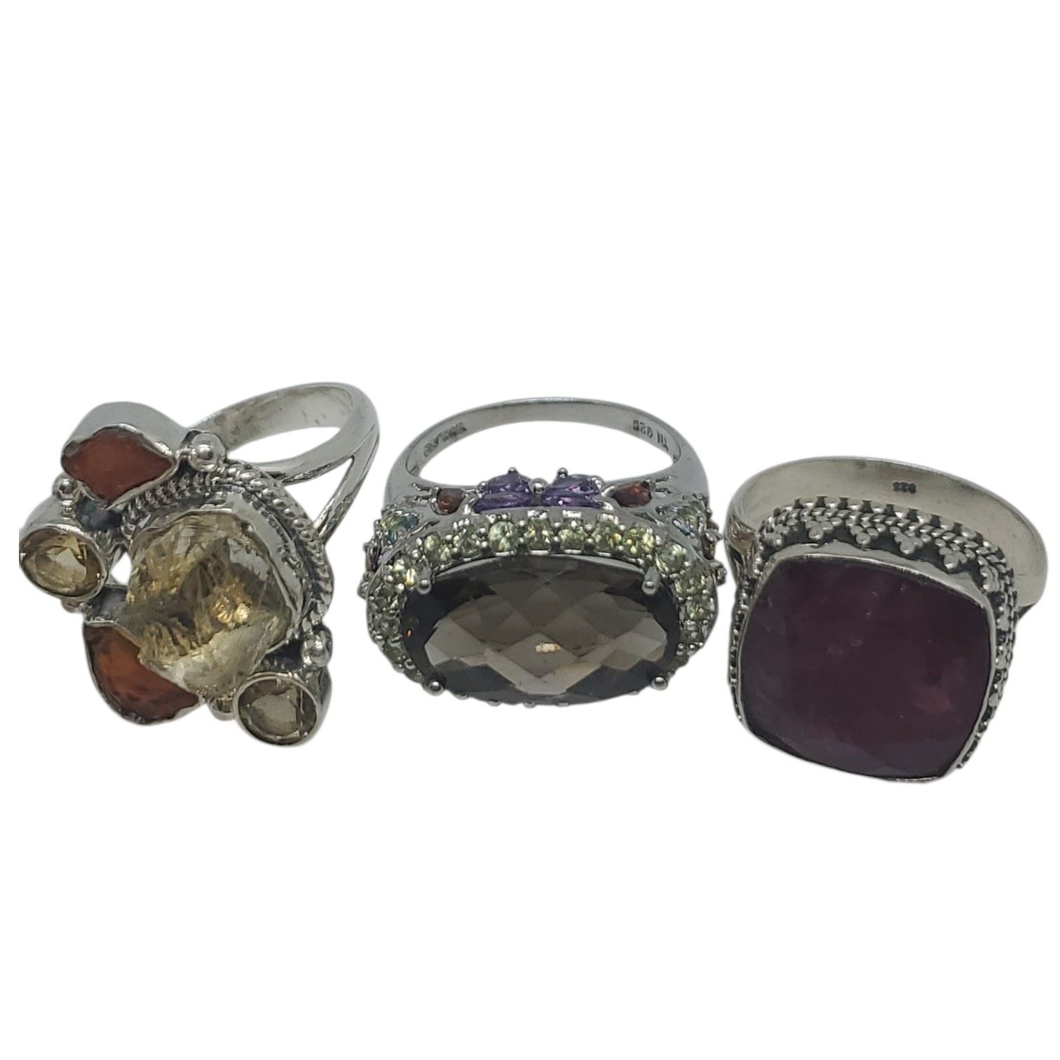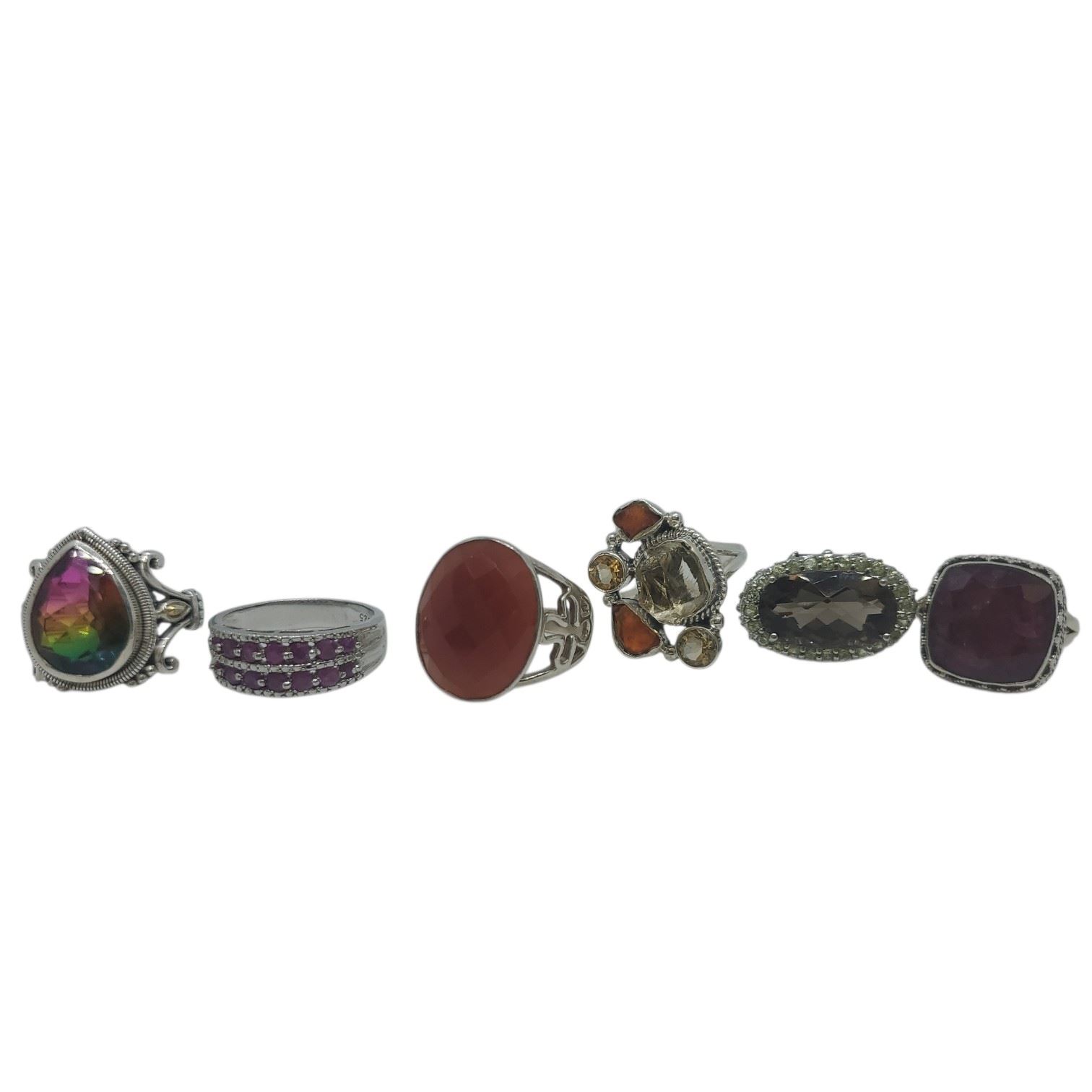 6 New Faceted Crystal and Quartz Crystal Rings in Silver Settings * all stamped .925 (Garnet, Topaz, Citrine, Mystic Topaz and Aquamarine) (longest ring is 34 mm) * Total weight: 43.5 grams
